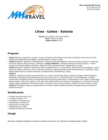 Biuro podróży MM Travel Al. 23 Stycznia 18 86-300 Grudziądz Litwa - Łotwa - Estonia Termin: Do ustalenia, wycieczka dniowa. Cena: 1200 zł za osobę Numer oferty: 47/15 Program: ● ● ● ● ● Dzień 1Zbiórka uczestników i wyjazd z Tczewa. Przejazd do Górę Krzyży koło Szawli. Zwiedzanie Sanktuarium krzyża, Przejazd na obiadokolacje do Kłajpedy, zakwaterowanie w hotelu, nocleg. Dzień 2Śniadanie, Spotkanie z przewodnikiem. Zwiedzanie Starówki Kłajpedy. Przemieszczenie się promem na Mierzeję Kurońską. Wizyta w Muzeum Morza i Delfinarium (pokaz delfinow). Zwiedzanie Mierzei Kurońskiej: Wydmy – Sahara Litewska, Park Rzeźb (Wzgórze Wiedźm), Miasteczko Nida, Skansen Rybacki, obiadokolacja i nocleg. Dzień 3Śniadanie. Wyjazd na Zwiedzanie Rygi z przewodnikiem m.in.: Stare Miasto, Dom Bractwa Czarnogłowych, ratusz, kościół św. Jakuba, kościół św. Piotra, budynek parlamentu, zespół średniowiecznych kamieniczek tzw. Trzej Bracia, Mała i Wielka Gildia Kupiecka, katedra luterańska. Zakwaterowanie, obiadokolacja, nocleg. Dzień 4 Śniadanie. Zwiedzanie Tallina z przewodnikiem m.in.: Górne i Dolne Stare Miasto, wzgórze Toompea, Sobór Aleksandra Newskiego, kilka spośród 20 średniowiecznych baszt obronnych m.in.: Wysoki Herman i Gruba Małgorzata, na której umieszczono pamiątkową tablicę upamiętniająca brawurową akcję ORP Orzeł, 2 średniowieczne ulice -Długa i Krótka Noga, Ratusz miejski z 1404 roku, Apteka z 1422 roku, Dom Wielkiej Gildii, Dom Bractwa Czarnogłowych, a także dzielnica Pirita (miejsce regat olimpijskich) i Park Święta Pieśni. Po południu czas wolny na starówce. Powrót do hotelu, kolacja i nocleg. Dzień 5Po śniadaniu wyjazd w drogę powrotną do Tczewa, Obiad w drodze powrotnej, Planowany powrót w godzinach późnowieczornych. Świadczenia: ● ● ● ● ● ● ● przejazd autokarem klasy LUX 4 noclegi w hotelu **/*** 4 śniadania i 4 obiadokolacje Obiadokolacja na powrocie opieka pilota na całej trasie ubezpieczenie KL i NNW usługa przewodników lokalnych Uwagi: Wycieczka z możliwością wypłyniecia do Helsinek i wydłuzenia wycieczki do 7 dni , jednakze cena ulegnie zmianie na 1600 zł Biuro podróży MM Travel Al. 23 Stycznia 18 86-300 Grudziądz