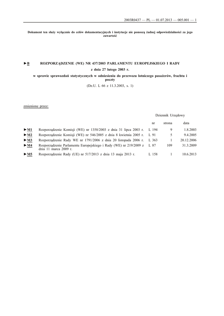 2003R0437 — PL — 01.07.2013 — 005.001 — 1 Dokument ten służy wyłącznie do celów dokumentacyjnych i instytucje nie ponoszą żadnej odpowiedzialności za jego zawartość ►B ROZPORZĄDZENIE (WE) NR 437/2003 PARLAMENTU EUROPEJSKIEGO I RADY z dnia 27 lutego 2003 r. w sprawie sprawozdań statystycznych w odniesieniu do przewozu lotniczego pasażerów, frachtu i poczty (Dz.U. L 66 z 11.3.2003, s. 1) zmienione przez: Dziennik Urzędowy nr ►M1 ►M2 ►M3 ►M4 ►M5 Rozporządzenie Komisji (WE) nr 1358/2003 z dnia 31 lipca 2003 r. Rozporządzenie Komisji (WE) nr 546/2005 z dnia 8 kwietnia 2005 r. Rozporządzenie Rady WE nr 1791/2006 z dnia 20 listopada 2006 r. Rozporządzenie Parlamentu Europejskiego i Rady (WE) nr 219/2009 z dnia 11 marca 2009 r. Rozporządzenie Rady (UE) nr 517/2013 z dnia 13 maja 2013 r. L L L L strona data 194 91 363 87 9 5 1 109 1.8.2003 9.4.2005 20.12.2006 31.3.2009 L 158 1 10.6.2013 2003R0437 — PL — 01.07.2013 — 005.001 — 2 ▼B ROZPORZĄDZENIE (WE) NR 437/2003 EUROPEJSKIEGO I RADY PARLAMENTU z dnia 27 lutego 2003 r. w sprawie sprawozdań statystycznych w odniesieniu do przewozu lotniczego pasażerów, frachtu i poczty PARLAMENT EUROPEJSKI I RADA UNII EUROPEJSKIEJ, uwzględniając Traktat ustanawiający Wspólnotę Europejską, w szczegól ności jego art. 285, uwzględniając wniosek Komisji (1), uwzględniając opinię Europejskiego Komitetu Ekonomiczno-Społeczne go (2), stanowiąc zgodnie z procedurą określoną w art. 251 Traktatu (3), a także mając na uwadze, co następuje: (1) Aby wykonać powierzone im zadania, w kontekście wspól notowej polityki transportu lotniczego i przyszłego rozwoju wspólnej polityki transportowej, instytucje wspólnotowe powinny mieć do dyspozycji porównywalne, zwarte, zsynchronizowane i regularne dane statystyczne dotyczące skali i rozwoju prze wozów lotniczych pasażerów, frachtu i poczty wewnątrz Wspól noty, lub do i ze Wspólnoty. (2) Obecnie nie ma żadnych takich wyczerpujących statystyk na szczeblu wspólnotowym. (3) Decyzja Rady 1999/126/WE z dnia 22 grudnia 1998 r. w sprawie wspólnotowego programu statystycznego na okres: 1998-2002 r. (4) stwierdziła potrzebę ustanowienia takich statystyk. (4) Wspólne gromadzenie danych na porównywalnej lub zharmoni zowanej podstawie czyni możliwym zaopatrzenie zintegrowanego systemu w niezawodną, zwartą i szybką informację. (5) Dane dotyczące lotniczego przewozu pasażerów, frachtu i poczty powinny, tam gdzie możliwe, być zgodne z danymi międzynaro dowymi dostarczanymi przez Międzynarodową Organizację Lotnictwa Cywilnego (ICAO) i zostać wykonane porównywalnie, gdzie stosowne, tak między Państwami Członkowskimi jak i dla różnych rodzajów transportu. (6) Po pewnym okresie Komisja powinna przedstawić sprawozdanie w celu umożliwienia dokonania oceny stosowania niniejszego rozporządzenia. (7) Zgodnie z zasadą pomocniczości ustanowioną w art. 5 Traktatu, stworzenie wspólnych norm statystycznych, które zezwalają na przedstawianie zharmonizowanych danych jest działaniem, które może być skutecznie podjęte jedynie na poziomie wspólnoto wym. Takie normy powinny być wdrożone w każdym Państwie Członkowskim z upoważnienia organów i instytucji zajmujących się przedstawianiem oficjalnych statystyk. (1) Dz.U. C 325 z 6.12.1995, str. 11. (2) Dz.U. C 39 z 12.2.1996, str. 25. (3) Opinia Parlamentu Europejskiego z dnia 29 lutego 1996 r. (Dz.U. C 78 z 18.3.1996, str. 28), potwierdzona w dniu 16 września 1999 r. (Dz.U. C 54 z 25.2.2000, str. 79), wspólne stanowisko Rady z dnia 30 września 2002 r. (Dz.U. C 275 E z 12.11.2002, str. 33) i decyzja Parlamentu Europej skiego z dnia 18 grudnia 2002 r. (dotychczas nieopublikowany w Dzienniku Urzędowym). (4) Dz.U. L 42 z 16.2.1999, str. 1. 2003R0437 — PL — 01.07.2013 — 005.001 — 3 ▼B (8) Rozporządzenie Rady (WE) nr 322/97 z dnia 17 lutego 1997 r. w sprawie statystyk Wspólnoty (1) dostarcza struktury wyjściowej dla przepisów ustanowionych w niniejszym rozporządzeniu. (9) Środki niezbędne do wykonania niniejszego rozporządzenia należy przyjąć zgodnie z decyzją Rady 1999/468/WE z dnia 28 czerwca 1999 r., ustanawiającą warunki wykonywania uprawnień wykonawczych przyznanych Komisji (2). (10) Konsultowano Komitet ds. Programu Statystycznego ustanowiony decyzją Rady 89/382/EWG, Euratom (3). (11) Ustalenia dotyczące zwiększenia współpracy w zakresie wyko rzystania portu lotniczego Gibraltar, uzgodnione w Londynie dnia 2 grudnia 1987 r. między Królestwem Hiszpanii i Zjedno czonym Królestwem Wielkiej Brytanii i Irlandii Północnej we wspólnej deklaracji Ministrów Spraw Zagranicznych obu państw, ustalenia te muszą jeszcze zostać zastosowane, PRZYJMUJĄ NINIEJSZĄ DECYZJĘ: Artykuł 1 Cel Państwa Członkowskie ustanowią sprawozdania statystyczne dotyczące przewozu pasażerów, frachtu i poczty przez handlowe usługi lotnicze jak również ruchów prywatnych statków powietrznych do lub ze wspól notowych portów lotniczych, z wyjątkiem lotów samolotów państwo wych. Artykuł 2 Gibraltar 1. Przyjmuje się, że stosowanie niniejszego rozporządzenia do portu lotniczego w Gibraltarze jest bez uszczerbku dla odpowiednich sytuacji prawnych Królestwa Hiszpanii oraz Zjednoczonego Królestwa Wielkiej Brytanii i Irlandii Północnej w odniesieniu do sporów dotyczących suwerenności terytorium, na którym położony jest port lotniczy. 2. Stosowanie przepisów niniejszego rozporządzenia do portu lotni czego w Gibraltarze jest zawieszone do dnia wejścia w życie zasad wspólnej deklaracji ministrów spraw zagranicznych Królestwa Hiszpanii i Zjednoczonego Królestwa Wielkiej Brytanii i Irlandii Północnej z dnia 2 grudnia 1987 r. Rządy Hiszpanii i Zjednoczonego Królestwa Wielkiej Brytanii i Irlandii Północnej poinformują Komisję o dacie jego wejścia w życie. Artykuł 3 Charakterystyka gromadzenia danych 1. Każde z Państw Członkowskich gromadzi da