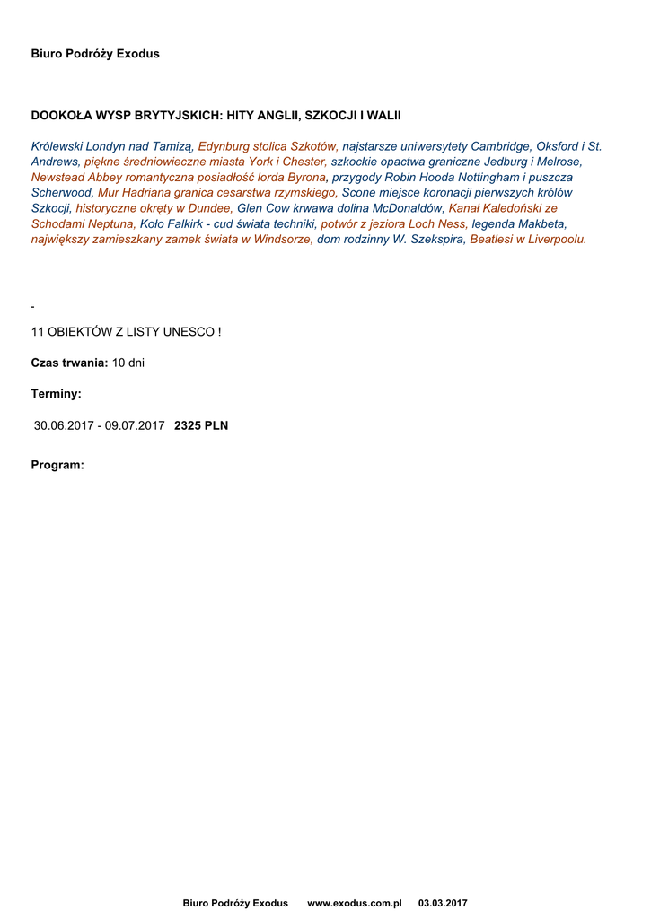 Biuro Podróży Exodus DOOKOŁA WYSP BRYTYJSKICH: HITY ANGLII, SZKOCJI I WALII Królewski Londyn nad Tamizą, Edynburg stolica Szkotów, najstarsze uniwersytety Cambridge, Oksford i St. Andrews, piękne średniowieczne miasta York i Chester, szkockie opactwa graniczne Jedburg i Melrose, Newstead Abbey romantyczna posiadłość lorda Byrona, przygody Robin Hooda Nottingham i puszcza Scherwood, Mur Hadriana granica cesarstwa rzymskiego, Scone miejsce koronacji pierwszych królów Szkocji, historyczne okręty w Dundee, Glen Cow krwawa dolina McDonaldów, Kanał Kaledoński ze Schodami Neptuna, Koło Falkirk - cud świata techniki, potwór z jeziora Loch Ness, legenda Makbeta, największy zamieszkany zamek świata w Windsorze, dom rodzinny W. Szekspira, Beatlesi w Liverpoolu. BEZ PRZEJAZDÓW NOCNYCH ! 19. SEZON DOŚWIADCZEŃ NA TEJ TRASIE ! 11 OBIEKTÓW Z LISTY UNESCO ! Czas trwania: 10 dni Terminy: 30.06.2017 - 09.07.2017 2325 PLN Program: Biuro Podróży Exodus www.exodus.com.pl 03.03.2017