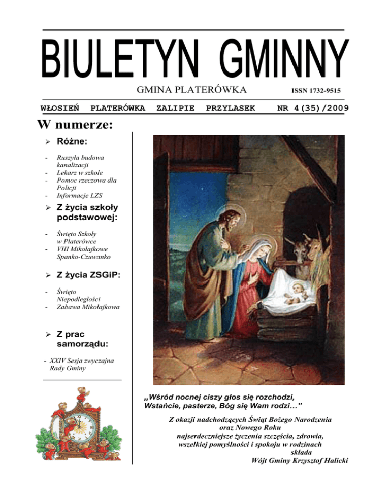 GMINA PLATERÓWKA WŁOSIEŃ PLATERÓWKA ZALIPIE PRZYLASEK ISSN 1732-9515 NR 4(35)/2009 W numerze: RóŜne: - Ruszyła budowa kanalizacji Lekarz w szkole Pomoc rzeczowa dla Policji Informacje LZS - Z Ŝycia szkoły podstawowej: - Święto Szkoły w Platerówce VIII Mikołajkowe Spanko-Czuwanko Z Ŝycia ZSGiP: - Święto Niepodległości Zabawa Mikołajkowa Z prac samorządu: - XXIV Sesja zwyczajna Rady Gminy „Wśród nocnej ciszy głos się rozchodzi, Wstańcie, pasterze, Bóg się Wam rodzi…” Z okazji nadchodzących Świąt BoŜego Narodzenia oraz Nowego Roku najserdeczniejsze Ŝyczenia szczęścia, zdrowia, wszelkiej pomyślności i spokoju w rodzinach składa Wójt Gminy Krzysztof Halicki 2 BIULETYN GMINNY. GMINA PLATERÓWKA 4(35)2009 Ruszyła budowa kanalizacji W miesiącu sierpniu br rozpoczęła się długo oczekiwana przez Mieszkańców Gminy Platerówka realizacja inwestycji „Uporządkowanie gospodarki wodnościekowej gmin leŜących w zlewni rzeki Czerwona Woda – Etap 0”. Zgodnie z harmonogramem rzeczowo-finansowym w październiku 2009r. rozpoczęto budowę odcinka tranzytu Włosień – Mikułowa. W chwili obecnej wykonywane są przejścia (odwierty) pod drogą i rzeką w celu przyłączenia posesji leŜących po drugiej stronie drogi lub rzeki. Pomimo tak kosztownej i wielkiej inwestycji w gminie Platerówka cena wody dla mieszkańców pozostanie praktycznie na tym samym poziomie cenowym. Wójt Gminy Platerówka zapowiedział dopłaty do 1m3 wody tak, aby Mieszkańcy Gminy nie odczuli tak powaŜnej pod względem finansowym i organizacyjnym inwestycji jaką jest budowa kanalizacji. W tym celu Wójt Gminy przygotował uchwałę w sprawie dopłaty z budŜetu gminy kwoty 2,54 zł brutto do 1m3 wody, którą przedłoŜy na najbliŜszej sesji Rady Gminy Platerówka do uchwalania. Oprac. UG ***** Lekarz w szkole Z inicjatywy Wójta Gminy Platerówka Krzysztofa Halickiego i Pani Dyrektor S.P. w Szkole Podstawowej w Platerówce nad zdrowiem Naszych najmłodszych dzieci czuwa dodatkowo Nasz Doktor lek. med. Radosław Tomaszewski. Pan doktor w kaŜdy piątek udziela dzieciom porad, jak się uchronić przed niebezpieczną postacią grypy A/H1N1oraz przed infekcjami - jak je rozpoznać, jak im przeciwdziałać i w jaki sposób postępować aby nie zainfekować innych. W obecności rodzica i za jego zgodą, kaŜde dziecko moŜe zostać zbadane. JeŜeli rodzic i dziecko są pacjentami Przychodni w Platerówce, to Pan doktor od razu wypisze receptę i podda dziecko leczeniu, natomiast jeŜeli rodzic naleŜy do innej przychodni to doktor udzieli niezbędnej porady kierując dziecko na dalsze leczenie do właściwej przychodni. Tak kompleksowa opieka lekarska w naszej Gminie i Szkole juŜ została doceniona przez rodziców w postaci przeniesienia się z powrotem z innych przychodni do Naszej Przychodni w Platerówce. Pan Doktor Ŝyczy, duŜo, duŜo zdrowia, uśmiechu na co dzień, ciepłych i rodzinnych Świąt BoŜego Narodzenia oraz Szczęśliwego Nowego Roku - Wszystkim Mieszkańcom Gminy Platerówka. Oprac. UG 3 4(35)2009 BIULETYN GMINNY. GMINA PLATERÓWKA Pomoc rzeczowa Gminy dla Policji W dniu 4 grudnia 2009r. w Komendzie Powiatowej w Lubaniu odbyła się uroczystość wręczenia sprzętu zakupionego przez Gminę Platerówka funkcjonariuszom Policji z Komisariatu w Leśnej. Zakupiony sprzęt to w pełni profesjonalne „praktycznie niezniszczalne” latarki wraz z osprzętem do ładowania, które mogą równieŜ posłuŜyć w razie konieczności do rozbicia np. szyby. Sprzęt z rąk Wójta Gminy Platerówka odebrał osobiście Komendant Komisariatu w Leśnej Pan Marek Ziębal. Pan Komendant Powiatowy Policji w Lubaniu insp. mgr Władysław Łozdowski osobiście podziękował Panu Wójtowi Gminy Platerówka Krzysztofowi Halickiemu za wsparcie mające na celu podniesienie bezpieczeństwa Mieszkańców Gminy Platerówka i nie tylko. Oprac. UG ***** Komunikat Okręg. Związku Tenisa Stołowego Jelenia Góra W niedzielę 27.09.2009r.na sali Gminnego Ośrodka Kultury we Włosieniu odbył się turniej tenisa stołowego inaugurujący sezon sportowy 2009/2010. Wynik zawodów: A. Szkoły Podstawowe: Dziewczęta: 1. Michno Angelika - LZS Wald-Bedanrz Włosień - LZS Wald-Bedanrz Włosień Chłopcy: 1. ŚwieŜak Dawid 2. Trawicki Damian LZS - LZS Wald-Bedanrz Włosień 3. Trawicki Daniel LZS - LZS Wald-Bedanrz Włosień 4. Puzio Michał LZS - LZS Wald-Bedanrz Włosień B. Gimnazja: Grupa I (klasy 1-2): 1. Pieczarka Damian - LZS Czarni Lwówek 2. Ulewski Grzegorz - KS Bobry Jelenia Góra 3. Nikodem Sebastian - LZS Zawidów Grupami (klasa 3): 1. Skorupski Amadeusz - LZS Wald-Bedanrz Włosień 2. Kozłowski Paweł - LZS Wald-Bedanrz Włosień 3. Świder Paweł - LZS Wald-Bedanrz Włosień 4. Szpak Krzysztof - LZS Wald-Bedanrz Włosień C. Szkoły Średnie: 1. Łazarowicz Grzegorz - LZS Święci Radostów 2. Łazarowicz Mariusz - LZS Święci Radostów 3. Szłabowicz Piotr - LZS Święci Radostów D. Seniorzy: 1. Andrzejewski Tomasz - LZS Wald-Bedanr Włosień 2. Atlak Miłosz - LZS Wald-Bedanrz Włosień 3. Marańda Marcin - LZS Wald-Bedanrz Włosień 4. Kowal Mateusz - LZS Wald-Bedanrz Włosień E. Oldboje: 1. śołopa Krzysztof - LZS Wald-Bedanrz Włosień 2. Marchalewicz Wacław - LKS Kaczorów 3. Gruna Bogdan - KS Bobry Jelenia Góra Ciąg dalszy na str. 4 4 BIULETYN GMINNY. GMINA PLATERÓWKA 4(35)2009 W zawodach wzięło udział 54 zawodniczek i zawodników z Jeleniej Góry, Lwówka, Lubania, Włosienia, Zawidowa, Radostowa, Zaręby oraz goście z Czech,/Frydland/ i Niemiec /Goerlitz /. Zwycięzcy otrzymali puchary oraz pamiątkowe dyplomy ufundowane przez firmę Wald Bednarz oraz Urząd Gminy w Platerówce. Opiekę sędziowską nad zawodami sprawowali: - sędzia główny: Krzysztof Struczyk - sędzia pomocniczy: Janusz Nawrocki Zawody rozpoczęły się o godzinie 9:30, a zakończyły o godzinie 18:30. ***** Komunikaty LZS „WALD.BEDNARZ Włosień” W sobotę 5 grudnia 2009r. na zapros