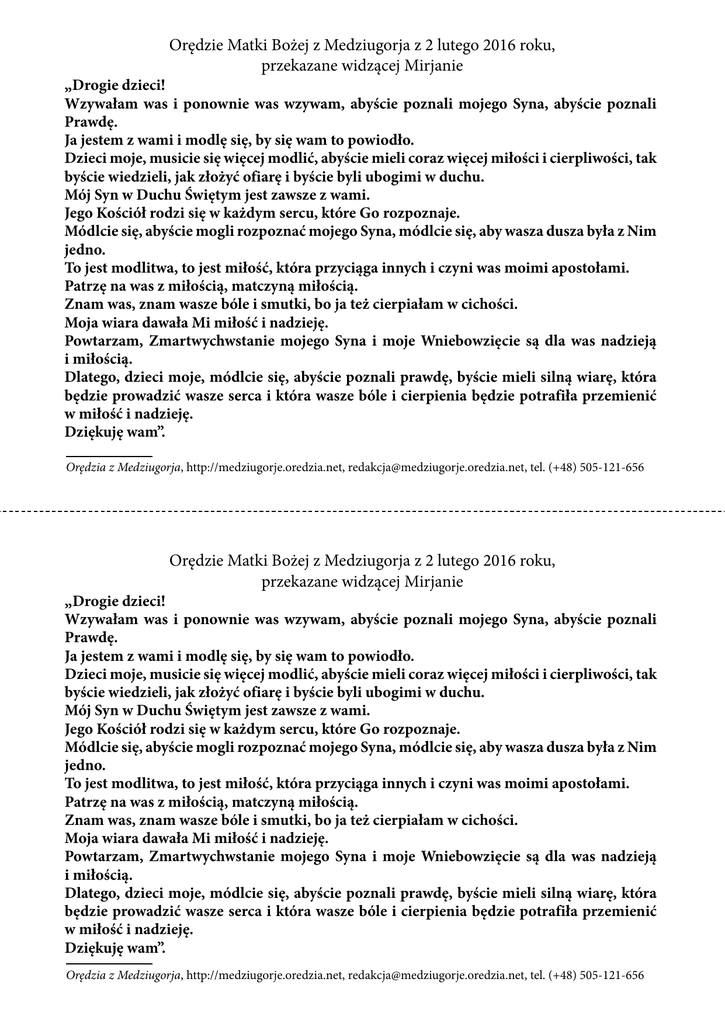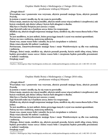 Orędzie Matki Bożej z Medziugorja z 2 lutego 2016 roku, przekazane widzącej Mirjanie „Drogie dzieci! Wzywałam was i ponownie was wzywam, abyście poznali mojego Syna, abyście poznali Prawdę. Ja jestem z wami i modlę się, by się wam to powiodło. Dzieci moje, musicie się więcej modlić, abyście mieli coraz więcej miłości i cierpliwości, tak byście wiedzieli, jak złożyć ofiarę i byście byli ubogimi w duchu. Mój Syn w Duchu Świętym jest zawsze z wami. Jego Kościół rodzi się w każdym sercu, które Go rozpoznaje. Módlcie się, abyście mogli rozpoznać mojego Syna, módlcie się, aby wasza dusza była z Nim jedno. To jest modlitwa, to jest miłość, która przyciąga innych i czyni was moimi apostołami. Patrzę na was z miłością, matczyną miłością. Znam was, znam wasze bóle i smutki, bo ja też cierpiałam w cichości. Moja wiara dawała Mi miłość i nadzieję. Powtarzam, Zmartwychwstanie mojego Syna i moje Wniebowzięcie są dla was nadzieją i miłością. Dlatego, dzieci moje, módlcie się, abyście poznali prawdę, byście mieli silną wiarę, która będzie prowadzić wasze serca i która wasze bóle i cierpienia będzie potrafiła przemienić w miłość i nadzieję. Dziękuję wam”. Orędzia z Medziugorja, http://medziugorje.oredzia.net, [email protected], tel. (+48) 505-121-656 Orędzie Matki Bożej z Medziugorja z 2 lutego 2016 roku, przekazane widzącej Mirjanie „Drogie dzieci! Wzywałam was i ponownie was wzywam, abyście poznali mojego Syna, abyście poznali Prawdę. Ja jestem z wami i modlę się, by się wam to powiodło. Dzieci moje, musicie się więcej modlić, abyście mieli coraz więcej miłości i cierpliwości, tak byście wiedzieli, jak złożyć ofiarę i byście byli ubogimi w duchu. Mój Syn w Duchu Świętym jest zawsze z wami. Jego Kościół rodzi się w każdym sercu, które Go rozpoznaje. Módlcie się, abyście mogli rozpoznać mojego Syna, módlcie się, aby wasza dusza była z Nim jedno. To jest modlitwa, to jest miłość, która przyciąga innych i czyni was moimi apostołami. Patrzę na was z miłością, matczyną miłością. Znam was, znam wasze bóle i smutki, bo ja też cierpiałam w cichości. Moja wiara dawała Mi miłość i nadzieję. Powtarzam, Zmartwychwstanie mojego Syna i moje Wniebowzięcie są dla was nadzieją i miłością. Dlatego, dzieci moje, módlcie się, abyście poznali prawdę, byście mieli silną wiarę, która będzie prowadzić wasze serca i która wasze bóle i cierpienia będzie potrafiła przemienić w miłość i nadzieję. Dziękuję wam”. Orędzia z Medziugorja, http://medziugorje.oredzia.net, [email protected], tel. (+48) 505-121-656