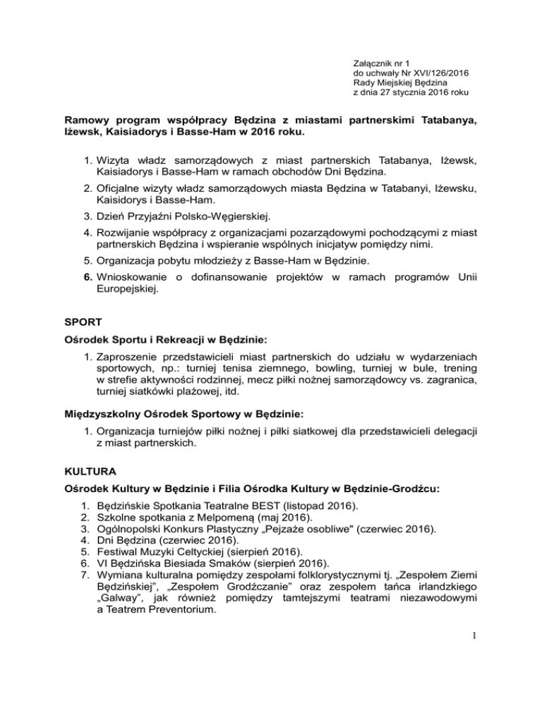 Załącznik nr 1 do uchwały Nr XVI/126/2016 Rady Miejskiej Będzina z dnia 27 stycznia 2016 roku Ramowy program współpracy Będzina z miastami partnerskimi Tatabanya, Iżewsk, Kaisiadorys i Basse-Ham w 2016 roku. 1. Wizyta władz samorządowych z miast partnerskich Tatabanya, Iżewsk, Kaisiadorys i Basse-Ham w ramach obchodów Dni Będzina. 2. Oficjalne wizyty władz samorządowych miasta Będzina w Tatabanyi, Iżewsku, Kaisidorys i Basse-Ham. 3. Dzień Przyjaźni Polsko-Węgierskiej. 4. Rozwijanie współpracy z organizacjami pozarządowymi pochodzącymi z miast partnerskich Będzina i wspieranie wspólnych inicjatyw pomiędzy nimi. 5. Organizacja pobytu młodzieży z Basse-Ham w Będzinie. 6. Wnioskowanie o dofinansowanie projektów w ramach programów Unii Europejskiej. SPORT Ośrodek Sportu i Rekreacji w Będzinie: 1. Zaproszenie przedstawicieli miast partnerskich do udziału w wydarzeniach sportowych, np.: turniej tenisa ziemnego, bowling, turniej w bule, trening w strefie aktywności rodzinnej, mecz piłki nożnej samorządowcy vs. zagranica, turniej siatkówki plażowej, itd. Międzyszkolny Ośrodek Sportowy w Będzinie: 1. Organizacja turniejów piłki nożnej i piłki siatkowej dla przedstawicieli delegacji z miast partnerskich. KULTURA Ośrodek Kultury w Będzinie i Filia Ośrodka Kultury w Będzinie-Grodźcu: 1. 2. 3. 4. 5. 6. 7. Będzińskie Spotkania Teatralne BEST (listopad 2016). Szkolne spotkania z Melpomeną (maj 2016). Ogólnopolski Konkurs Plastyczny „Pejzaże osobliwe" (czerwiec 2016). Dni Będzina (czerwiec 2016). Festiwal Muzyki Celtyckiej (sierpień 2016). VI Będzińska Biesiada Smaków (sierpień 2016). Wymiana kulturalna pomiędzy zespołami folklorystycznymi tj. „Zespołem Ziemi Będzińskiej”, „Zespołem Grodźczanie” oraz zespołem tańca irlandzkiego „Galway”, jak również pomiędzy tamtejszymi teatrami niezawodowymi a Teatrem Preventorium. 1 8. Występy zespołów muzycznych i wokalnych z miast partnerskich podczas imprez plenerowych organizowanych na terenie parku na Dolnej Syberce. 9. Prezentacja twórczości artystów plastyków, malarzy, rzeźbiarzy z miast partnerskich w Galerii „Strych” Ośrodka Kultury w Będzinie. Muzeum Zagłębia w Będzinie: Zorganizowanie dla goszczących w Będzinie przedstawicieli miast partnerskich uroczystego spotkania na dziedzińcu zamkowym lub w zabytkowych wnętrzach Pałacu Mieroszewskich. Spotkaniu mógłby towarzyszyć koncert muzyki klasycznej lub zespołu folklorystycznego z regionu oraz zwiedzanie obiektów muzealnych. Zorganizowanie prelekcji historyka dotyczącej najciekawszych wątków ze wspólnej historii Polski, Węgier, Rosji, Litwy i Francji. Bieżąca obsługa gości w obiektach Zamek, Pałac Mieroszewskich, Dom Modlitwy Mizrachi, Podziemia Będzińskie, Wzgórze Zamkowe, oprowadzanie po mieście. Uczestnictwo gości z zagranicy w imprezach muzealnych np. w „Jarmarku Rzemiosła i Rękodzieła" poprzez prezentację swoich wyrobów rzemieślniczych na stoiskach, a także możliwość występu zespołów ludowych miast partnerskich podczas imprezy. Przygotowanie wystaw tematycznych we współpracy z wybranymi muzeami z miast partnerskich. Miejska i Powiatowa Biblioteka Publiczna w Będzinie: 1. Zaproszenie do udziału w XVIII edycji Powiatowego Konkursu Ekologicznego MOJA ZIEMIA – CZYSTY ŚWIAT dzieci i młodzieży z placówek oświatowych miast partnerskich oraz prezentacja nagrodzonych prac na wystawie pokonkursowej. 2. Zorganizowanie XVI edycji międzynarodowej imprezy czytelniczej dla dzieci pt. „Noc z Andersenem" w terminie z 1/2 kwietnia 2016 roku w ramach współpracy z Miejską Biblioteką w Czeskim Cieszynie i Klubem Bibliotek Dziecięcych Stowarzyszenia Bibliotekarzy i Pracowników Informacji w Republice Czeskiej. POLITYKA SPOŁECZNA: 1. Porównanie metod pracy z dziećmi z rodzin dysfunkcyjnych w świetlicach socjoterapeutycznych działających na terenie Będzina oraz w miastach partnerskich. OŚWIATA: Dalsze zacieśnianie oraz nawiązywanie współpracy pomiędzy szkołami i przedszkolami miast Tatabanya, Iżewsk, Kaisiadorys, Basse-Ham oraz innych miast z zagranicy a placówkami oświatowymi z Będzina: - Przedszkole Miejskie nr 4 - dalsza współpraca w ramach platformy dla 2 pracowników oświaty z krajów europejskich eTwinning, Przedszkole Miejskie nr 11 – rozwijanie współpracy z nowym przedszkolem z Litwy, Szkoła Podstawowa nr 8 – dalsza współpraca ze szkołą w Durham w Karolinie Północnej (USA) oraz w ramach platformy eTwinning, Szkoła Podstawowa nr 10 – dalsza współpraca w ramach platformy dla pracowników oświaty z krajów europejskich eTwinning, zaproszenie miast partnerskich do udziału w konkursie grafiki komputerowej „Malowanie na ekranie", Szkoła Podstawowa nr 11 – dalsza współpraca z partnerami z Portugalii i Finlandii w ramach projektu „Technologie multimedialne drogą do przyjaznej edukacji przyszłości" z programu Erasmus+, Gimnazjum nr 1 – dalsza współpraca z partnerami z Niemiec (w maju 2016 roku planowana jest wizyta uczniów z niemieckiego Theodor-HeussGymnasium w Będzinie), Miejski Zespół Szkół nr 1 – dalsza współpraca ze szkołą na Litwie, złożenie wniosku o dofinansowanie projektu z Polsko-Litewskiego Funduszu Wymiany Młodzieży. Planowane jest również złożenie wniosku w ramach programu Erasmus+, Akcja KA1. Udział placówek oświatowych z Będzina w europejskich programach edukacyjnych. Koordynowanie działań dotyczących dalszej współpracy Państwowej Akademii Medycznej z Iżewska i Śląskiego Uniwersytetu Medycznego w Katowicach. OCHRONA ŚRODOWISKA: 1. Udział przedstawicieli miast partnerskich w organizowanych imprezach i szkoleniach edukacyjnych. 3