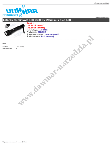 Informacje o produkcie Utworzono 03-03-2017 Latarka aluminiowa LED LUXEON 285mm, 6 diód LED Cena : 27,24 zł (netto) 33,50 zł (brutto) zi a. p l Nr katalogowy : 95912 Producent : CORONA Stan magazynowy : bardzo wysoki Średnia ocena : brak recenzji Opis: 285 [mm] 6 w w w .d aw m ar -n ar ze d Rozmiar Ilość diod LED Wygenerowano w programie www.oscGold.com