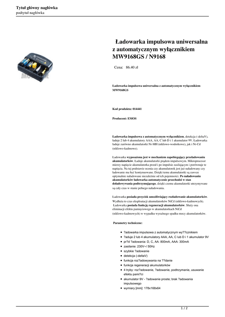 Tytuł główny nagłówka podtytuł nagłówka Ładowarka impulsowa uniwersalna z automatycznym wyłącznikiem MW9168GS / N9168 Cena: 86.40 zł Ładowarka impulsowa uniwersalna z automatycznym wyłącznikiem MW9168GS Kod produktu: 014441 Producent: EMOS Ładowarka impulsowa z automatycznym wyłącznikiem, detekcja (-deltaV), ładuje 2 lub 4 akumulatory AAA, AA, C lub D i 1 akumulator 9V. Ładowarka ładuje zarówno akumulatorki Ni-MH (niklowo-wodorkowe), jak i Ni-Cd (niklowo-kadmowe). Ładowarka wyposażona jest w mechanizm zapobiegający przeładowaniu akumulatorków. Ładuje akumulatorki prądem impulsowym. Mikroprocesor mierzy napięcie akumulatorka przed i po impulsie zasilającym i porównuje te napięcia. Na tej podstawie ocenia czy akumulatorek jest już naładowany czy ładowanie ma być kontynuowane. Dzięki temu akumulatorki są zawsze optymalnie naładowane niezależnie od ich pojemności. Po naładowaniu akumulatorków ładowarka automatycznie przechodzi w stan doładowywania podtrzymującego, dzięki czemu akumulatorki utrzymywane są cały czas w stanie pełnego naładowania. Ładowarka posiada przycisk umożliwiający rozładowanie akumulatorków. Wydłuża to czas eksploatacji akumulatorków NiCd (niklowo-kadmowych). Ładowarka posiada funkcję regeneracji akumulatorków. Służy ona eliminacji efektu pamięciowego w akumulatorkach NiCd (niklowo-kadmowych) w wypadku wyraźnego spadku mocy akumulatorków. Parametry techniczne: ?adowarka impulsowa z automatycznym wy??cznikiem ?aduje 2 lub 4 akumulatory AAA, AA, C lub D i 1 akumulator 9V pr?d ?adowania: D, C, AA: 800mA, AAA: 300mA zasilanie: 230V~/ 50Hz szybkie ?adowanie detekcja (-deltaV) funkcja roz?adowywania na ??danie funkcja regeneracji akumulatorków 4 tryby: roz?adowanie, ?adowanie, podtrzymanie, usuwanie efektu pami?ci akumulator 9V - ?adowanie proste; brak ?adowania impulsowego wymiary [mm]: 178x168x64 1/2 Tytuł główny nagłówka podtytuł nagłówka jednostka miary: sztuka waga brutto (kg): 0,919 waga netto (kg): 0,814 Szczegóły Rodzaj ładowarki do akumulatorków 2/2 Powered by TCPDF (www.tcpdf.org)
