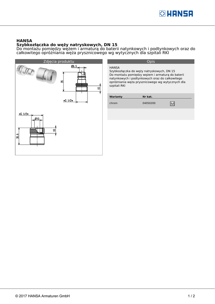 HANSA Szybkozłączka do węży natryskowych, DN 15 Do montażu