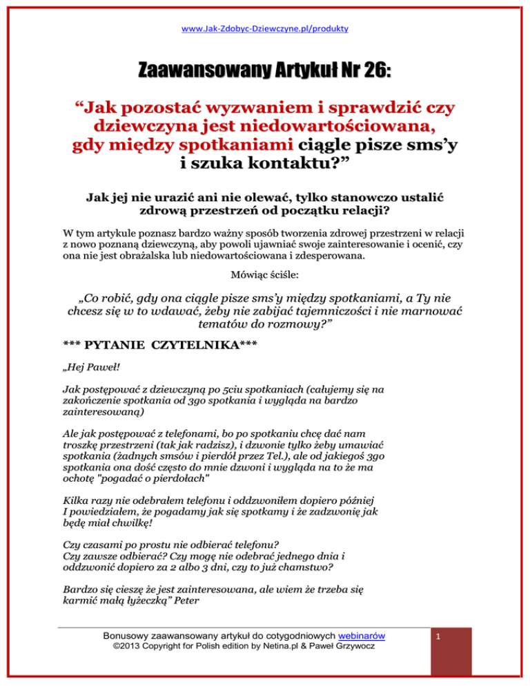 www.Jak-Zdobyc-Dziewczyne.pl/produkty Zaawansowany Artykuł Nr 26: “Jak pozostać wyzwaniem i sprawdzić czy dziewczyna jest niedowartościowana, gdy między spotkaniami ciągle pisze sms’y i szuka kontaktu?” Jak jej nie urazić ani nie olewać, tylko stanowczo ustalić zdrową przestrzeń od początku relacji? W tym artykule poznasz bardzo ważny sposób tworzenia zdrowej przestrzeni w relacji z nowo poznaną dziewczyną, aby powoli ujawniać swoje zainteresowanie i ocenić, czy ona nie jest obrażalska lub niedowartościowana i zdesperowana. Mówiąc ściśle: „Co robić, gdy ona ciągle pisze sms’y między spotkaniami, a Ty nie chcesz się w to wdawać, żeby nie zabijać tajemniczości i nie marnować tematów do rozmowy?” *** PYTANIE CZYTELNIKA*** „Hej Paweł! Jak postępować z dziewczyną po 5ciu spotkaniach (całujemy się na zakończenie spotkania od 3go spotkania i wygląda na bardzo zainteresowaną) Ale jak postępować z telefonami, bo po spotkaniu chcę dać nam troszkę przestrzeni (tak jak radzisz), i dzwonie tylko żeby umawiać spotkania (żadnych smsów i pierdół przez Tel.), ale od jakiegoś 3go spotkania ona dość często do mnie dzwoni i wygląda na to że ma ochotę "pogadać o pierdołach" Kilka razy nie odebrałem telefonu i oddzwoniłem dopiero później I powiedziałem, że pogadamy jak się spotkamy i że zadzwonię jak będę miał chwilkę! Czy czasami po prostu nie odbierać telefonu? Czy zawsze odbierać? Czy mogę nie odebrać jednego dnia i oddzwonić dopiero za 2 albo 3 dni, czy to już chamstwo? Bardzo się cieszę że jest zainteresowana, ale wiem że trzeba się karmić małą łyżeczką” Peter Bonusowy zaawansowany artykuł do cotygodniowych webinarów ©2013 Copyright for Polish edition by Netina.pl & Paweł Grzywocz 1 www.Jak-Zdobyc-Dziewczyne.pl/produkty >>> MOJA ODPOWIEDŹ: Hej Peter! Dokładnie, trzeba się „karmić łyżeczką.” To klucz do tego, aby zniechęcić zdesperowaną lub obrażalską i kontrolującą dziewczynę albo jeszcze bardziej nakręcić dziewczynę o zdrowym poczuciu własnej wartości. Pytanie, czy ta dziewczyna właśnie nie jest niedowartościowana lub obrażalska/dominująca? Sprawdź w poniższych artykułach: http://mp3.jakzdobycdziewczyne.pl/Webinary/Artykuly/ZaawArtykul22OnaSieObra zaBoNiePiszeszSmsow.pdf http://mp3.jakzdobycdziewczyne.pl/Webinary/Artykuly/ZaawArtykul9GdyOnaMaNi skaSamooceneIChceCieZdominowac.pdf Odbieraj telefony, gdy możesz z wyjątkiem piątków i sobót oczywiście, ponieważ te dni według kobiet to dni dla stałych par oraz każdy facet na te dni się umawia i jest wtedy dostępny, co jest super nudne i przewidywalne. Gdy ona zadzwoni, to odbierz, wysłuchaj jej i nic nie mów o sobie. Następnie mów jej do znudzenia: • „Opowiem Ci na spotkaniu.” Gdyby pytała „dlaczego”, to mów takie rzeczy, że „lubisz ją widzieć, gdy z nią rozmawiasz i patrzeć w jej oczy” albo że „jak powiesz jej teraz, to nie będziecie mieli tematów do rozmowy na spotkaniu.” To bardzo ważne i to jest prawda. Gdy sobie wszystko opowiecie przez telefon, to potem na spotkaniu to już nie jest ta sama atmosfera, co wtedy, gdybyście się nie widzieli. Gdy ona będzie przez telefon chciała zapodać Ci newsa numer dwa, czyli jakiś drugi wątek, to wtedy ja zatrzymaj i powiedz: • "Mam prośbę. Opowiesz mi o tym na spotkaniu. Możesz to dla mnie zrobić?" lub • "Umieram z ciekawości, ale opowiesz mi o tym, na spotkaniu, ok?" Bonusowy zaawansowany artykuł do cotygodniowych webinarów ©2013 Copyright for Polish edition by Netina.pl & Paweł Grzywocz 2 www.Jak-Zdobyc-Dziewczyne.pl/produkty Gdyby ona nie słuchała, to wysłuchaj jej i potem powiedz: • "Ok, to do zobaczenia w czwartek na spotkaniu, to opowiesz mi więcej." Po czym zakończ rozmowę. Albo ona wytresuje Ciebie albo Ty ją. Ustal twarde zasady w grzeczny i stanowczy sposób. Zamiast się tłumaczyć, krótko mówisz, żeby zachowała to na spotkanie i potem zmierzaj do końca rozmowy. Tak samo na sms odpisz jeden raz, że np. wiesz o tym, jak ona tęskni czy coś podobnego w zabawny i zaczepny sposób, jakbyś to Ty był tym „lepszym” i pożądanym i potem w drugim smsie już zakończ interakcję i napisz, że „więcej się dowie na spotkaniu.” Musisz ją tym zamęczyć dopóki ona nie zrozumie, że nie będziecie pisać ze sobą wiadomości tekstowych, tylko dzwonić, aby ustalić spotkanie. Od rozmowy i dzielenia się informacjami są spotkania. Jest to tak ważne, bo tylko na spotkaniu możesz oceniać mowę ciała i prawdziwe zainteresowanie dziewczyny oraz tylko na spotkaniu możesz ją bardziej zainteresować poprzez kontakt wzrokowy, Twój uśmiech czy pocałunek. A przez telefon tego nie ma, jesteś natomiast wtedy zbyt dostępny, zabijasz tajemniczość, jesteś jak jej przyjaciółki i inni faceci oraz możesz obniżyć jej zainteresowanie, więc po co to robić… Telefon słuŜy do umawiania spotkań – tyle w temacie Świetnie, że to rozumiesz i tak trzymaj, aby sprawdzić, czy ona ma swoje życie oraz czy potrafi sobie samodzielnie zorganizować czas czy będzie nieustannie dzwonić i potem obrażać się, że nie chcesz codziennie z nią rozmawiać, jakbyście byli starym małżeństwem. Skoro ona na początku znajomości chce się tak często kontaktować, to co będzie potem? O zgrozo, wolę nie wiedzieć, więc miej się na baczności. Nie pozwól się ZDOMINOWAĆ! Pozdrawiam serdecznie! Paweł Grzywocz Jak-Zdobyc-Dziewczyne.pl/produkty Jak-Zdobyc-Dziewczyne.pl/tranzycje PewnoscSiebieW90Dni.pl [email protected] facebook.com/GrzywoczPawel Bonusowy zaawansowany artykuł do cotygodniowych webinarów ©2013 Copyright for Polish edition by Netina.pl & Paweł Grzywocz 3