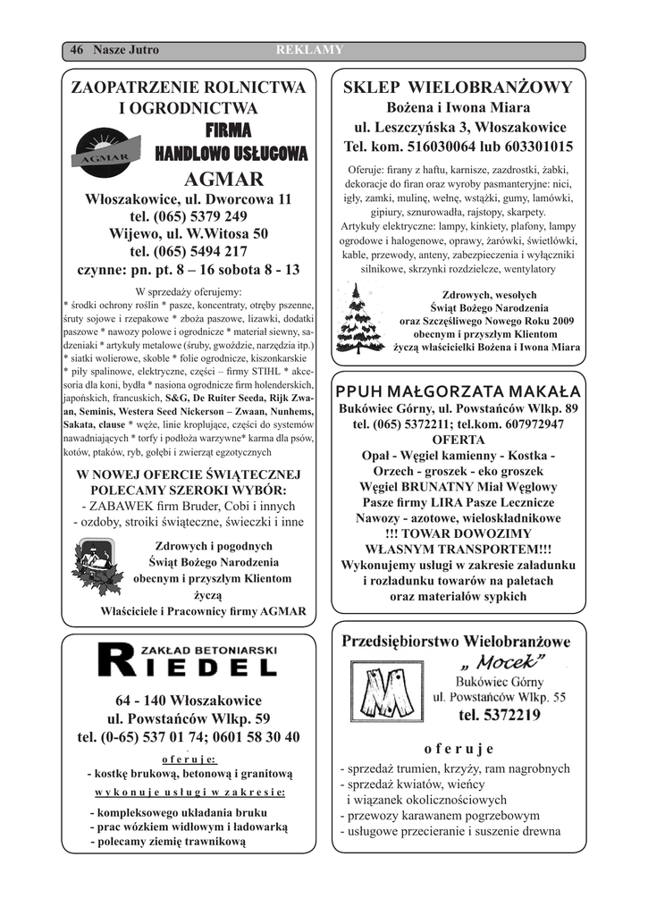 46 Nasze Jutro REKLAMY Zaopatrzenie rolnictwa i ogrodnictwa Firma handlowo usługowa AGMAR Włoszakowice, ul. Dworcowa 11 tel. (065) 5379 249 Wijewo, ul. W.Witosa 50 tel. (065) 5494 217 czynne: pn. pt. 8 – 16 sobota 8 - 13 W sprzedaży oferujemy: * środki ochrony roślin * pasze, koncentraty, otręby pszenne, śruty sojowe i rzepakowe * zboża paszowe, lizawki, dodatki paszowe * nawozy polowe i ogrodnicze * materiał siewny, sadzeniaki * artykuły metalowe (śruby, gwoździe, narzędzia itp.) * siatki wolierowe, skoble * folie ogrodnicze, kiszonkarskie * piły spalinowe, elektryczne, części – firmy STIHL * akcesoria dla koni, bydła * nasiona ogrodnicze firm holenderskich, japońskich, francuskich, S&G, De Ruiter Seeda, Rijk Zwaan, Seminis, Westera Seed Nickerson – Zwaan, Nunhems, Sakata, clause * węże, linie kroplujące, części do systemów nawadniających * torfy i podłoża warzywne* karma dla psów, kotów, ptaków, ryb, gołębi i zwierząt egzotycznych W NOWEJ OFERCIE ŚWIĄTECZNEJ POLECAMY SZEROKI WYBÓR: - ZABAWEK firm Bruder, Cobi i innych - ozdoby, stroiki świąteczne, świeczki i inne Zdrowych i pogodnych Świąt Bożego Narodzenia obecnym i przyszłym Klientom życzą Właściciele i Pracownicy firmy AGMAR 64 - 140 Włoszakowice ul. Powstańców Wlkp. 59 tel. (0-65) 537 01 74; 0601 58 30 40 o f e r u j e: - kostkę brukową, betonową i granitową w y k o n u j e u s ł u g i w z a k r e s i e: - kompleksowego układania bruku - prac wózkiem widłowym i ładowarką - polecamy ziemię trawnikową Sklep wielobranżowy Bożena i Iwona Miara ul. Leszczyńska 3, Włoszakowice Tel. kom. 516030064 lub 603301015 Oferuje: firany z haftu, karnisze, zazdrostki, żabki, dekoracje do firan oraz wyroby pasmanteryjne: nici, igły, zamki, mulinę, wełnę, wstążki, gumy, lamówki, gipiury, sznurowadła, rajstopy, skarpety. Artykuły elektryczne: lampy, kinkiety, plafony, lampy ogrodowe i halogenowe, oprawy, żarówki, świetlówki, kable, przewody, anteny, zabezpieczenia i wyłączniki silnikowe, skrzynki rozdzielcze, wentylatory Zdrowych, wesołych Świąt Bożego Narodzenia oraz Szczęśliwego Nowego Roku 2009 obecnym i przyszłym Klientom życzą właścicielki Bożena i Iwona Miara PPUH Małgorzata Makała Bukówiec Górny, ul. Powstańców Wlkp. 89 tel. (065) 5372211; tel.kom. 607972947 OFERTA Opał - Węgiel kamienny - Kostka Orzech - groszek - eko groszek Węgiel BRUNATNY Miał Węglowy Pasze firmy LIRA Pasze Lecznicze Nawozy - azotowe, wieloskładnikowe !!! TOWAR DOWOZIMY WŁASNYM TRANSPORTEM!!! Wykonujemy usługi w zakresie załadunku i rozładunku towarów na paletach oraz materiałów sypkich oferuje - sprzedaż trumien, krzyży, ram nagrobnych - sprzedaż kwiatów, wieńcy i wiązanek okolicznościowych - przewozy karawanem pogrzebowym - usługowe przecieranie i suszenie drewna