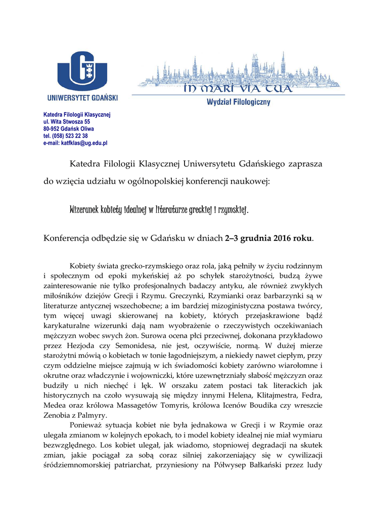 Katedra Filologii Klasycznej ul. Wita Stwosza 55 80-952 Gdańsk Oliwa tel. (058) 523 22 38 e-mail: [email protected] Katedra Filologii Klasycznej Uniwersytetu Gdańskiego zaprasza do wzięcia udziału w ogólnopolskiej konferencji naukowej: Wizerunek kobiety idealnej w literaturze greckiej i rzymskiej. rzymskiej Konferencja odbędzie się w Gdańsku w dniach 2–3 grudnia 2016 roku. Kobiety świata grecko-rzymskiego oraz rola, jaką pełniły w życiu rodzinnym i społecznym od epoki mykeńskiej aż po schyłek starożytności, budzą żywe zainteresowanie nie tylko profesjonalnych badaczy antyku, ale również zwykłych miłośników dziejów Grecji i Rzymu. Greczynki, Rzymianki oraz barbarzynki są w literaturze antycznej wszechobecne; a im bardziej mizoginistyczna postawa twórcy, tym więcej uwagi skierowanej na kobiety, których przejaskrawione bądź karykaturalne wizerunki dają nam wyobrażenie o rzeczywistych oczekiwaniach mężczyzn wobec swych żon. Surowa ocena płci przeciwnej, dokonana przykładowo przez Hezjoda czy Semonidesa, nie jest, oczywiście, normą. W dużej mierze starożytni mówią o kobietach w tonie łagodniejszym, a niekiedy nawet ciepłym, przy czym oddzielne miejsce zajmują w ich świadomości kobiety zarówno wiarołomne i okrutne oraz władczynie i wojowniczki, które uzewnętrzniały słabość mężczyzn oraz budziły u nich niechęć i lęk. W orszaku zatem postaci tak literackich jak historycznych na czoło wysuwają się między innymi Helena, Klitajmestra, Fedra, Medea oraz królowa Massagetów Tomyris, królowa Icenów Boudika czy wreszcie Zenobia z Palmyry. Ponieważ sytuacja kobiet nie była jednakowa w Grecji i w Rzymie oraz ulegała zmianom w kolejnych epokach, to i model kobiety idealnej nie miał wymiaru bezwzględnego. Los kobiet ulegał, jak wiadomo, stopniowej degradacji na skutek zmian, jakie pociągał za sobą coraz silniej zakorzeniający się w cywilizacji śródziemnomorskiej patriarchat, przyniesiony na Półwysep Bałkański przez ludy indoeuropejskie (m.in. Miniów, Lapitów) już w pierwszej połowie III tysiąclecia przed Chr. Jednakże największe w tym względzie znaczenie odegrali dopiero przybyli ponad tysiąc lat później Achajowie, a po nich Dorowie. Celem konferencji jest próba wydobycia i rekonstrukcji w oparciu o greckie i rzymskie źródła literackie wzorca kobiety idealnej, czyli kobiety odznaczającej się areté, będącej uosobieniem cnót. Obiektem rozważań ma być zatem galeria kobiecych postaci wykreowanych zarówno przez greckich i rzymskich poetów, jak i prozaików, czyli boginie, matki, żony, kochanki, władczynie, wojowniczki, poetki czy wreszcie uczone. Natomiast proponowanymi zagadnieniami są m.in.: ewolucja i deformacja kobiecego ideału w określonych epokach i gatunkach literackich; niewieście przymioty mieszczące się w szerokim pojęciu areté; kobieta jako obiekt kreacji literackiej; symbolika, archetyp oraz stereotyp kobiety i kobiecości. Propozycje tematów wraz ze streszczeniem proszę przesłać na adres Katedry Filologii Klasycznej UG pocztą elektroniczną ([email protected]) lub zwykłą (ul. Wita Stwosza 55, 80-952 Gdańsk) w terminie do końca czerwca 2016 roku. Przewidywany czas na wystąpienie Referenta – 20 minut. Opłata konferencyjna – ok. 550 zł (w koszty wliczone są noclegi ze śniadaniem, wyżywienie, druk - monografia). Informacje organizacyjne wraz z dokładnymi kosztami zostaną Państwu przekazane po weryfikacji wszystkich otrzymanych zgłoszeń. Zapraszamy serdecznie prof. UG, dr hab. Anna Marchewka mgr Aleksandra Hołomej (sekretarz)
