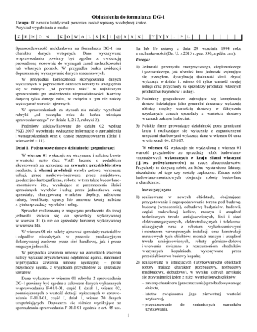 Objaśnienia do formularza DG-1 Uwaga: W e-mailu każdy znak powinien zostać wpisany w odrębnej kratce. Przykład wypełniania e-maila: Z E N O N . K O W A L S K I @ X X X Sprawozdawczość meldunkowa na formularzu DG-1 ma charakter danych wstępnych. Dane wykazywane w sprawozdaniu powinny być zgodne z ewidencją prowadzoną stosownie do wymagań zasad rachunkowości lub własnych potrzeb. W przypadku braku ewidencji dopuszcza się wykazywanie danych szacunkowych. . Y Y Y . P L 1a lub 1b ustawy z dnia 29 września 1994 roku o rachunkowości (Dz. U. z 2013 r. poz. 330, z późn. zm.). Uwaga: 1) Jednostki przemysłu energetycznego, ciepłowniczego i gazowniczego, jak również inne jednostki zajmujące się przesyłem, dystrybucją (jednostki sieci, zbytu) wykazują w dziale 1, wiersz 01 tylko wartość swojej usługi oraz przychody ze sprzedaży produkcji własnych produktów (wyrobów i usług). W przypadku konieczności skorygowania danych wykazanych w poprzednich okresach korekty te uwzględnia się w rubryce ,,od początku roku” w najbliższym sprawozdaniu po stwierdzeniu nieprawidłowości. Korekty dotyczą tylko danego roku, w związku z tym nie należy wykazywać wartości ujemnych. W sprawozdaniach za styczeń nie należy wypełniać rubryki ,,od początku roku do końca miesiąca sprawozdawczego” (w dziale 1, 2 i 3, rubryki 2). 2) Podmioty gospodarcze zajmujące się kompletacją dostaw i działające jako generalni dostawcy wykazują różnicę między wartością dostawy w faktycznie uzyskanych cenach sprzedaży a wartością dostawy w cenach zakupu (nabycia). Podmioty zaklasyfikowane do działu 02 według PKD 2007 wypełniają wyłącznie informacje o zatrudnieniu i wynagrodzeniach oraz o czasie przepracowanym (dział 1 wiersze 06 – 11). 3) Polskie firmy prowadzące działalność poza granicami kraju i rozliczające się wyłącznie z zagranicznymi urzędami skarbowymi wykazują dane w wierszu 01 oraz w wierszach 04, 05 i 07. Dział 1. Podstawowe dane o działalności gospodarczej W wierszu 02 wykazuje się wydzieloną z wiersza 01 wartość przychodów ze sprzedaży robót budowlano-montażowych wykonanych w kraju siłami własnymi (tj. bez podwykonawców) na rzecz zleceniodawców. Przychody te dotyczą robót, za które wystawiono faktury, niezależnie od tego czy zostały zapłacone. Zakres robót budowlano-montażowych obejmuje roboty budowlane o charakterze: W wierszu 01 wykazuje się otrzymane i należne kwoty w wartości netto (bez VAT, łącznie z podatkiem akcyzowym) za sprzedane na zewnątrz przedsiębiorstwa produkty, tj. własnej produkcji wyroby gotowe, wykonane usługi, prace naukowo-badawcze, prace projektowe, geodezyjno-kartograficzne, roboty, w tym także budowlano-montażowe itp., wynikające z przemnożenia ilości sprzedanych wyrobów i usług przez jednostkową cenę sprzedaży, skorygowaną o należne dopłaty, udzielone rabaty, bonifikaty, opusty lub umowne kwoty należne z tytułu sprzedaży wyrobów i usług. inwestycyjnym: 1) realizowane w nowych obiektach, obejmujące: przygotowanie i zagospodarowanie terenu pod budowę, budowę (wznoszenie), odbudowę budynków, budowli, części budowlanej kotłów, maszyn i urządzeń technicznych trwale umiejscowionych, linii i sieci elektroenergetycznych, elektrotrakcyjnych i telekomunikacyjnych wraz z robotami wykończeniowymi i montażem wewnętrznych instalacji oraz konstrukcji metalowych tych obiektów, montaż maszyn i urządzeń trwale umiejscowionych, roboty górniczo-dołowe i wiercenia związane z rozszerzeniem chodników w czynnych kopalniach, wykonywane przez przedsiębiorstwa budowy kopalń; Sprzedaż realizowaną z magazynu producenta do innej jednostki zalicza się do sprzedaży wykazywanej w wierszu 01 (a nie do sprzedaży hurtowej wykazywanej w wierszu 14). W wierszu 01 nie należy ujmować sprzedaży materiałów i odpadów niezużytych w procesie produkcyjnym dokonywanej zarówno przez sieć handlową, jak i przez magazyn jednostki. W przypadku zawarcia umowy na warunkach zlecenia należy wykazać zryczałtowaną odpłatność agenta, natomiast w przypadku zawarcia umowy agencyjnej – pełne przychody agenta, z wyjątkiem przychodów ze sprzedaży towarów. 2) realizowane w istniejących (użytkowanych) obiektach roboty mające charakter przebudowy, rozbudowy (nadbudowy, dobudowy), w wyniku których uzyskuje się przynajmniej jeden z niżej wymienionych efektów: Dane wykazane w wierszu 01 rubryka 2 sprawozdania DG-1 powinny być zgodne z zakresem danych wykazanych w sprawozdaniu F-01/I-01, część I, dział 1, wiersz 02, pomniejszonych o wartość dotacji wykazanych w sprawozdaniu F-01/I-01, część I, dział 1, wiersz 70 danych uzupełniających. Dopuszcza się różnice wynikające ze sporządzania sprawozdania F-01/I-01 zgodnie z art. 45 ust. – zmianę charakteru (przeznaczenia) przebudowywanego obiektu, – istotne zwiększenie jego pierwotnej wartości użytkowej, – przystosowanie do zmienionych warunków użytkowania, 1 – wydłużenie okresu jego użytkowania, – obniżenie kosztów eksploatacji bądź poprawę jakości usług czy procesów produkcyjnych prowadzonych w tym obiekcie; o zaliczeniu tych robót do inwestycji decydują kryteria rzeczowe (techniczne), a nie finansowe; Dane wykazane w wierszu 05 rubryka 2 sprawozdania DG-1 powinny być zgodne z zakresem danych wykazanych w sprawozdaniu F-01/I-01, część I, dział 1, wiersz 06. Dopuszcza się różnice wynikające ze sporządzania sprawozdania F-01/I-01 zgodnie z art. 45 ust. 1a lub 1b ustawy z dnia 29 września 1994 roku o rachunkowości. remontowym, tj. roboty budowlane prowadzone w istniejących obiektach budowlanych, polegające na odtwarzaniu (przywracaniu) pierwotnego lub prawie pierwotnego stanu (wartości technicznej i użytkowej), wykraczające poza zakres bieżących konserwacji, niepowodujące jednak zmian w użytkowaniu tych obiektów ani w ich konstrukcji; demontaż i ponowny montaż kotłów, 