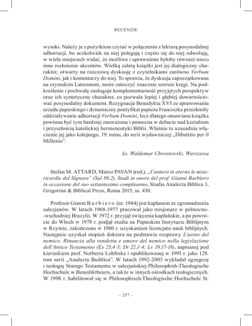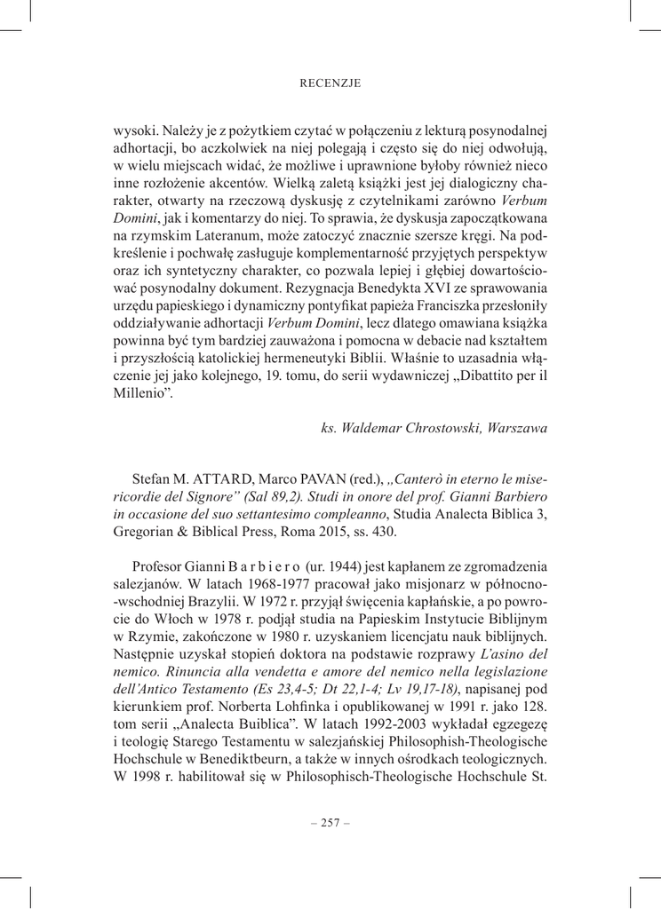 RECENZJE wysoki. Należy je z pożytkiem czytać w połączeniu z lekturą posynodalnej adhortacji, bo aczkolwiek na niej polegają i często się do niej odwołują, w wielu miejscach widać, że możliwe i uprawnione byłoby również nieco inne rozłożenie akcentów. Wielką zaletą książki jest jej dialogiczny charakter, otwarty na rzeczową dyskusję z czytelnikami zarówno Verbum Domini, jak i komentarzy do niej. To sprawia, że dyskusja zapoczątkowana na rzymskim Lateranum, może zatoczyć znacznie szersze kręgi. Na podkreślenie i pochwałę zasługuje komplementarność przyjętych perspektyw oraz ich syntetyczny charakter, co pozwala lepiej i głębiej dowartościować posynodalny dokument. Rezygnacja Benedykta XVI ze sprawowania urzędu papieskiego i dynamiczny pontyfikat papieża Franciszka przesłoniły oddziaływanie adhortacji Verbum Domini, lecz dlatego omawiana książka powinna być tym bardziej zauważona i pomocna w debacie nad kształtem i przyszłością katolickiej hermeneutyki Biblii. Właśnie to uzasadnia włączenie jej jako kolejnego, 19. tomu, do serii wydawniczej „Dibattito per il Millenio”. ks. Waldemar Chrostowski, Warszawa Stefan M. ATTARD, Marco PAVAN (red.), „Canterò in eterno le misericordie del Signore” (Sal 89,2). Studi in onore del prof. Gianni Barbiero in occasione del suo settantesimo compleanno, Studia Analecta Biblica 3, Gregorian & Biblical Press, Roma 2015, ss. 430. Profesor Gianni B a r b i e r o (ur. 1944) jest kapłanem ze zgromadzenia salezjanów. W latach 1968-1977 pracował jako misjonarz w północno-wschodniej Brazylii. W 1972 r. przyjął święcenia kapłańskie, a po powrocie do Włoch w 1978 r. podjął studia na Papieskim Instytucie Biblijnym w Rzymie, zakończone w 1980 r. uzyskaniem licencjatu nauk biblijnych. Następnie uzyskał stopień doktora na podstawie rozprawy L’asino del nemico. Rinuncia alla vendetta e amore del nemico nella legislazione dell’Antico Testamento (Es 23,4-5; Dt 22,1-4; Lv 19,17-18), napisanej pod kierunkiem prof. Norberta Lohfinka i opublikowanej w 1991 r. jako 128. tom serii „Analecta Buiblica”. W latach 1992-2003 wykładał egzegezę i teologię Starego Testamentu w salezjańskiej Philosophish-Theologische Hochschule w Benediktbeurn, a także w innych ośrodkach teologicznych. W 1998 r. habilitował się w Philosophisch-Theologische Hochschule St. – 257 – RECENZJE Georgen we Frankfurcie nad Menem na podstawie rozprawy Das Reich JHWHs und seines Gesalbten. Eine synchrone Lektüre des hebräischen ersten Psalmenbuches (Ps 1-41), opublikowanej pod tytułem Das erste Psalmen als Einheit. Eine synchrone Analyse von Psalm 1-41. Od 2004 r. jest profesorem zwyczajnym na Papieskim Instytucie Biblijnym. W celu uczczenia 70. rocznicy urodzin profesora dwaj jego uczniowie przygotowali okolicznościową księgę pamiątkową. Jej tytuł, cytując Ps 89,2 („Będę opiewał na wieki miłosierdzie Pana”), wyraża postawę duchową, a zarazem streszcza główne naukowe zainteresowania jubilata, skoncentrowane wokół starotestamentowych ksiąg mądrościowych, zwłaszcza Księgi Psalmów i Pieśni nad pieśniami. Stefan M. A t a r d (ur. 1972), absolwent Papieskiego Instytutu Biblijnego, który uzyskał doktorat na podstawie dysertacji The Structural Scheme Ordering Book II of the Psalter (Psalms 42-72) – A Synchronic Avalysis, jest wykładowcą Starego Testamentu na Uniwersytecie Maltańskim. Marco P a v a n (ur. 1975) napisał rozprawę doktorską „He remembered that they were but flesh, a breath that passes and does not return” (Ps 78,39). The Theme of Memory and Forgetting in the Third Book of Psalter (Pss 73-89), wydaną w 2014 r. we Frankfurcie. Praca ukazała się jako 3. tom serii wydawniczej „Studia Analecta Biblica 3”. Rzut oka na tytuły obydwu rozpraw doktorskich wskazuje, że podejmują problematykę zapoczątkowaną w rozprawie habilitacyjnej jubilata, skupiając się na synchronicznej analizie kolejnych dwóch części Księgi Psalmów. Książkę otwiera zwięzła prezentacja jubilata (s. I), którą napisał prof. José Maria Abrego de L a c y, rektor Papieskiego Instytutu Biblijnego w latach 2008-2014. Potem następuje Wstęp (s. III-VII) autorstwa obu redaktorów, w którym wyjaśniają tytuł i streszczają jej zawartość. Zapowiadają, że wszystkie teksty zostały uporządkowane tematycznie zgodnie z porządkiem ksiąg świętych ustalonym w Biblii Hebrajskiej, jednak ich zwięzła prezentacja różni się od kolejności, w jakiej pojawiają się w książce. Część czwartą stanowi dodatek z przyczynkiem na temat Nowego Testamentu i hermeneutyki biblijnej. Po wstępie autorstwa redaktorów umieszczono biografię (s. IX-XI) oraz bibliografię publikacji (s. XII-XXI) prof. Gianni Barbiero, wyszczególniającą 9 monografii i ponad 100 artykułów naukowych i popularnonaukowych w czasopismach i pracach zbiorowych. Z kolei na stronicach XXIII-XXIX umieszczono wykaz skrótów. Zgodnie z zapowiedzią redaktorów, książka składa się z czterech części. Część pierwsza (s. 1-86), zatytułowana Torah, dotyczy Pięcioksięgu i zawiera cztery artykuły. Otwiera ją tekst Exode 32,7-14 – Moȉse et la memoire – 258 – RECENZJE de Dieu, który napisał Jean-Louis S k a, (s. 3-19). Nawiązując do badań podjętych niegdyś przez jubilata, dokonuje analizy Wj 32–24, skupiając się na perykopie 32,7-14, w której upatruje późniejszy dodatek mający na celu połączenie tradycji o wyjściu z Egiptu z tradycjami o patriarchach. Georg B r a u l i k OSB napisał przyczynek Die allgemeine Gesetzesparänese and das „paränetische Schema” im Buch Deuteronomium (s. 21-50), w którym omawia „zachęty prawne” (Gesetzesparänese), skupiając uwagę na 14 wybranych przypadkach, ukazując ich miejsce i funkcje w kontekście „schematu parenetycznego” obecnego w Księdze Powtórzonego Prawa. Drugi rozdział Księgi Powtórzonego Prawa jest przedmiotem studi