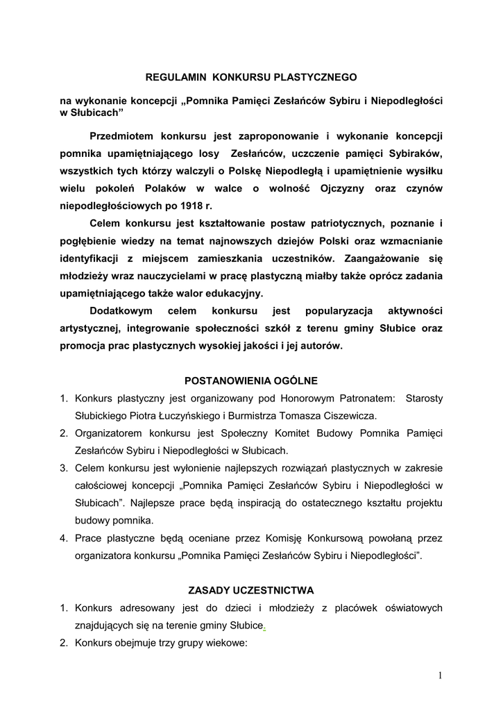 REGULAMIN KONKURSU PLASTYCZNEGO na wykonanie koncepcji „Pomnika Pamięci Zesłańców Sybiru i Niepodległości w Słubicach” Przedmiotem konkursu jest zaproponowanie i wykonanie koncepcji pomnika upamiętniającego losy Zesłańców, uczczenie pamięci Sybiraków, wszystkich tych którzy walczyli o Polskę Niepodległą i upamiętnienie wysiłku wielu pokoleń Polaków w walce o wolność Ojczyzny oraz czynów niepodległościowych po 1918 r. Celem konkursu jest kształtowanie postaw patriotycznych, poznanie i pogłębienie wiedzy na temat najnowszych dziejów Polski oraz wzmacnianie identyfikacji z miejscem zamieszkania uczestników. Zaangażowanie się młodzieży wraz nauczycielami w pracę plastyczną miałby także oprócz zadania upamiętniającego także walor edukacyjny. Dodatkowym celem konkursu jest popularyzacja aktywności artystycznej, integrowanie społeczności szkół z terenu gminy Słubice oraz promocja prac plastycznych wysokiej jakości i jej autorów. POSTANOWIENIA OGÓLNE 1. Konkurs plastyczny jest organizowany pod Honorowym Patronatem: Starosty Słubickiego Piotra Łuczyńskiego i Burmistrza Tomasza Ciszewicza. 2. Organizatorem konkursu jest Społeczny Komitet Budowy Pomnika Pamięci Zesłańców Sybiru i Niepodległości w Słubicach. 3. Celem konkursu jest wyłonienie najlepszych rozwiązań plastycznych w zakresie całościowej koncepcji „Pomnika Pamięci Zesłańców Sybiru i Niepodległości w Słubicach”. Najlepsze prace będą inspiracją do ostatecznego kształtu projektu budowy pomnika. 4. Prace plastyczne będą oceniane przez Komisję Konkursową powołaną przez organizatora konkursu „Pomnika Pamięci Zesłańców Sybiru i Niepodległości”. ZASADY UCZESTNICTWA 1. Konkurs adresowany jest do dzieci i młodzieży z placówek oświatowych znajdujących się na terenie gminy Słubice. 2. Konkurs obejmuje trzy grupy wiekowe: 1 I grupa - uczniowie klas IV-VI szkoły podstawowej, II grupa - uczniowie klas I-III gimnazjum, III grupa - uczniowie szkół ponadgimnazjalnych. 3. Liczba uczestników konkursu nie jest ograniczona. 4. Prace można zgłaszać nie tylko jako prace indywidualne, ale także jako zbiorowe oraz w imieniu szkoły. 5. Każdy uczestnik może przedstawić kilka prac (kategoria: konkurs plastyczny – rysunek, grafika, malarstwo, rzeźba). 6. Konkurs polega na wykonaniu dowolną techniką plastyczną projektu pomnika 7. Projekt pomnika może być wykonany dowolną techniką plastyczną (rysunek, grafika, malarstwo, rzeźba). Format prac powinien być nie mniejszy niż A3 i nie większy niż A1, a w przypadku prac przestrzennych całość powinna się mieścić w maksymalnych wymiarach 80 x 80 x 80 cm. 8. Przyjmowane będą tylko prace w opisanym: „Konkurs na Pomnik Pamięci Zesłańców Sybiru i Niepodległości w Słubicach” sygnowane (pseudonimem obranym przez autora pracy). Do pracy należy godłem dołączyć zaklejoną, opatrzoną godłem kopertę z danymi autora pracy (nazwiskiem i imieniem, datą urodzenia, adresem zamieszkania, nazwą szkoły) 9. Prace konkursowe należy umieścić w nieprzejrzystym, zamkniętym opakowaniu, w którym znajdować się może tylko jedna, praca konkursowa opatrzona jedynie godłem. 10. Pracę konkursowe należy dostarczyć osobiście lub za pośrednictwem poczty na adres Urzędu Miejskiego (ul. Akademicka 1 69-100 Słubice) do dnia 31 maja 2015 r. 11. Komisja konkursowa zastrzega, że prace o charakterze kpiarskim lub humorystycznym nie będą dopuszczone. 12. Do 30 czerwca 2015 r. Komisja Konkursowa wyłoni laureatów konkursu. 13. Komisja konkursowa uwzględniać będzie w ocenie prac: zrozumienie tematu i pomysłowość w ujęciu tematu, przekaz i walory artystyczne, pomysłowość i oryginalność wykonania pracy, wykorzystanie różnorodnych technik plastycznych, styl realizacji, dbałość o formalną poprawność przekazu, 2 staranność wykonania pracy. 14. Ze swoich prac komisja sporządzi protokół, który zostanie upubliczniony. 15. Dyrektorzy szkół, opiekunowie uczniów oraz laureaci zostaną powiadomieni o wynikach konkursu, terminie wręczenia nagród i otwarciu wystawy pokonkursowej odrębnym pismem. 16. Rozdanie nagród nastąpi do 30 września 2015 r. w Urzędzie Miejskim w Słubicach. 17. Szkoły biorące udział w konkursie otrzymają Dyplomy Uczestnictwa. 18. Laureaci konkursu otrzymają dyplomy i nagrody rzeczowe. 19. Prace plastyczne wykonane przez laureatów konkursu „Pomnika Pamięci Zesłańców Sybiru i Niepodległości w Słubicach” zostaną zaprezentowane na wystawie pokonkursowej w Urzędzie Miejskim w Słubicach a także opublikowane na stronie internetowej Urzędu Miejskiego. POSTANOWIENIA KOŃCOWE 1. Udział w konkursie jest jednoznaczny z akceptacją Regulaminu Konkursu oraz ze zgodą na przetwarzanie danych osobowych uczestnika dla celów organizacyjnych konkursu. 2. Organizatorzy nie zwracają nadesłanych prac i zastrzegają sobie prawo do ich wykorzystania w celach publikacji. 3. Organizatorzy zastrzegają sobie prawo do opublikowania zdjęć z przebiegu konkursu. 4. Do pracy powinna być dołączona zgoda na publiczną prezentację i dalsze wykorzystanie pracy konkursowej do wypracowania ostatecznej koncepcji budowy pomnika tworzącej harmonijną całość z terenem – nasadzeniem drzew. Pomnik będzie usytuowany na istniejącym Placu Sybiraków. 5. Uczestnicy mogą uzyskać dodatkowe informacje u Wiesława Zackiewicza, tel. 95 737 20 74 i Krzysztofa Nowikiewicza tel. 95 737 20 55. 6. Organizatorzy konkursu nie odpowiadają za jakiekolwiek skutki niedokładności, niekompletności lub nieprawidłowości danych i informacji podanych przez uczestnika w karcie zgłoszeniowej. 7. Do pracy komisji konkursowej przewodniczący komisji może zaprosić, z głosem doradczym, osoby posiadające specjalistyczną wiedzę w dziedzinie wiedzy plastycznej i historycznej. 3 Metryczka uczestnika konkursu plastycznego „Pomnika Pamięci Zesłańców Sybiru i Niepo