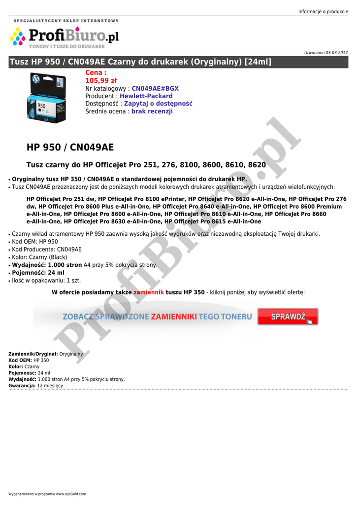 Informacje o produkcie Utworzono 03-03-2017 Tusz HP 950 / CN049AE Czarny do drukarek (Oryginalny) [24ml] Cena : 105,99 zł o. pl Nr katalogowy : CN049AE#BGX Producent : Hewlett-Packard Dostępność : Zapytaj o dostępność Średnia ocena : brak recenzji HP 950 / CN049AE Tusz czarny do HP Officejet Pro 251, 276, 8100, 8600, 8610, 8620 ● ● Oryginalny tusz HP 350 / CN049AE o standardowej pojemności do drukarek HP. Tusz CN049AE przeznaczony jest do poniższych modeli kolorowych drukarek atramentowych i urządzeń wielofunkcyjnych: ● ● ● ● ● ● Czarny wkład atramentowy HP 950 zaewnia wysoką jakość wydruków oraz niezawodną eksploatację Twojej drukarki. Kod OEM: HP 950 Kod Producenta: CN049AE Kolor: Czarny (Black) Wydajność: 1.000 stron A4 przy 5% pokrycia strony. Pojemność: 24 ml Ilość w opakowaniu: 1 szt. iB ● iu r HP OfficeJet Pro 251 dw, HP OfficeJet Pro 8100 ePrinter, HP OfficeJet Pro 8620 e-All-in-One, HP OfficeJet Pro 276 dw, HP OfficeJet Pro 8600 Plus e-All-in-One, HP OfficeJet Pro 8640 e-All-in-One, HP OfficeJet Pro 8600 Premium e-All-in-One, HP OfficeJet Pro 8600 e-All-in-One, HP OfficeJet Pro 8610 e-All-in-One, HP OfficeJet Pro 8660 e-All-in-One, HP OfficeJet Pro 8630 e-All-in-One, HP OfficeJet Pro 8615 e-All-in-One Pr of W ofercie posiadamy także zamiennik tuszu HP 350 - kliknij poniżej aby wyświetlić ofertę: Zamiennik/Oryginał: Oryginalny Kod OEM: HP 350 Kolor: Czarny Pojemność: 24 ml Wydajność: 1.000 stron A4 przy 5% pokryciu strony. Gwarancja: 12 miesięcy Wygenerowano w programie www.oscGold.com
