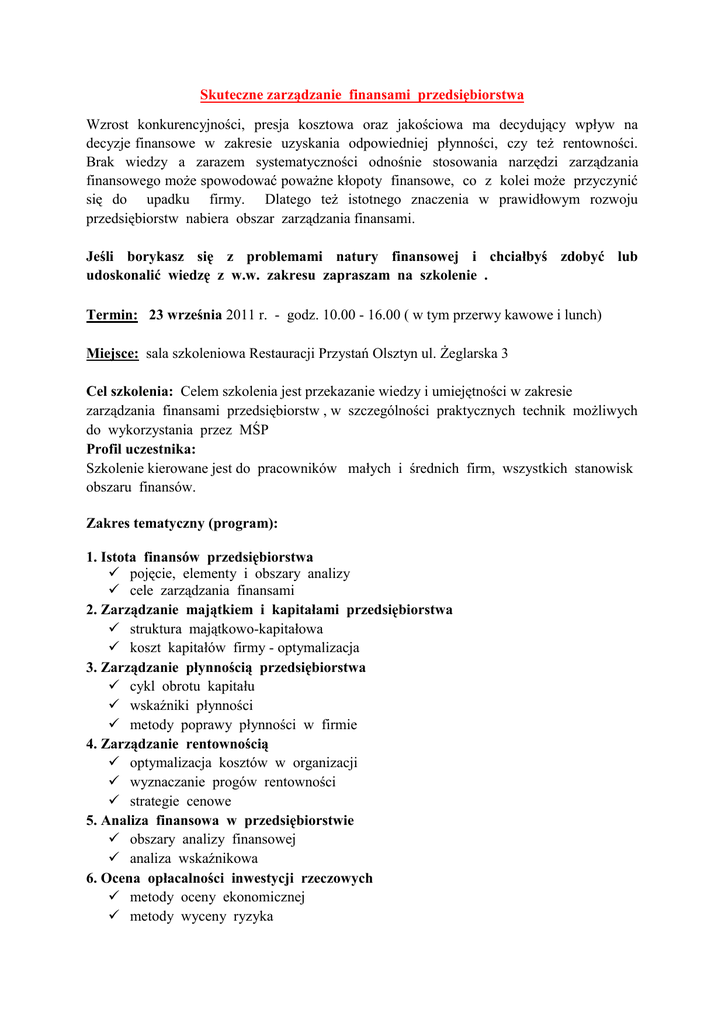 Skuteczne zarządzanie finansami przedsiębiorstwa Wzrost konkurencyjności, presja kosztowa oraz jakościowa ma decydujący wpływ na decyzje finansowe w zakresie uzyskania odpowiedniej płynności, czy też rentowności. Brak wiedzy a zarazem systematyczności odnośnie stosowania narzędzi zarządzania finansowego może spowodować poważne kłopoty finansowe, co z kolei może przyczynić się do upadku firmy. Dlatego też istotnego znaczenia w prawidłowym rozwoju przedsiębiorstw nabiera obszar zarządzania finansami. Jeśli borykasz się z problemami natury finansowej i chciałbyś zdobyć lub udoskonalić wiedzę z w.w. zakresu zapraszam na szkolenie . Termin: 23 września 2011 r. - godz. 10.00 - 16.00 ( w tym przerwy kawowe i lunch) Miejsce: sala szkoleniowa Restauracji Przystań Olsztyn ul. Żeglarska 3 Cel szkolenia: Celem szkolenia jest przekazanie wiedzy i umiejętności w zakresie zarządzania finansami przedsiębiorstw , w szczególności praktycznych technik możliwych do wykorzystania przez MŚP Profil uczestnika: Szkolenie kierowane jest do pracowników małych i średnich firm, wszystkich stanowisk obszaru finansów. Zakres tematyczny (program): 1. Istota finansów przedsiębiorstwa pojęcie, elementy i obszary analizy cele zarządzania finansami 2. Zarządzanie majątkiem i kapitałami przedsiębiorstwa struktura majątkowo-kapitałowa koszt kapitałów firmy - optymalizacja 3. Zarządzanie płynnością przedsiębiorstwa cykl obrotu kapitału wskaźniki płynności metody poprawy płynności w firmie 4. Zarządzanie rentownością optymalizacja kosztów w organizacji wyznaczanie progów rentowności strategie cenowe 5. Analiza finansowa w przedsiębiorstwie obszary analizy finansowej analiza wskaźnikowa 6. Ocena opłacalności inwestycji rzeczowych metody oceny ekonomicznej metody wyceny ryzyka Metody dydaktyczne: podczas szkolenia stosowane będą metody interaktywne. Będą mieli możliwość zdobyć wiedzę teoretyczną, a jednocześnie przećwiczyć ją i zdobyć nowe umiejętności. Podczas szkolenia będą wykorzystywane takie metody jak: gry szkoleniowe, dyskusje , burza mózgów, a także wykład. Materiały dydaktyczne: ekspert przygotowuje komplet materiałów do ćwiczeń. Ekspert wykorzystuje tylko profesjonalne, autorskie opracowania. Każdy z uczestników otrzyma komplet materiałów szkoleniowych. Ekspert: Waldemar Kozłowski - doktor nauk ekonomicznych, adiunkt UWM, menedżer posiadający kilkunastoletnie doświadczenie zawodowe w korporacji, autor książki „Zarządzanie inwestycjami rzeczowymi”. Wieloletni uznany trener, doskonale łączący teoretyczne i praktyczne aspekty funkcjonowania rynku finansowego. Ekspert z dziedziny ekonomii oraz zarządzania inwestycjami rzeczowymi. Rezultaty szkolenia: uczestnicy nabędą wiedzę i umiejętności w zakresie zarządzania finansami a w szczególności: wiedzę z zakresu analizy finansowej, zarządzania płynnością, zarządzania rentownością, wiedzę z zakresu oceny opłacalności inwestycji rzeczowych umiejętność stosowania praktycznych technik zarządzania finansami , w szczególności odnoszących się do takich obszarów jak: płynność, rentowność, koszty, ceny umiejętność oceny opłacalności inwestycji rzeczowych , wdrażania do powszechnego stosowania metod usprawniających zarządzanie finansami Każdy z uczestników otrzyma zaświadczenie o udziale w szkoleniu. Cena: 399 zł + 23% VAT ( cena obejmuje komplet materiałów szkoleniowych, udział w szkoleniu, wyżywienie – kawa/herbata oraz lunch). Osoba do kontaktu: Mariola Stefaniak W-MARR S.A. w Olsztynie Tel. 89 521 12 53 [email protected] Zapraszamy!