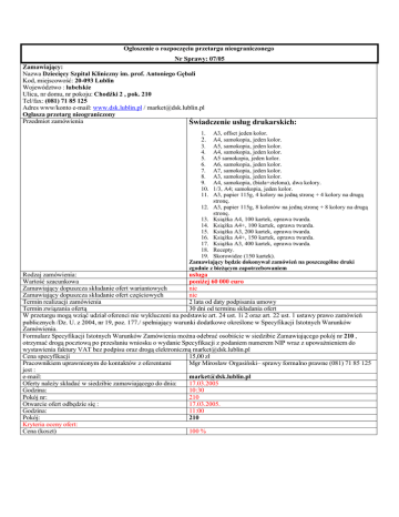 Ogłoszenie o rozpoczęciu przetargu nieograniczonego Nr Sprawy: 07/05 Zamawiający: Nazwa Dziecięcy Szpital Kliniczny im. prof. Antoniego Gębali Kod, miejscowość: 20-093 Lublin Województwo : lubelskie Ulica, nr domu, nr pokoju: Chodźki 2 , pok. 210 Tel/fax: (081) 71 85 125 Adres www/konto e-mail: www.dsk.lublin.pl / [email protected] Ogłasza przetarg nieograniczony Przedmiot zamówienia Świadczenie usług drukarskich: 1. A3, offset jeden kolor. A4, samokopia, jeden kolor. 3. A5, samokopia, jeden kolor. 4. A4, samokopia, jeden kolor. 5. A5 samokopia, jeden kolor. 6. A6, samokopia, jeden kolor. 7. A7, samokopia, jeden kolor. 8. A3, samokopia, jeden kolor. 9. A4, samokopia, (biała+zielona), dwa kolory. 10. 1/3, A4; samokopia, jeden kolor. 11. A3, papier 115g, 4 kolory na jedną stronę + 4 kolory na drugą stronę. 12. A3, papier 115g, 8 kolorów na jedną stronę + 8 kolory na drugą stronę. 13. Książka A4, 100 kartek, oprawa twarda. 14. Książka A4+, 100 kartek, oprawa twarda. 15. Książka A3, 200 kartek, oprawa twarda. 16. Książka A4+, 150 kartek, oprawa twarda. 17. Książka A3, 400 kartek, oprawa twarda. 18. Recepty. 19. Skorowidze (150 kartek). Zamawiający będzie dokonywał zamówień na poszczególne druki zgodnie z bieżącym zapotrzebowaniem 2. Rodzaj zamówienia: usługa Wartość szacunkowa poniżej 60 000 euro Zamawiający dopuszcza składanie ofert wariantowych nie Zamawiający dopuszcza składanie ofert częściowych nie Termin realizacji zamówienia 2 lata od daty podpisania umowy Termin związania ofertą 30 dni od terminu składania ofert W przetargu mogą wziąć udział oferenci nie wykluczeni na podstawie art. 24 ust. 1i 2 oraz art. 22 ust. 1 ustawy prawo zamówień publicznych /Dz. U. z 2004, nr 19, poz. 177./ spełniający warunki dodatkowe określone w Specyfikacji Istotnych Warunków Zamówienia. Formularz Specyfikacji Istotnych Warunków Zamówienia można odebrać osobiście w siedzibie Zamawiającego pokój nr 210 , otrzymać drogą pocztową po przesłaniu wniosku o wydanie Specyfikacji z podaniem numerem NIP wraz z upoważnieniem do wystawienia faktury VAT bez podpisu oraz drogą elektroniczną [email protected] Cena specyfikacji 15,00 zł Pracownikiem uprawnionym do kontaktów z oferentami Mgr Mirosław Orgasiński– sprawy formalno prawne (081) 71 85 125 jest : e-mail: [email protected] Oferty należy składać w siedzibie zamawiającego do dnia: 17.03.2005 Godzina: 10:30 Pokój nr: 210 Otwarcie ofert odbędzie się : 17.03.2005. Godzina: 11:00 Pokój: 210 Kryteria oceny ofert: Cena (koszt) 100 %
