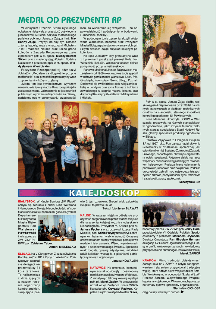 Medal od Prezydenta RP W elbląskim Urzędzie Stanu Cywilnego odbyła się niebywała uroczystość poświęcona jubileuszowi 50-lecia pożycia małżeńskiego państwa ppłk mgr Janusza Zająca i inż. Marianny Zając. Przybyli na nią: syn Tomasz z żoną Izabelą, wraz z wnuczkami Michałem 7 lat i maleńką Natalią oraz liczne grono kolegów z Zarządu Rejonowego na czele z prezesem ppłk w st. spocz. Mieczysławem Sikiem oraz z macierzystego Koła im. Rodziny Nalazków z prezesem ppłk w st. spocz. Władysławem Wierzbickim. Prezydent Rzeczpospolitej odznaczył Jubilatów „Medalem za długoletnie pożycie małżeńskie” oraz przesłał list gratulacyjny wraz z życzeniami w którym czytamy: „Medal ten jest symbolicznym wyrazem uznania jakie żywią władze Rzeczpospolitej dla życia rodzinnego. Odznaczenie to jest również publicznym wyrazem wdzięczności za ofiarny, codzienny trud w pokonywaniu przeciwności losu, za wspieranie się wzajemne – za odpowiedzialność i poświęcenie w budowaniu i umacnianiu rodziny”. W podobnym tonie życzenia złożyli Wojewoda Warmińsko-Mazurski oraz Prezydent Miasta Elbląga gratulując wytrwania w dobrych i złych czasach dając przykład kolejnym pokoleniom. Na ręce Jubilatów listy gratulacyjne wraz z życzeniami przekazali prezesi Koła, kol. Wierzbicki i kol. Sik. Wniesiono toast za dalsza pomyślność pożycia małżeńskiego. Państwo Marianna i Janusz Zającowie są małżeństwem od 1959 roku, wspólne życie spędzili w różnych garnizonach: Warszawa, Łask, Piła, Grudziądz, Inowrocław, Śrem, Elbląg, Poznań. Dochowali się dwójki dzieci: córki Alicji zamieszkałej w Londynie oraz syna Tomasza żołnierza zawodowego w stopniu majora, lekarza oraz 4 wnucząt Katarzyny i Natalii oraz Maksymiliana i Michała. Ppłk w st. spocz. Janusz Zając służbę wojskową pełnił nieprzerwanie przez 38 lat na różnych stanowiskach w służbach technicznych, ostatnio na stanowisku starszego inspektora kontroli gospodarczej Sił Powietrznych. Zona Marianna ukończyła SGGW w Warszawie, pracowała na różnych stanowiskach w ogrodnictwie, jako: inżynier terenów zielonych, starszy specjalista s Stacji Hodowli Roślin, główny specjalista produkcji ogrodniczej w Elblągu. Państwo Zającowie z Elblągiem związani SA od 1997 roku. Pan Janusz nadal aktywnie uczestniczy w działalności społecznej, jest członkiem Komisji Socjalno-Zdrowotnej Zarządu Głównego, ponadto pełni obowiązki organizatora opieki specjalnej. Aktywnie działa na rzecz wspólnoty mieszkaniowej jest biegłym rewidentem księgowym. Posiada liczne odznaczenia państwowe, resortowe oraz związkowe. Podczas uroczystości zebrali moc najserdeczniejszych życzeń zdrowia, pomyślności w życiu rodzinnym i satysfakcji z pracy społecznej. Mieczysław SIK BIAŁYSTOK. W Klubie Seniora „SM Piaski” odbyło się zebranie z okazji Dnia Weterana i Narodowego Święta Niepodległości. W spotkaniu udział wzięli zaproszeni goście: Dyrektor Departamentu Prezydenta Miasta Białegostoku Pan Waldemar Pawłowski i wiceprezes ZW ZKRPiBWP por. Zdzisław Tabor. Antoni MIELESZKO ELBLĄG. Na V Okręgowym Zjeździe Związku Kombatantów RP i Byłych Więźniów Politycznych spotkali się delegaci reprezentujący 34 koła terenowe. To najliczniejsza z działających w naszym regionie organizacji kombatanckich, skupiająca pra- wie 2 tys. członków. Średni wiek członków związku, to prawie 86 lat. Tekst i foto Jerzy BŁAWAT KALISZ. W ratuszu miejskim odbyła się uroczystość zorganizowana przez władze miejskie dla uczczenia kolejnej rocznicy odzyskania Niepodległości. Prezydent m. Kalisza pan dr. Janusz Pęcherz oraz przewodnicząca Rady Miejskiej pani Adela Przybysz wręczyli zebranym kombatantom walk o wolność Ojczyzny oraz weteranom służby wojskowej pamiątkowe medale i listy uznania. Wśród wyróżnionych było 15 członków naszego Związku. Spotkanie miało bogatą oprawę artystyczną, młodzież szkół kaliskich wystąpiła z pieśniami patriotycznymi oraz wojskowymi. Janusz KOWALSKI KATOWICE. Na cmentarzu komunalnym został odsłonięty i poświęcony obelisk oznaczający Kwaterę Wojskową. Z inicjatywą o takową kwaterę wystąpił ppłk pil. Marek Zapiór. W uroczystości udział wzięli Zastępca Szefa WSzW Katowice płk. Krzysztof Radwan, Kapelan Ksiądz Prałat płk Mirosław Sułek, honorowy prezes ZW ZZWP ppłk Jerzy Góra, przedstawiciele VII Oddziału Polskich Spadochroniarzy z prezesem Marianem Brytanem, Dyrektor Cmentarza Pan Mirosław Herman, delegacja XV Liceum Ogólnokształcącego z klasy o profilu wojskowym ze swoim wykładowcą przysposobienia obronnego Czesławem Płonką. Marek ZAPIÓR KRAKÓW. Mimo trudności obiektywnych Zarząd koła nr 7 ZZWP, z całym zaangażowaniem i staraniem przygotował tradycyjną wigilię, która odbyła się w Wojewódzkim Sztabie Wojskowym, w obecności Szefa WSzW, Prezesa Zarządu Wojewódzkiego Związku, kapelana wojskowego. W rozmowach poruszano tematy bytowe i problemy organizacyjne. Stanisław CICHOSZ ciąg dalszy wewnątrz numeru