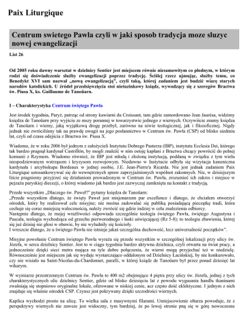 Paix Liturgique Centrum swietego Pawla czyli w jaki sposob tradycja moze sluzyc nowej ewangelizacji List 26 Od 2005 roku dawny warsztat w dzielnicy Sentier jest miejscem równie niesamowitym co płodnym, w którym rodzi się doświadczenie służby ewangelizacji poprzez tradycję. Ściślej rzecz ujmując, służby temu, co Benedykt XVI sam nazwał „nową ewangelizacją”, czyli taką, której zadaniem jest budzić wiarę starych narodów katolickich. U źródeł przedsięwzięcia stoi nietuzinkowy ksiądz, wywodzący się z szeregów Bractwa św. Piusa X, ks. Guillaume de Tanoüarn. I – Charakterystyka Centrum świętego Pawła Jest środek tygodnia, Paryż, patrząc od strony kawiarni du Croissant, tam gdzie zamordowano Jean Jaurèsa, widzimy księdza de Tanoüarn przy wyjściu ze mszy porannej w towarzystwie jednego z wiernych. Oczywiście znamy księdza de Tanoüarn i wiemy, jaką wyjątkową drogę przebył, zarówno na niwie teologicznej, jak i filozoficznej. Nigdy jednak nie zwróciliśmy tak na prawdę uwagii na jego posłannictwo w Centrum św. Pawła (CSP) od blisko siedmiu lat, czyli od czasu odejścia z Bractwa św. Piusa X. Wiadomo, że w roku 2006 był jednym z założycieli Instytutu Dobrego Pasterza (IBP), instytutu Ecclesia Dei, którego tak bardzo pragnął kardynał Castrillón, by mogli znaleźć w nim ostoję kapłani z Bractwa chcący powrócić do pełnej komunii z Rzymem. Wiadomo również, że IBP jest młodą i złożoną instytucją, poddaną w związku z tym wielu niespodziewanym wstrząsom i kryzysom rozwojowym. Niedawno w Instytucie odbyła się wizytacja kanoniczna kardynała i arcybiskupa Bordeaux w jednej osobie, J.E. Jean-Pierre'a Ricarda. Nie jest jednak zadaniem Paix Liturgique ustosunkowywać się do wewnętrznych spraw zaprzyjaźnionych wspólnot zakonnych. Nie, w dzisiejszym liście pragniemy przyjrzeć się działaniom prowadzonym w Centrum św. Pawła, zrozumieć ich zakres i miejsce w pejzażu paryskiej diecezji, o której wiadomo jak bardzo jest zazwyczaj zamknięta na kontakt z tradycją. Przede wszystkim „Dlaczego św. Paweł?” pytamy księdza de Tanoüarn: „Przede wszystkim dlatego, że święty Paweł jest misjonarzem par excellence i dlatego, że chciałem otworzyć ośrodek, który by realizował cele misyjne; nie można zadowalać się publiką posiadającą pieczątkę tradi, która cechuje się coraz mniejszą walecznością, należy zwrócić się gdzie indziej w celu znalezienia odbiorcy. Następnie dlatego, że mojej wrażliwości odpowiada szczególnie teologia świętego Pawła, świętego Augustyna i Pascala, teologia wychodząca od grzechu pierworodnego i łaski uświęcającej (Rz 5-8); to teologia zbawienia, której się już dzisiaj nie głosi w obawie, by nie wyludniły się kościoły. I wreszcie dlatego, że u świętego Pawła nie istnieje jakaś szczególna duchowość, lecz uniwersalność początków”. Misyjne powołanie Centrum świętego Pawła wyraża się przede wszystkim w szczególnej lokalizacji przy ulicy św. Józefa, w sercu dzielnicy Sentier. Jest to w ciągu tygodnia bardzo aktywna dzielnica, czyli otwarta na świat pracy, a jednocześnie dzięki sieci metra mająca na tyle dobre połączenia, że wierni mogą przyjechać też w niedzielę. Równocześnie jest miejscem jak się wydaje wystarczająco oddalonym od Dzielnicy Łacińskiej, by nie konkurowało, czy nie wisiało na Saint-Nicolas-du-Chardonnet, parafii, w której ksiądz de Tanoüarn był przez ponad dziesięć lat wikarym. W wymiarze przestrzennym Centrum św. Pawła to 400 m2 obejmujące 4 piętra przy ulicy św. Józefa, jednej z tych charakterystycznych ulic dzielnicy Sentier, gdzie od blisko dziesięciu lat z powodu wygasania handlu tkaninami zwalniają się stopniowo oryginalne lokale, oferowane w niskiej cenie, acz często dość eklektyczne. I jednym z nich znajduje się właśnie ośrodek CSP. Czynsz jest pokrywany dzięki szczodrości wiernych. Kaplica wychodzi prosto na ulicę. To wielka sala z masywnymi filarami. Umiejscowienie ołtarza powoduje, że z perspektywy wiernych nie zawsze jest widoczny, tym bardziej, że po lewej stronie pną się w górę nowoczesne schody prowadzące ku wyższym piętrom. Na pierwszym znajdują się sale wykładowe i biura księży. Na drugim – mieszkania. Również z kaplicy można zejść do podziemia, gdzie mieszczą się przyjemne piwnice. Niestety tylko piwnice. Częściowo pełnią funkcję składzika, częściowo sali biesiadnej. W CSP ilość niedzielnych mszy z trzech w 2005 roku wzrosła obecnie do pięciu. Msze święte o godzinie 9, 10, 11, 12:30 i 19 odprawiane są w sumie przez dwóch lub trzech księży. Oprócz ks. de Tanoüarn jest jeszcze drugi kapłan, jego stały asystent, ponadto w zależności od okoliczności otrzymują oni wsparcie przejezdnych księży. I tak każdej niedzieli ośrodek przyciąga około 250 wiernych. W znacznym stopniu skład tej grupy permanentnie się zmienia. W tygodniu odprawiane są codziennie dwie msze. Oprócz dość intensywnego jak na taki ośrodek programu liturgicznego jest jeszcze coś, co stanowi o jego oryginalności: katecheza, szczególnie ta przygotowująca do chrztu dorosłych; wykłady i dyskusje na rozmaite tematy; zajęcia i usługi organizowane w celu lepszej integracji społecznej uczestników. W istocie wzorem populacji paryskiej spora liczba wiernych, tudzież stałych bywalców centrum, to celibatariusze lub osoby osamotnione. „Dzięki zajęciom pozwalającym na nadrobienie zaległości, czy naukę zawodu chcemy stworzyć ludziom, a szczególnie ludziom samotnym, pracującym, możliwość poznania tradycji społecznej Kościoła”, tłumaczy ksiądz. Krótko mówiąc, wyzwaniem, które przed siedmioma laty podjęliśmy i realizujemy w tych niesamowitych pomieszczeniach przy ulicy św. Józefa, jest umożliwienie każdemu człowiekowi uczestnictwa w codziennej mszy świętej, w duchowości i kulturze katolickiej. Na koniec