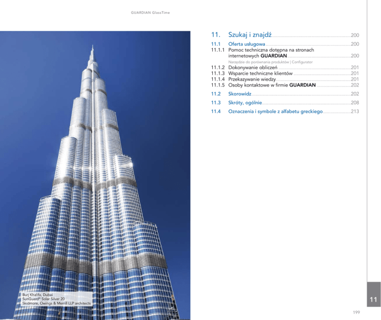 GUARDIAN GlassTime 11. Szukaj i znajdź...............................................................200 11.1 Oferta usługowa....................................................................200 11.1.1 Pomoc techniczna dotępna na stronach internetowych GUARDIAN...................................................200 Narzędzie do porównania produktów | Configurator 11.1.2 11.1.3 11.1.4 11.1.5 Dokonywanie obliczeń..........................................................201 Wsparcie techniczne klientów..............................................201 Przekazywanie wiedzy............................................................201 Osoby kontaktowe w firmie GUARDIAN............................202 11.2 Skorowidz...............................................................................202 11.3 Skróty, ogólnie.......................................................................208 11.4 Oznaczenia i symbole z alfabetu greckiego.......................213 Burj Khalifa, Dubai SunGuard® Solar Silver 20 Skidmore, Owings & Merrill LLP architects 198 11 199 GUARDIAN GlassTime Rozdział ten zawiera różnorodne informacje, począwszy od wskazówek dotyczących poszukiwania ofert na określone usługi, aż po wykaz pojęć lub skrótów związanych z terminologią szklarską. 11.1Oferta usługowa Dopełnienie szerokiej gamy oferowanych przez GUARDIAN produktów stanowi wsparcie udzielane przez dział doradztwa technicznego. Pozostaje on do Państwa dyspozycji gotowy asystować podczas dokonywania wyboru szkła, służy wsparciem technicznym i wszelkimi niezbęd- nymi informacjami na temat naszych produktów. Jest również w stanie określić grubość i typ szkła właściwy dla danego projektu oraz dostarczyć szczegółowych informacji na temat parametrów dowolnej konfiguracji przeszklenia. 11.1.1 Pomoc techniczna dostępna na stronach internetowych GUARDIAN Na stronach internetowych GUARDIAN można szybko i bez zbędnych komplikacji sięgnąć po następujące pomocne narzędzia: 11.1.1.1 Narzędzie do porównania produktów Ta aplikacja internetowa umożliwia wyszukiwanie konkretnych produktów spełniających różne kryteria spośród szerokiego asortymentu oraz porównywanie wybranych już produktów między sobą. W tym celu definiuje się parametry takie jak np. optyka i/lub określone wartości, według których oprogramowanie przeprowadza selekcję online i w kilka sekund wyszukuje spełniające kryteria produkty, więcej szczegółów na stronie ÝÝ www.sunguardglass.pl 11.1.1.2 GUARDIAN Configurator Dostępny na stronie internetowej GUARDIAN Configurator jest programem kalkulacyjnym opracowanym przez Dział Techniczny firmy GUARDIAN. Służy on do obliczania spektrofotometrycznych i termicznych właściwości skomponowanej uprzednio konfiguracji przeszklenia, zbudowanego w oparciu o zestaw dwu- lub trzyszybowy; kombinację różnych rodzajów szkła i jego grubości. 200 W wyniku przeprowadzonej kalkulacji otrzymujemy szczegółowy raport w formacie pdf, łatwy do dystrybucji i przechowywania, w którym znajdują się właściwości przeszklenia według norm PN-EN 410 i PN-EN 673. Szukaj i znajdź pomocą rezultaty obliczeń są stworzone w oparciu o rezultaty niezależnych pomiarów. Oznacza to, że generowane wyniki mogą zostać wykorzystane w procesie projektowania budynku oraz jego systemu kontrolującego wpływ warunków otoczenia. GUARDIAN Konfigurator można pobrać ze strony ÝÝ www.sunguardglass.pl 11.1.2 Dokonywanie obliczeń Już w fazie planowania i/lub ofertowania konieczne jest przeprowadzenia obliczeń, które umożliwiają odpowiedni dobór szkła Chodzi zarówno o wykonanie obliczenia parametrów termicznych i izolacyjnych szkła, jak i określenie dopuszczalnych naprężeń termicznych szkła w konstrukcji budynku. Obliczenia przeprowadzane przez dział techniczny mają jednak wyłącznie charakter rekomendacyjny i zawsze muszą być potwierdzone przez uprawnione do udzielania zezwoleń osoby. 11.1.3 Wsparcie techniczne klientów Poza certyfikatami, deklaracjami producenta i innymi dokumentami technicznymi do dyspozycji naszych klientów zawsze pozostają również pracownicy, którzy w zależności od potrzeb mogą swoją wiedzą fachową wspierać klientów na miejscu, w ich zakła- dach produkcyjnych. Ma to miejsce zarówno gdy nowi klienci potrzebują fachowej opinii na temat możliwości przetwórczych swoich linii produkcyjnych, jak i przy wprowadzaniu na rynek nowych produktów GUARDIAN. 11.1.4 Przekazywanie wiedzy Im wszechstronniejsza wiedza, tym skuteczniejsze doradztwo i sprzedaż. Kierując się tą dewizą eksperci GUARDIAN przekazują swoim klientom całą wiedzę jaką posiadają na temat asortymentu produktów GUARDIAN. Dotyczy to zarówno parametrów nowo wytwarzanych produktów, jak i ich zastosowania i możliwości obróbki. Prowadzone regularnie w całej Europie konferencje i szkolenia mają na celu zaznajamianie klientów zarówno z produktami GUARDIAN, jak i przekazywanie im fachowej wiedzy odnośnie produkcji, przetwarzania i różnorodnych zastosowań szkła w budownictwie. Sposób dokonywania kalkulacji za pomocą tego programu został zweryfikowany przez TNO i wszystkie otrzymane za jego 11 201 GUARDIAN GlassTime 11.1.5 Osoby kontaktowe w firmie GUARDIAN Lista osób kontaktowych Działów Technicznych GUARDIAN nie jest publikowana w niniejszym opracowaniu z uwagi na brak możliwości jej późniejszego aktualizowania. Na naszej stronie internetowej www.guardian-czestochowa.com można w każdej chwili uzyskać dostęp do aktualnych danych kontaktowych. Prosimy skorzystać z możliwości nawiązania osobistego kontaktu i poznania pracowników firmy GUARDIAN. ÝÝ www.guardian-czestochowa.com 11.2Skorowidz A Absorpcja .................................................................... 45, 57, 59 Anizotropia............................................................................... 77 Aspekty ludzkie......................