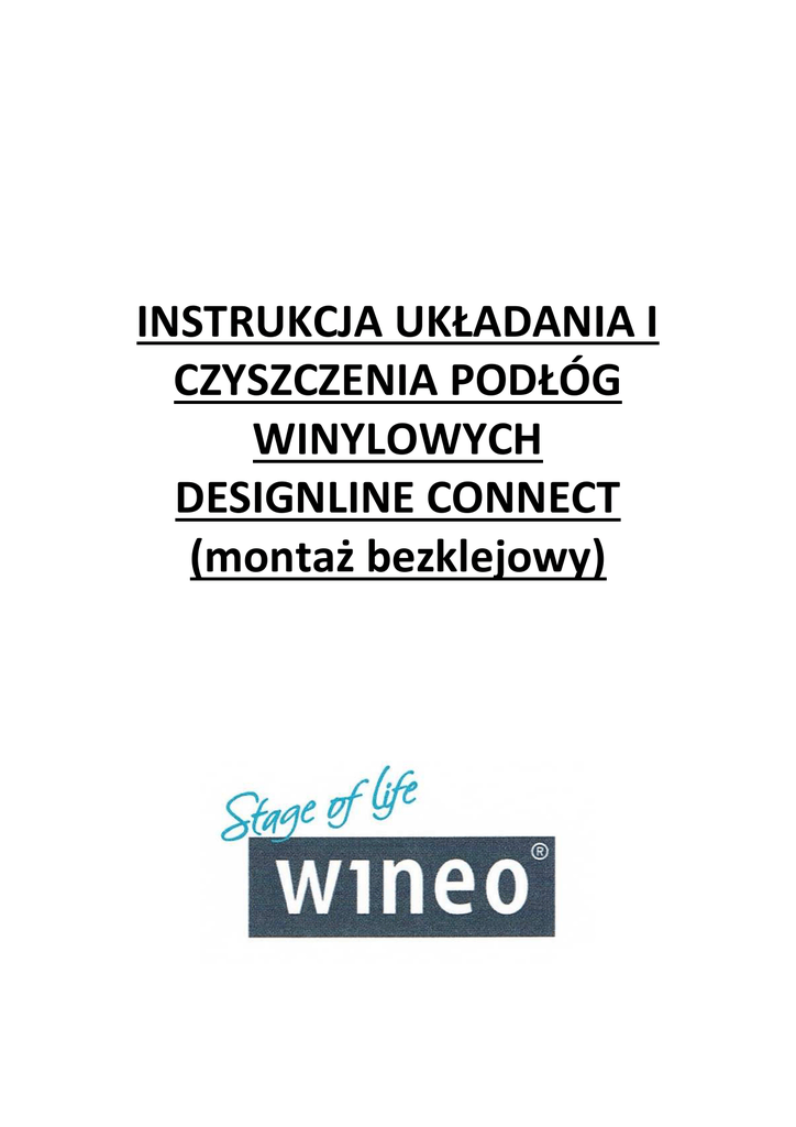 INSTRUKCJA UKŁADANIA I CZYSZCZENIA PODŁÓG WINYLOWYCH DESIGNLINE CONNECT (montaż bezklejowy) NASZE PODŁOGI PAŃSTWA STYL NOWOŚĆ BEZKLEJOWE UKŁADANIE ŁATWE I SZYBKIE UKŁADANIE - bezklejowy system montażu CICHA - optymalna akustyka wnętrza dzięki elastycznej warstwie wierzchniej ODPORNA NA WILGOĆ - idealne rozwiązanie do łazienki lub kuchni CIEPŁA I MIĘKKA DLA STÓP - doskonała do chodzenia na boso dzięki elastycznej warstwie wierzchniej NIEWIELKA WYSOKOŚĆ PODŁOGI - idealna przy remontach, gdzie wymagana jest niewielka wysokość podłogi - tylko 5 mm WYSOKA ODPORNOŚĆ NA ŚCIERANIE - wytrzymała warstwa wierzchnia na ślady pazurów psa oraz kota ZNAKOMITY WYBÓR DO POMIESZCZEŃ MIESZKALNYCH I OBIEKTÓW UŻYTECZNOŚCI PUBLICZNEJ UKŁADANIE KROK 1: Pierwszy rząd Krawędź z piórem skierować w stronę ściany. Pozostała część elementu (przynajmniej 30 cm) z pierwszego rzędu może posłużyć za pierwszy panel drugiego rzędu. KROK 2: Drugi rząd Element z piórem wsunąć w wyżłobienie pierwszego, ułożonego rzędu pod kątem 30°. KROK 3: Położyć panel na płasko Docisnąć panel w dół i gotowe! ŁĄCZENIE OD STRONY CZOŁOWEJ PANELA Krótkie krawędzie lekko docisnąć gumowym białym młotkiem do montażu - jeśli panele zostały prawidłowo zamknięte będą zupełnie płasko ułożone na podłodze. Dokładna instrukcja układania paneli w punkcie 3. 1. NARZĘDZIA MONTAŻOWE DO UKŁADANIA PODŁÓG DESIGNline CONNECT ® Do układania podłogi będą potrzebne Państwu następujące narzędzia: nóż do cięcia z ostrzem trapezowym gumowy młotek z białą główką ołówek/inne narzędzie do rysowania miarka kliny dystansowe 2. PRZYGOTOWANIE ORAZ WAŻNIEJSZE INFORMACJE PRZED ROZPOCZĘCIEM MONTAŻU 2.1. SPRAWDZENIE TOWARU Przed montażem należy przejrzeć dokładnie panele czy nie występują na nich wady i czy towar jest pełnowartościowy. Gwarancja nie obejmuje paneli, które zostały już pocięte albo położone. Zgodność kolorystyki paneli może zostać potwierdzona jedynie podczas dostawy. 2.2. AKLIMATYZACJA Proszę przeprowadzić przed montażem aklimatyzację paneli DESIGNline CONNECT ® przez co najmniej 12h. 2.3. TEMPERATURA POMIESZCZENIA Podłoga DESIGNline CONNECT ® powinna zostać ułożona w temperaturze pokojowej od 18°C do 25°C. Temperatura podłoża nie może być niższa niż 15°C. 2.4. PRZYGOTOWANIE POSADZKI Podłoże musi być równe, twarde, suche oraz musi zostać przygotowane wg normy DIN 18365. Nierówności podłogi nie mogą być większe niż 3 mm/1m² (norma DIN 18202, „Tolerancja w budownictwie”, tabela 3, rząd 4). Wykładziny i podkłady filcowe muszą zostać usunięte przed montażem podłogi. Zasadniczo zaleca się usunięcie wszystkich starych pokryć podłogowych. 2.5. UKŁADANIE MATY PODKŁADOWEJ Silent COMFORT Zalecamy ułożenie materiału podkładowego Silent COMFORT, który jest wyprodukowany przez firmę Windmöller Flooring. Zalety maty podkładowej Silent COMFORT: wyrównanie różnic wysokości podłoża (np. przy układaniu na płytkach ceramicznych, podłogach drewnianych itp.) wytłumienie odgłosów chodzenia optymalizacja antypoślizgowości przy układaniu powierzchni wystawowych (np. wydzielonych powierzchni sprzedażowych oraz powierzchni w centrach handlowych, hipermarketach itd.) minimalizacja odgłosów, które mogą powstać na skutek pozostawionego na posadzce brudu, pyłów podniesienie komfortu montażu paneli podłogowych oraz komfortu chodzenia Mata Silent COMFORT jest absolutnie konieczna do ułożenia na: podłodze laminowanej/parkiecie równej podłodze kamiennej, marmurowej, płytkach kamionkowych płytkach ceramicznych (fuga: szerokość <5 mm, głębokość: < 2mm) panelach winylowych idealnie równych powierzchniach z jastrychu: nowego lub odnowionego jako materiał podkładowy pod podłogi winylowe DESIGNline CONNECT ® 3. UKŁADANIE PODŁOGI DESIGNline CONNECT® 3.1. KIERUNEK UKŁADANIA Proszę układać panele zawsze w kierunku od lewej strony do prawej, pamiętając o tym, aby boki z piórem skierowane były w stronę ściany. Panele podłogowe najlepiej układać równolegle do głównego źródła światła. Jeśli panele są układane w wąskim i długim pomieszczeniu, a chcielibyście Państwo zwiększyć stabilność podłogi, należy ułożyć je w kierunku podłużnym. 3.2. PLANOWANIE FUG DYLATACYJNYCH Za pomocą klinów dystansowych należy zaplanować szczeliny dylatacyjne tak, aby miały wymiary przynajmniej 5 mm. Rada: pozostała część panela może posłużyć jako szczelina dylatacyjna. Proszę uwzględnić minimum 5 mm fugi dylatacyjnej we wszystkich kierunkach w odniesieniu do punktów mocowania tj. wokół rur, ościeżnic drzwiowych itd. Ten konieczny odstęp dylatacyjny – 5mm – nie może zostać wypełniony silikonem lub kablem elektrycznym. 3.3. MOŻLIWOŚĆ UŻYWANIA SILIKONU W WYJĄTKOWYCH SYTUACJACH: POMIESZCZENIA O PODWYŻSZONYM POZIOMIE WILGOTNOŚCI: W pomieszczeniach o podwyższonym poziomie wilgotności, których wielkość maksymalna wynosi 10 m² jak np. łazienka albo kuchnia, istnieje możliwość wypełnienia silikonem szczelin krawędziowych tak, aby uniemożliwić wnikanie wody pod panele podłogowe. Szczeliny dylatacyjne we wszystkich większych pomieszczeniach należy najpierw zakleić szczelną taśmą dylatacyjną, a potem uszczelnić masą silikonową i/lub zamontować listwę cokołową z gumową uszczelką. METALOWE OŚCIEŻNICE DRZWIOWE: W wypadku metalowych ościeżnic drzwiowych, których nie da się skrócić, zalecany jest odstęp dylatacyjny 3 mm, może on zostać wypełniony silikonem. Jeśli ościeżnice drzwiowe mogą zostać skrócone, proszę pamiętać o pozostawieniu 5 mm odstępu. 3.4. UKŁADANIE Pierwszy panel z pierwszego rzędu ułożyć krawędzią z piórem do ściany, następnie można układać resztę paneli. Należy zwrócić uwagę na to, aby styki czołowe zostały prawidłowo połączone na piór