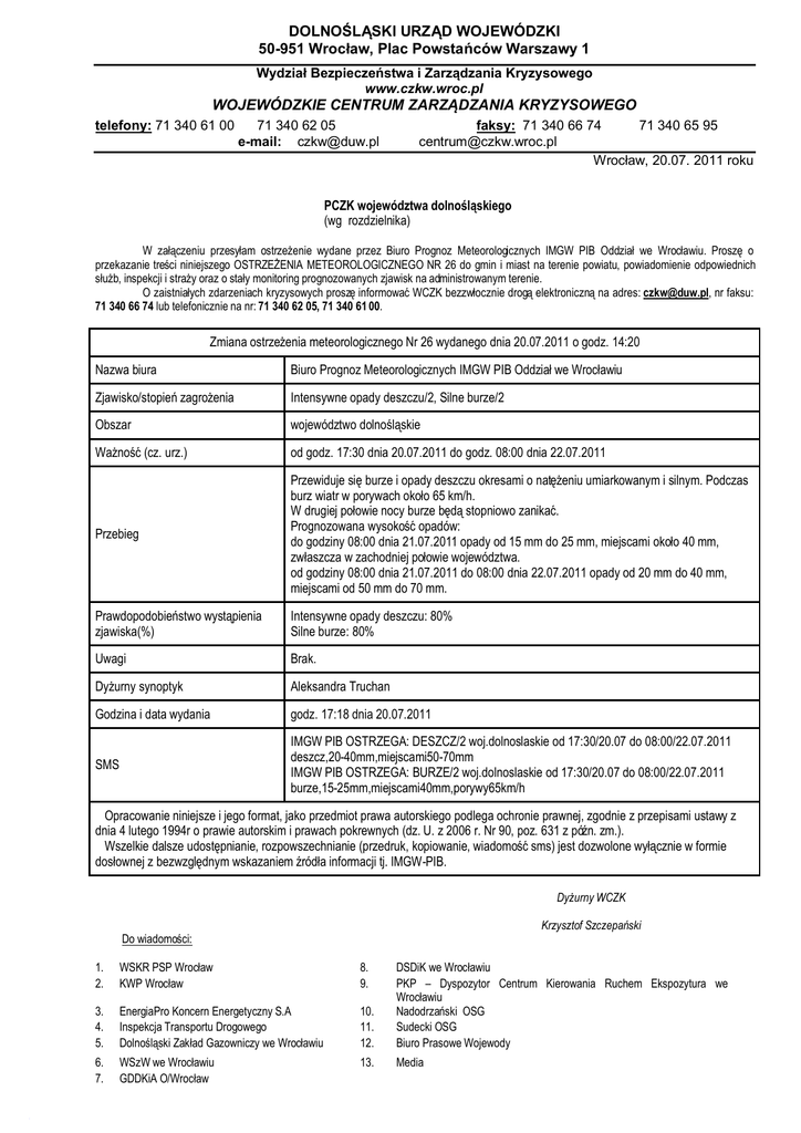 DOLNOŚLĄSKI URZĄD WOJEWÓDZKI 50-951 Wrocław, Plac Powstańców Warszawy 1 Wydział Bezpieczeństwa i Zarządzania Kryzysowego www.czkw.wroc.pl WOJEWÓDZKIE CENTRUM ZARZĄDZANIA KRYZYSOWEGO telefony: 71 340 61 00 71 340 62 05 e-mail: [email protected] faksy: 71 340 66 74 71 340 65 95 [email protected] Wrocław, 20.07. 2011 roku PCZK województwa dolnośląskiego (wg rozdzielnika) W załączeniu przesyłam ostrzeżenie wydane przez Biuro Prognoz Meteorologicznych IMGW PIB Oddział we Wrocławiu. Proszę o przekazanie treści niniejszego OSTRZEŻENIA METEOROLOGICZNEGO NR 26 do gmin i miast na terenie powiatu, powiadomienie odpowiednich służb, inspekcji i straży oraz o stały monitoring prognozowanych zjawisk na administrowanym terenie. O zaistniałych zdarzeniach kryzysowych proszę informować WCZK bezzwłocznie drogą elektroniczną na adres: [email protected], nr faksu: 71 340 66 74 lub telefonicznie na nr: 71 340 62 05, 71 340 61 00. Zmiana ostrzeżenia meteorologicznego Nr 26 wydanego dnia 20.07.2011 o godz. 14:20 Nazwa biura Biuro Prognoz Meteorologicznych IMGW PIB Oddział we Wrocławiu Zjawisko/stopień zagrożenia Intensywne opady deszczu/2, Silne burze/2 Obszar województwo dolnośląskie Ważność (cz. urz.) od godz. 17:30 dnia 20.07.2011 do godz. 08:00 dnia 22.07.2011 Przebieg Przewiduje się burze i opady deszczu okresami o natężeniu umiarkowanym i silnym. Podczas burz wiatr w porywach około 65 km/h. W drugiej połowie nocy burze będą stopniowo zanikać. Prognozowana wysokość opadów: do godziny 08:00 dnia 21.07.2011 opady od 15 mm do 25 mm, miejscami około 40 mm, zwłaszcza w zachodniej połowie województwa. od godziny 08:00 dnia 21.07.2011 do 08:00 dnia 22.07.2011 opady od 20 mm do 40 mm, miejscami od 50 mm do 70 mm. Prawdopodobieństwo wystąpienia zjawiska(%) Intensywne opady deszczu: 80% Silne burze: 80% Uwagi Brak. Dyżurny synoptyk Aleksandra Truchan Godzina i data wydania godz. 17:18 dnia 20.07.2011 SMS IMGW PIB OSTRZEGA: DESZCZ/2 woj.dolnoslaskie od 17:30/20.07 do 08:00/22.07.2011 deszcz,20-40mm,miejscami50-70mm IMGW PIB OSTRZEGA: BURZE/2 woj.dolnoslaskie od 17:30/20.07 do 08:00/22.07.2011 burze,15-25mm,miejscami40mm,porywy65km/h Opracowanie niniejsze i jego format, jako przedmiot prawa autorskiego podlega ochronie prawnej, zgodnie z przepisami ustawy z dnia 4 lutego 1994r o prawie autorskim i prawach pokrewnych (dz. U. z 2006 r. Nr 90, poz. 631 z późn. zm.). Wszelkie dalsze udostępnianie, rozpowszechnianie (przedruk, kopiowanie, wiadomość sms) jest dozwolone wyłącznie w formie dosłownej z bezwzględnym wskazaniem źródła informacji tj. IMGW-PIB. Dyżurny WCZK Krzysztof Szczepański Do wiadomości: 1. 2. WSKR PSP Wrocław KWP Wrocław 8. 9. 3. 4. 5. EnergiaPro Koncern Energetyczny S.A Inspekcja Transportu Drogowego Dolnośląski Zakład Gazowniczy we Wrocławiu 10. 11. 12. DSDiK we Wrocławiu PKP – Dyspozytor Centrum Kierowania Ruchem Ekspozytura we Wrocławiu Nadodrzański OSG Sudecki OSG Biuro Prasowe Wojewody 6. 7. WSzW we Wrocławiu GDDKiA O/Wrocław 13. Media