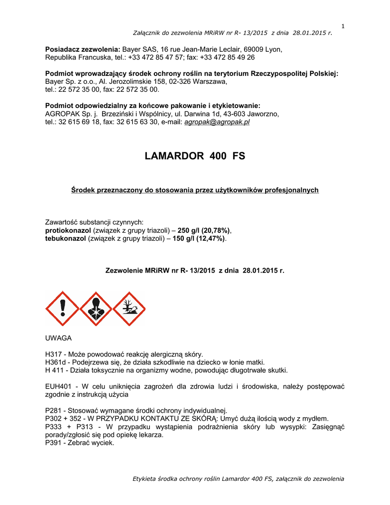 Załącznik do zezwolenia MRiRW nr R- 13/2015 z dnia 28.01.2015 r. 1 Posiadacz zezwolenia: Bayer SAS, 16 rue Jean-Marie Leclair, 69009 Lyon, Republika Francuska, tel.: +33 472 85 47 57; fax: +33 472 85 49 26 Podmiot wprowadzający środek ochrony roślin na terytorium Rzeczypospolitej Polskiej: Bayer Sp. z o.o., Al. Jerozolimskie 158, 02-326 Warszawa, tel.: 22 572 35 00, fax: 22 572 35 00. Podmiot odpowiedzialny za końcowe pakowanie i etykietowanie: AGROPAK Sp. j. Brzeziński i Wspólnicy, ul. Darwina 1d, 43-603 Jaworzno, tel.: 32 615 69 18, fax: 32 615 63 30, e-mail: [email protected] LAMARDOR 400 FS Środek przeznaczony do stosowania przez użytkowników profesjonalnych Zawartość substancji czynnych: protiokonazol (związek z grupy triazoli) – 250 g/l (20,78%), tebukonazol (związek z grupy triazoli) – 150 g/l (12,47%). Zezwolenie MRiRW nr R- 13/2015 z dnia 28.01.2015 r. UWAGA H317 - Może powodować reakcję alergiczną skóry. H361d - Podejrzewa się, że działa szkodliwie na dziecko w łonie matki. H 411 - Działa toksycznie na organizmy wodne, powodując długotrwałe skutki. EUH401 - W celu uniknięcia zagrożeń dla zdrowia ludzi i środowiska, należy postępować zgodnie z instrukcją użycia P281 - Stosować wymagane środki ochrony indywidualnej. P302 + 352 - W PRZYPADKU KONTAKTU ZE SKÓRĄ: Umyć dużą ilością wody z mydłem. P333 + P313 - W przypadku wystąpienia podrażnienia skóry lub wysypki: Zasięgnąć porady/zgłosić się pod opiekę lekarza. P391 - Zebrać wyciek. Etykieta środka ochrony roślin Lamardor 400 FS, załącznik do zezwolenia Załącznik do zezwolenia MRiRW nr R- 13/2015 z dnia 28.01.2015 r. 2 OPIS DZIAŁANIA Środek grzybobójczy w formie płynnego koncentratu o działaniu układowym, przeznaczony do zaprawiania w zaprawiarkach przystosowanych do zapraw ciekłych i zawiesinowych, ziarna siewnego zbóż ozimych i jarych w celu ochrony przed chorobami grzybowymi. STOSOWANIE ŚRODKA ZBOŻA OZIME Pszenica ozima pleśń śniegowa zbóż i traw, zgorzel siewek, śnieć cuchnąca pszenicy, śnieć gładka pszenicy. Żyto pleśń śniegowa zbóż i traw, zgorzel siewek. Pszenżyto ozime pleśń śniegowa zbóż i traw, zgorzel siewek. Jęczmień ozimy pleśń śniegowa zbóż i traw, zgorzel siewek, pasiastość liści jęczmienia, plamistość siatkowa jęczmienia, głownia pyląca jęczmienia. ZBOŻA JARE Pszenica jara zgorzel siewek, śnieć cuchnąca pszenicy, śnieć gładka pszenicy. Jęczmień jary zgorzel siewek, pasiastość liści jęczmienia, plamistość siatkowa jęczmienia, głownia pyląca jęczmienia. Pszenżyto jare zgorzel siewek Owies zgorzel siewek Maksymalna dawka dla jednorazowego zastosowania: 20 ml środka z dodatkiem 300 ml wody na 100 kg ziarna siewnego. Zalecana dawka dla jednorazowego zastosowania: 20 ml środka z dodatkiem 300 ml wody na 100 kg ziarna siewnego. SPORZĄDZANIE ZAWIESINY I TECHNIKA ZAPRAWIANIA Zawartość opakowania przed użyciem wstrząsnąć. Zawiesinę do zaprawiania sporządzić w osobnym naczyniu. Naczynie wypełnić najpierw zalecaną ilością wody, następnie dodać odpowiednią ilość środka Lamardor 400 FS. Dopiero wówczas zawiesinę dobrze wymieszać i wlać do zbiornika zaprawiarki włączając automatyczne mieszadło. Zaprawianie ziarna należy przeprowadzać w zaprawiarkach mechanicznych o ruchu ciągłym lub porcjowych zgodnie z instrukcją obsługi danej zaprawiarki. Należy ściśle przestrzegać właściwego dawkowania środka. Etykieta środka ochrony roślin Lamardor 400 FS, załącznik do zezwolenia Załącznik do zezwolenia MRiRW nr R- 13/2015 z dnia 28.01.2015 r. 3 UWAGI 1. Zaprawiać tylko dobrze oczyszczony materiał siewny. 2. Zaprawianie wykonać najlepiej bezpośrednio przed siewem. 3. Zaprawiony materiał powinien być dokładnie i równomiernie pokryty środkiem. 4. Zaprawiony materiał może być użyty wyłączenie do siewu. Nie wolno przeznaczać go na cele konsumpcyjne ani na paszę. 5. Nie zaprawiać ziarna siewnego o wilgotności powyżej 16%, ani uprzednio traktowanego inną zaprawą. 6. Zaprawiony materiał przechowywać w grubych, papierowych, oznakowanych i szczelnie zamkniętych workach, w chłodnym, suchym i dobrze wietrzonym magazynie. 7. Jeżeli zachodzi konieczność przechowywania ziarna siewnego do następnego sezonu, należy zbadać przed siewem zdolność kiełkowania. POSTĘPOWANIE Z RESZTKAMI CIECZY UŻYTKOWEJ I MYCIE APARATURY Wodę użytą do mycia zaprawiarki: - zużyć do sporządzenia cieczy użytkowej podczas kolejnego zaprawiania lub - unieszkodliwić z wykorzystaniem rozwiązań technicznych zapewniających biologiczną degradację substancji czynnych środków ochrony roślin, lub - unieszkodliwić w inny sposób, zgodny z przepisami o odpadach. Po pracy aparaturę dokładnie wymyć/oczyścić zgodnie z instrukcją danej zaprawiarki. ŚRODKI OSTROŻNOŚCI I ZALECENIA STOSOWANIA ZWIĄZANE Z DOBRĄ PRAKTYKĄ ROLNICZĄ 1. Maksymalna norma wysiewu przy użyciu materiału siewnego zaprawianego środkiem Lamardor 400 FS wynosi 250 kg/ha. 2. Należy się skonsultować z posiadaczem zezwolenia w zakresie ewentualnego wpływu zastosowania środka Lamardor 400 FS na zdolność kiełkowania materiału siewnego i jakość plonu pszenżyta ozimego. WARUNKI BEZPIECZNEGO STOSOWANIA ŚRODKA Środki ostrożności dla osób stosujących środek: Stosować rękawice ochronne oraz odzież ochronną, zabezpieczającą przed oddziaływaniem środków ochrony roślin, oraz odpowiednie obuwie w trakcie przygotowywania sporządzania zawiesiny zaprawy oraz zaprawiania. Środki ostrożności związane z ochroną środowiska naturalnego: Nie zanieczyszczać wód środkiem ochrony roślin lub jego opakowaniem. Nie myć aparatury w pobliżu wód powierzchniowych. Unikać zanieczyszczania wód poprzez rowy odwadniające z gospodarstw i dróg. W celu ochrony organizmów wodnych konieczne jest wyznaczenie strefy ochronnej o szerokości 1 m od zbiorników i cieków wodnych. E