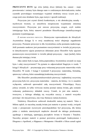 PRZYCZYNY BYTU (gr. [aitía], [áition]; łac. causa) – racje powstawania i zmiany bytu danego nam w codziennym doświadczeniu; realne czynniki pozwalające rozumiejąco wyjaśnić strukturę rzeczy (czym jest, z czego jest) oraz działanie bytu, jego motyw i sposób realizacji. Przyczyna jest czymś (kimś) konkretnym, a nie abstrakcyjną zasadą – myślowym tworem, co umożliwia niesprzeczne wyjaśnianie zmiennej rzeczywistości. Przyczyna jest zawsze przyczyną czegoś, czyli realnie istniejącego bytu, który stanowi przedmiot filozoficznego (metafizycznego) poznania wyjaśniającego. Z HISTORII KONCEPCJI PRZYCZYN . Historyczne wprowadzenie do Metafizyki Arystotelesa (księga I) w swej zasadniczej treści obejmuje zagadnienie przyczyny. Poznanie przyczyn to dla Arystotelesa cecha poznania naukowego. Jeśli poznanie naukowe jest poznaniem rzeczywistości w świetle jej przyczyn, to dotychczasowe ujęcia poznawcze dokonane przez filozofów były ujęciem poznawczym rzeczywistości w świetle jakiejś przyczyny – [arché], która tłumaczyła istniejący świat. Jaka zatem była ta , którą poprzednicy Arystotelesa uważali za rację bytu i całej rzeczywistości? Na pytanie to odpowiedział Stagiryta w rozdz. 7 księgi I Metafizyki – przytaczając przy wskazanej przyczynie stanowiska wielu filozofów. W rozdz. 3 księgi I wymienił 4 przyczyny: materialną, formalną, sprawczą i celową, które uzasadniają konkretną rzeczywistość. Dla filozofów przedarystotelesowskich pierwszą i najbardziej oczywistą przyczyną była tzw. przyczyna materialna – materia, do której, i to w zasadzie wyłącznie, usiłowali sprowadzić całą rzeczywistość. Filozofujący fizycy jońscy uważali, że tylko wówczas można poznać naturę świata, gdy zostanie wskazany podstawowy składnik rzeczy. Uznali, że jest nim materia – tworzywo, z którego składają się wszystkie rzeczy; z materii wszystko powstaje i do niej powraca, ona więc tłumaczy naturę kosmosu. Niektórzy filozofowie usiłowali dookreślić naturę tej materii. Tales z Miletu sądził, że naczelną zasadą świata jest materia w postaci wody; związek wody z przejawami życiowymi prawdopodobnie był przyczyną, dla której jeden z siedmiu starożytnych mędrców doszedł do takiego przekonania, zgodnego z mitologią, upatrującą początków świata w Oceanie i Tetydzie. Naczelny przejaw materii w postaci powietrza postrzegali Anaksymenes i Diogenes z Apollonii, a Hippasos z Metapontu i Heraklit z Efezu uznali ogień Przyczyny bytu PEF - © Copyright by Polskie Towarzystwo Tomasza z Akwinu za podstawowy pierwiastek materii. Empedokles z Agrygentu, przyjmujący czynnik materialny za prazasadę świata, uważał, że materia jest wielopostaciowa i występuje w świecie jako woda, powietrze, ogień i ziemia. Anaksagoras z Klazomenaj przyjmował nieskończoną jakościowo ilość pierwiastków materialnych. Ponadto, Anaksagoras zwrócił uwagę na istnienie przyczyny sprawczej jako źródła ruchu. Ci z filozofów, którzy dostrzegli konieczność istnienia czynnika sprawczego ruchu w kosmosie, posunęli się w wyjaśnianiu natury świata dalej od swoich poprzedników, przyjmujących tylko czynnik materialny, wiążący mocniej ich teorie z monistycznymi koncepcjami. Przyjęcie czynnika sprawczego nie u wszystkich zaważyło na bardziej realistycznym wyjaśnianiu świata, niektórzy bowiem, przyjąwszy czynnik sprawczy, z jakichś powodów zarzucili dociekania nad tym zagadnieniem, poprzestając na analizie czynnika materialnego, jak to widać w przypadku Parmenidesa i tych, którzy sprawstwo wiązali z jakąś postacią materii. Ci filozofowie, którzy zwrócili uwagę na ruch jako pochodzący od czynnika sprawczego, różnili się w twierdzeniach na temat ilości źródeł ruchu, a tym samym czynników sprawczych; te jawiły się bądź jako jedne, natury intelektualnej (u Anaksagorasa), bądź mnogie (u Empedoklesa, Parmenidesa, Demokryta). Wraz ze szkołą pitagorejską i Platonem nastąpił dalszy rozwój myśli filozoficznej. Dostrzeżono w świecie czynniki formalne, konstytuujące treść rzeczy-bytu, stanowiące o jedności bytu i jego niepodzieloności. Już pitagorejczycy, jak to wskazuje Arystoteles w księdze I Metafizyki, odkryli elementy stałe i organizujące treść rzeczy. Dopiero jednak Platon, w dużej mierze pod wpływem Sokratesa i jego teorii cnoty, dostrzegł stałość i powszechność treści-bytu. Takie stanowisko było najbardziej zbliżone do szkoły pitagorejskiej, a także do koncepcji Parmenidesa. Sokratesową naukę o niezmienności i powszechności zasad moralnych Platon rozciągnął na całą rzeczywistość, wskazując niezmienną istotę rzeczy, stanowiącą przedmiot definicji w ideach oderwanych od świata zmysłowego. Przedmiot definicji istnieje bowiem w stanie idealnym, dostępnym intuitywnej myśli. Idea jest formą tożsamą ze sobą, a przez to jedną, niezmienną i wieczną. Rzeczy zmienne – z tego powodu niepoddające się naukowemu poznaniu – są Przyczyny bytu PEF - © Copyright by Polskie Towarzystwo Tomasza z Akwinu tylko partycypacją prawdziwej rzeczywistości – idei. Cała filozofia Platona jest – wg Arystotelesa – filozofią przyczyny formalnej utożsamionej z ideami. Do wyróżnionych w historii filozofii typów przyczyn: materialnej, sprawczej i formalnej, Arystoteles dodał czwarty typ: przyczynę celową, która również ontycznie uzasadnia czyny, zmiany i ruch, będąc motywem, dla którego coś raczej działa niż nie działa. Uzasadnienie historyczne koncepcji czterech przyczyn zostało wyraźnie wskazane w tekstach Arystotelesa. Jest ono ważne, a nawet może uchodzić za dostateczną rację powstania jakiejś teorii, nie zastępuje jednak uzasadnienia rzeczowego. Na czym polega rzeczowe uzasadnianie wg Arystotelesa? Przyjmuje się, że koncepcja czterech przyczyn była dla Stagiryty czymś oczywistym: „Że zaś są przyczyny i że w takiej l