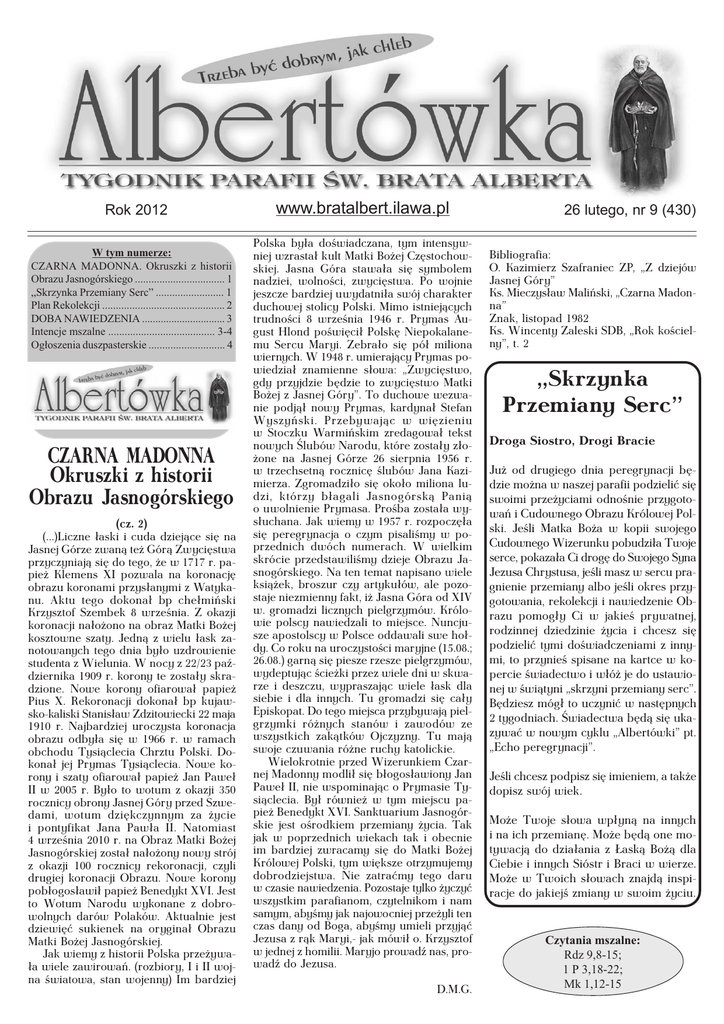 Rok 2012 W tym numerze: CZARNA MADONNA. Okruszki z historii Obrazu Jasnogórskiego ................................. 1 Skrzynka Przemiany Serc ......................... 1 Plan Rekolekcji ............................................. 2 DOBA NAWIEDZENIA ............................... 3 Intencje mszalne ....................................... 3-4 Og³oszenia duszpasterskie ............................ 4 CZARNA MADONNA Okruszki z historii Obrazu Jasnogórskiego (cz. 2) (...)Liczne ³aski i cuda dziej¹ce siê na Jasnej Górze zwan¹ te¿ Gór¹ Zwyciêstwa przyczyniaj¹ siê do tego, ¿e w 1717 r. papie¿ Klemens XI pozwala na koronacjê obrazu koronami przys³anymi z Watykanu. Aktu tego dokona³ bp che³miñski Krzysztof Szembek 8 wrzenia. Z okazji koronacji na³o¿ono na obraz Matki Bo¿ej kosztowne szaty. Jedn¹ z wielu ³ask zanotowanych tego dnia by³o uzdrowienie studenta z Wielunia. W nocy z 22/23 padziernika 1909 r. korony te zosta³y skradzione. Nowe korony ofiarowa³ papie¿ Pius X. Rekoronacji dokona³ bp kujawsko-kaliski Stanis³aw Zdzitowiecki 22 maja 1910 r. Najbardziej uroczysta koronacja obrazu odby³a siê w 1966 r. w ramach obchodu Tysi¹clecia Chrztu Polski. Dokona³ jej Prymas Tysi¹clecia. Nowe korony i szaty ofiarowa³ papie¿ Jan Pawe³ II w 2005 r. By³o to wotum z okazji 350 rocznicy obrony Jasnej Góry przed Szwedami, wotum dziêkczynnym za ¿ycie i pontyfikat Jana Paw³a II. Natomiast 4 wrzenia 2010 r. na Obraz Matki Bo¿ej Jasnogórskiej zosta³ na³o¿ony nowy strój z okazji 100 rocznicy rekoronacji, czyli drugiej koronacji Obrazu. Nowe korony pob³ogos³awi³ papie¿ Benedykt XVI. Jest to Wotum Narodu wykonane z dobrowolnych darów Polaków. Aktualnie jest dziewiêæ sukienek na orygina³ Obrazu Matki Bo¿ej Jasnogórskiej. Jak wiemy z historii Polska prze¿ywa³a wiele zawirowañ. (rozbiory, I i II wojna wiatowa, stan wojenny) Im bardziej www.bratalbert.ilawa.pl Polska by³a dowiadczana, tym intensywniej wzrasta³ kult Matki Bo¿ej Czêstochowskiej. Jasna Góra stawa³a siê symbolem nadziei, wolnoci, zwyciêstwa. Po wojnie jeszcze bardziej uwydatni³a swój charakter duchowej stolicy Polski. Mimo istniej¹cych trudnoci 8 wrzenia 1946 r. Prymas August Hlond powiêci³ Polskê Niepokalanemu Sercu Maryi. Zebra³o siê pó³ miliona wiernych. W 1948 r. umieraj¹cy Prymas powiedzia³ znamienne s³owa: Zwyciêstwo, gdy przyjdzie bêdzie to zwyciêstwo Matki Bo¿ej z Jasnej Góry. To duchowe wezwanie podj¹³ nowy Prymas, kardyna³ Stefan Wyszyñski. Przebywaj¹c w wiêzieniu w Stoczku Warmiñskim zredagowa³ tekst nowych lubów Narodu, które zosta³y z³o¿one na Jasnej Górze 26 sierpnia 1956 r. w trzechsetn¹ rocznicê lubów Jana Kazimierza. Zgromadzi³o siê oko³o miliona ludzi, którzy b³agali Jasnogórsk¹ Pani¹ o uwolnienie Prymasa. Proba zosta³a wys³uchana. Jak wiemy w 1957 r. rozpoczê³a siê peregrynacja o czym pisalimy w poprzednich dwóch numerach. W wielkim skrócie przedstawilimy dzieje Obrazu Jasnogórskiego. Na ten temat napisano wiele ksi¹¿ek, broszur czy artyku³ów, ale pozostaje niezmienny fakt, i¿ Jasna Góra od XIV w. gromadzi licznych pielgrzymów. Królowie polscy nawiedzali to miejsce. Nuncjusze apostolscy w Polsce oddawali swe ho³dy. Co roku na uroczystoci maryjne (15.08.; 26.08.) garn¹ siê piesze rzesze pielgrzymów, wydeptuj¹c cie¿ki przez wiele dni w skwarze i deszczu, wypraszaj¹c wiele ³ask dla siebie i dla innych. Tu gromadzi siê ca³y Episkopat. Do tego miejsca przybywaj¹ pielgrzymki ró¿nych stanów i zawodów ze wszystkich zak¹tków Ojczyzny. Tu maj¹ swoje czuwania ró¿ne ruchy katolickie. Wielokrotnie przed Wizerunkiem Czarnej Madonny modli³ siê b³ogos³awiony Jan Pawe³ II, nie wspominaj¹c o Prymasie Tysi¹clecia. By³ równie¿ w tym miejscu papie¿ Benedykt XVI. Sanktuarium Jasnogórskie jest orodkiem przemiany ¿ycia. Tak jak w poprzednich wiekach tak i obecnie im bardziej zwracamy siê do Matki Bo¿ej Królowej Polski, tym wiêksze otrzymujemy dobrodziejstwa. Nie zatraæmy tego daru w czasie nawiedzenia. Pozostaje tylko ¿yczyæ wszystkim parafianom, czytelnikom i nam samym, abymy jak najowocniej prze¿yli ten czas dany od Boga, abymy umieli przyj¹æ Jezusa z r¹k Maryi,- jak mówi³ o. Krzysztof w jednej z homilii. Maryjo prowad nas, prowad do Jezusa. D.M.G. 26 lutego, nr 9 (430) Bibliografia: O. Kazimierz Szafraniec ZP, Z dziejów Jasnej Góry Ks. Mieczys³aw Maliñski, Czarna Madonna Znak, listopad 1982 Ks. Wincenty Zaleski SDB, Rok kocielny, t. 2 Skrzynka Przemiany Serc Droga Siostro, Drogi Bracie Ju¿ od drugiego dnia peregrynacji bêdzie mo¿na w naszej parafii podzieliæ siê swoimi prze¿yciami odnonie przygotowañ i Cudownego Obrazu Królowej Polski. Jeli Matka Bo¿a w kopii swojego Cudownego Wizerunku pobudzi³a Twoje serce, pokaza³a Ci drogê do Swojego Syna Jezusa Chrystusa, jeli masz w sercu pragnienie przemiany albo jeli okres przygotowania, rekolekcji i nawiedzenie Obrazu pomog³y Ci w jakie prywatnej, rodzinnej dziedzinie ¿ycia i chcesz siê podzieliæ tymi dowiadczeniami z innymi, to przynie spisane na kartce w kopercie wiadectwo i w³ó¿ je do ustawionej w wi¹tyni skrzyni przemiany serc. Bêdziesz móg³ to uczyniæ w nastêpnych 2 tygodniach. wiadectwa bêd¹ siê ukazywaæ w nowym cyklu Albertówki pt. Echo peregrynacji. Jeli chcesz podpisz siê imieniem, a tak¿e dopisz swój wiek. Mo¿e Twoje s³owa wp³yn¹ na innych i na ich przemianê. Mo¿e bêd¹ one motywacj¹ do dzia³ania z £ask¹ Bo¿¹ dla Ciebie i innych Sióstr i Braci w wierze. Mo¿e w Twoich s³owach znajd¹ inspiracje do jakiej zmiany w swoim ¿yciu. Czytania mszalne: Rdz 9,8-15; 1 P 3,18-22; Mk 1,12-15 PLAN REKOLEKCJI RENOWACJA MISJI WIÊTYCH (od 26 lutego do 1 marca 2012 roku) Niedziela - 26 lutego JA JESTEM DROG¥, PRAWD¥ I ¯YCIEM Wtorek - 28 lutego DZIEÑ MI£OSIERDZIA BO¯EGO Rozpoczêcie Renowacji Misji wiêtych 07.30 - Msza w. z kazaniem misyjnym wprowadzaj¹cym dla wszystkich - uroczyste rozpocz