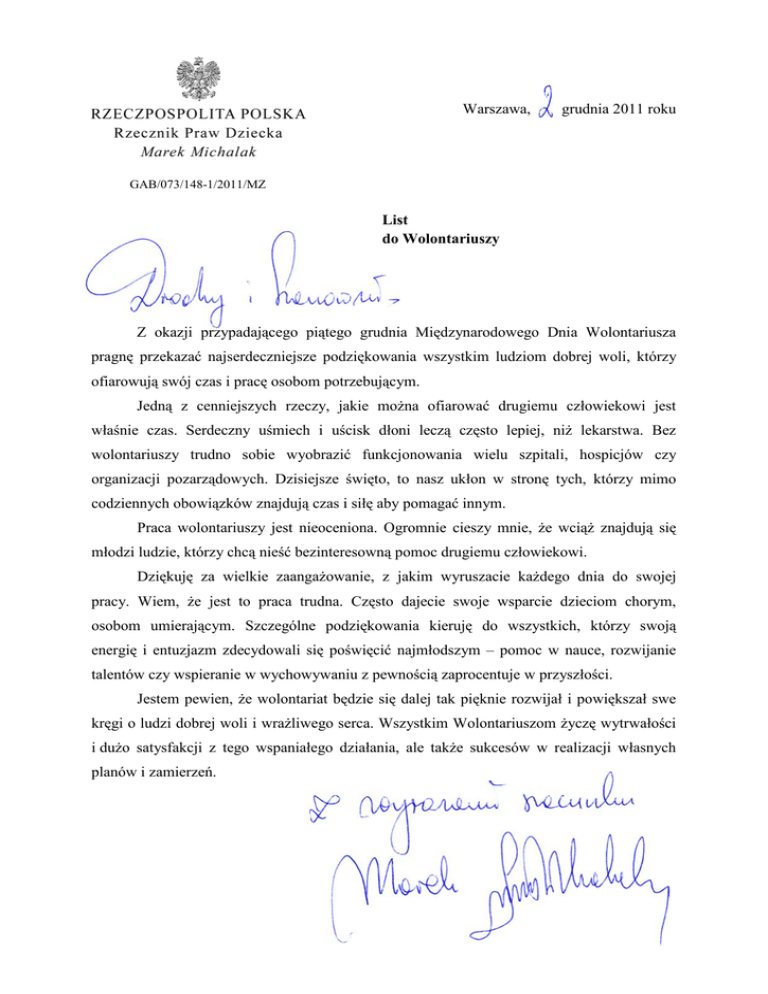 Warszawa, grudnia 2011 roku GAB/073/148-1/2011/MZ List do Wolontariuszy Z okazji przypadającego piątego grudnia Międzynarodowego Dnia Wolontariusza pragnę przekazać najserdeczniejsze podziękowania wszystkim ludziom dobrej woli, którzy ofiarowują swój czas i pracę osobom potrzebującym. Jedną z cenniejszych rzeczy, jakie można ofiarować drugiemu człowiekowi jest właśnie czas. Serdeczny uśmiech i uścisk dłoni leczą często lepiej, niż lekarstwa. Bez wolontariuszy trudno sobie wyobrazić funkcjonowania wielu szpitali, hospicjów czy organizacji pozarządowych. Dzisiejsze święto, to nasz ukłon w stronę tych, którzy mimo codziennych obowiązków znajdują czas i siłę aby pomagać innym. Praca wolontariuszy jest nieoceniona. Ogromnie cieszy mnie, że wciąż znajdują się młodzi ludzie, którzy chcą nieść bezinteresowną pomoc drugiemu człowiekowi. Dziękuję za wielkie zaangażowanie, z jakim wyruszacie każdego dnia do swojej pracy. Wiem, że jest to praca trudna. Często dajecie swoje wsparcie dzieciom chorym, osobom umierającym. Szczególne podziękowania kieruję do wszystkich, którzy swoją energię i entuzjazm zdecydowali się poświęcić najmłodszym – pomoc w nauce, rozwijanie talentów czy wspieranie w wychowywaniu z pewnością zaprocentuje w przyszłości. Jestem pewien, że wolontariat będzie się dalej tak pięknie rozwijał i powiększał swe kręgi o ludzi dobrej woli i wrażliwego serca. Wszystkim Wolontariuszom życzę wytrwałości i dużo satysfakcji z tego wspaniałego działania, ale także sukcesów w realizacji własnych planów i zamierzeń.