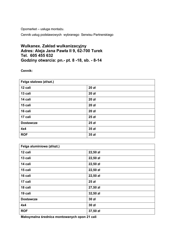 Opomarket – usługa montażu. Cennik usług podstawowych wybranego Serwisu Partnerskiego Wulkanex. Zakład wulkanizacyjny Adres: Aleja Jana Pawła II 9, 62-700 Turek Tel. 605 455 632 Godziny otwarcia: pn.- pt. 8 -18, sb. - 8-14 Cennik: Felga stalowa (zł/szt.) 12 cali 20 zł 13 cali 20 zł 14 cali 20 zł 15 cali 20 zł 16 cali 20 zł 17 cali 25 zł Dostawcze 25 zł 4x4 35 zł ROF 35 zł Felga aluminiowa (zł/szt.) 12 cali 22,50 zł 13 cali 22,50 zł 14 cali 22,50 zł 15 cali 22,50 zł 16 cali 22,50 zł 17 cali 25 zł 18 cali 27,50 zł 19 cali 32,50 zł Dostawcze 30 zł 4x4 30 zł ROF 37,50 zł Maksymalna średnica montowanych opon 21 cali Dodatkowe usługi: Pompowanie kół azotem – od 5 do 10 zł Do odebrania zamówienia w Serwisie Partnerskim konieczne będą: a) numer zamówienia Klienta, dane Klienta: imię, nazwisko, adres b) unikalny numer zamówienia - ma postać 17 cyfrowego ciągu znaków. Jest przekazywany Serwisowi i Klientowi drogą elektroniczną (via mail). c) podpisanie przez Klienta karty odbioru towaru O możliwości odbioru towaru w serwisie Klient zostaje poinformowany drogą mailową. Najczęściej możliwość taka istnieje po 48 godzinach licząc od daty złożenia i opłacenia zamówienia. Na odbiór z usługą montażu Klient ma maksymalnie 5 dni roboczych. Serwis ma obowiązek zagwarantować Klientowi termin montażu w okresie do dwóch dni roboczych od daty dostarczenia opon. Zakup opon wraz z ich montażem przebiega analogicznie jak w przypadku innych zamówień z tą różnicą, że podczas składania zamówienia w sekcji wybór metody dostawy i płatności wybrać należy opcję: [miejscowość] odbiór z montażem w serwisie (...) Po złożeniu zamówienia należy telefonicznie zarezerwować termin montażu. W przypadku dodatkowych pytań - zapraszamy do kontaktu.