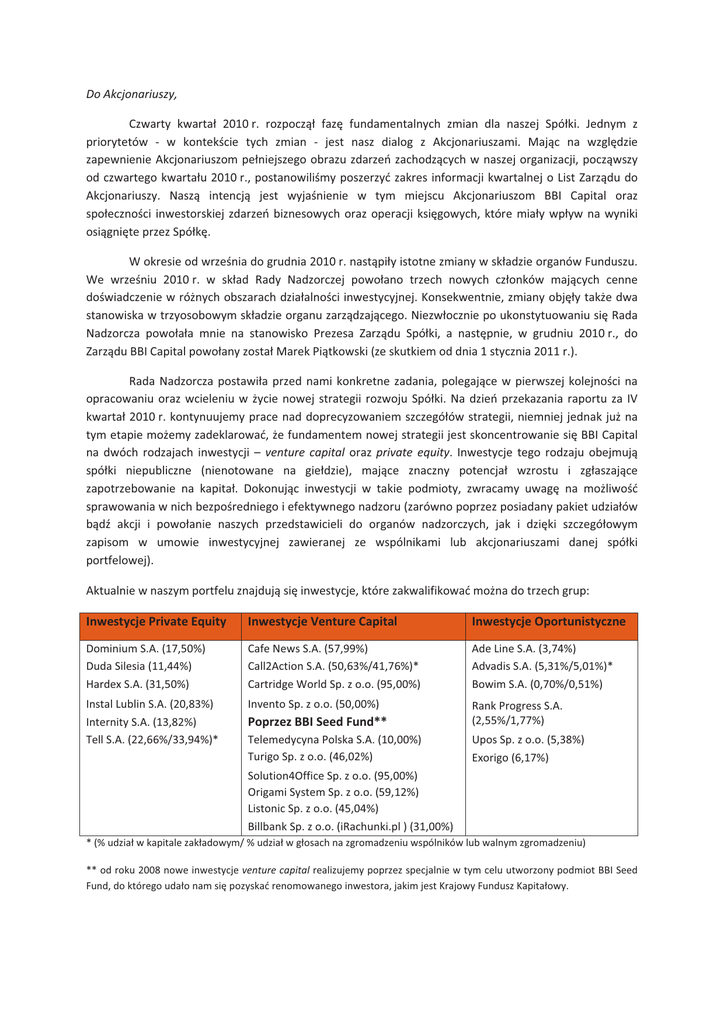 ŽŬĐũŽŶĂƌŝƵƐnjLJ͕ njǁĂƌƚLJ ŬǁĂƌƚĂų ϮϬϭϬƌ͘ ƌŽnjƉŽĐnjČų ĨĂnjħ ĨƵŶĚĂŵĞŶƚĂůŶLJĐŚ njŵŝĂŶ ĚůĂ ŶĂƐnjĞũ ^ƉſųŬŝ͘ :ĞĚŶLJŵ nj ƉƌŝŽƌLJƚĞƚſǁ Ͳ ǁ ŬŽŶƚĞŬƑĐŝĞ ƚLJĐŚ njŵŝĂŶ Ͳ ũĞƐƚ ŶĂƐnj ĚŝĂůŽŐ nj ŬĐũŽŶĂƌŝƵƐnjĂŵŝ͘ DĂũČĐ ŶĂ ǁnjŐůħĚnjŝĞ njĂƉĞǁŶŝĞŶŝĞŬĐũŽŶĂƌŝƵƐnjŽŵƉĞųŶŝĞũƐnjĞŐŽŽďƌĂnjƵnjĚĂƌnjĞŷnjĂĐŚŽĚnjČĐLJĐŚǁŶĂƐnjĞũŽƌŐĂŶŝnjĂĐũŝ͕ƉŽĐnjČǁƐnjLJ ŽĚĐnjǁĂƌƚĞŐŽŬǁĂƌƚĂųƵϮϬϭϬƌ͕͘ƉŽƐƚĂŶŽǁŝůŝƑŵLJƉŽƐnjĞƌnjLJđnjĂŬƌĞƐŝŶĨŽƌŵĂĐũŝŬǁĂƌƚĂůŶĞũŽ>ŝƐƚĂƌnjČĚƵĚŽ ŬĐũŽŶĂƌŝƵƐnjLJ͘ EĂƐnjČ ŝŶƚĞŶĐũČ ũĞƐƚ ǁLJũĂƑŶŝĞŶŝĞ ǁ ƚLJŵ ŵŝĞũƐĐƵ ŬĐũŽŶĂƌŝƵƐnjŽŵ / ĂƉŝƚĂů ŽƌĂnj ƐƉŽųĞĐnjŶŽƑĐŝ ŝŶǁĞƐƚŽƌƐŬŝĞũ njĚĂƌnjĞŷ ďŝnjŶĞƐŽǁLJĐŚ ŽƌĂnj ŽƉĞƌĂĐũŝ ŬƐŝħŐŽǁLJĐŚ͕ ŬƚſƌĞ ŵŝĂųLJ ǁƉųLJǁ ŶĂ ǁLJŶŝŬŝ ŽƐŝČŐŶŝħƚĞƉƌnjĞnj^ƉſųŬħ͘ tŽŬƌĞƐŝĞŽĚǁƌnjĞƑŶŝĂĚŽŐƌƵĚŶŝĂϮϬϭϬƌ͘ŶĂƐƚČƉŝųLJŝƐƚŽƚŶĞnjŵŝĂŶLJǁƐŬųĂĚnjŝĞŽƌŐĂŶſǁ&ƵŶĚƵƐnjƵ͘ tĞ ǁƌnjĞƑŶŝƵ ϮϬϭϬƌ͘ ǁ ƐŬųĂĚ ZĂĚLJ EĂĚnjŽƌĐnjĞũ ƉŽǁŽųĂŶŽ ƚƌnjĞĐŚ ŶŽǁLJĐŚ ĐnjųŽŶŬſǁ ŵĂũČĐLJĐŚ ĐĞŶŶĞ ĚŽƑǁŝĂĚĐnjĞŶŝĞǁƌſǏŶLJĐŚŽďƐnjĂƌĂĐŚĚnjŝĂųĂůŶŽƑĐŝŝŶǁĞƐƚLJĐLJũŶĞũ͘<ŽŶƐĞŬǁĞŶƚŶŝĞ͕njŵŝĂŶLJŽďũħųLJƚĂŬǏĞĚǁĂ ƐƚĂŶŽǁŝƐŬĂǁƚƌnjLJŽƐŽďŽǁLJŵƐŬųĂĚnjŝĞŽƌŐĂŶƵnjĂƌnjČĚnjĂũČĐĞŐŽ͘EŝĞnjǁųŽĐnjŶŝĞƉŽƵŬŽŶƐƚLJƚƵŽǁĂŶŝƵƐŝħZĂĚĂ EĂĚnjŽƌĐnjĂ ƉŽǁŽųĂųĂ ŵŶŝĞ ŶĂ ƐƚĂŶŽǁŝƐŬŽ WƌĞnjĞƐĂ ĂƌnjČĚƵ ^ƉſųŬŝ͕ Ă ŶĂƐƚħƉŶŝĞ͕ ǁ ŐƌƵĚŶŝƵ ϮϬϭϬƌ͕͘ ĚŽ ĂƌnjČĚƵ/ĂƉŝƚĂůƉŽǁŽųĂŶLJnjŽƐƚĂųDĂƌĞŬWŝČƚŬŽǁƐŬŝ;njĞƐŬƵƚŬŝĞŵŽĚĚŶŝĂϭƐƚLJĐnjŶŝĂϮϬϭϭƌ͘Ϳ͘ ZĂĚĂ EĂĚnjŽƌĐnjĂ ƉŽƐƚĂǁŝųĂ ƉƌnjĞĚ ŶĂŵŝ ŬŽŶŬƌĞƚŶĞ njĂĚĂŶŝĂ͕ ƉŽůĞŐĂũČĐĞ ǁ ƉŝĞƌǁƐnjĞũ ŬŽůĞũŶŽƑĐŝ ŶĂ ŽƉƌĂĐŽǁĂŶŝƵ ŽƌĂnj ǁĐŝĞůĞŶŝƵ ǁ ǏLJĐŝĞ ŶŽǁĞũ ƐƚƌĂƚĞŐŝŝ ƌŽnjǁŽũƵ ^ƉſųŬŝ͘ EĂ ĚnjŝĞŷ ƉƌnjĞŬĂnjĂŶŝĂ ƌĂƉŽƌƚƵ njĂ /s ŬǁĂƌƚĂųϮϬϭϬƌ͘ŬŽŶƚLJŶƵƵũĞŵLJƉƌĂĐĞŶĂĚĚŽƉƌĞĐLJnjŽǁĂŶŝĞŵƐnjĐnjĞŐſųſǁƐƚƌĂƚĞŐŝŝ͕ŶŝĞŵŶŝĞũũĞĚŶĂŬũƵǏŶĂ ƚLJŵĞƚĂƉŝĞŵŽǏĞŵLJnjĂĚĞŬůĂƌŽǁĂđ͕ǏĞĨƵŶĚĂŵĞŶƚĞŵŶŽǁĞũƐƚƌĂƚĞŐŝŝũĞƐƚƐŬŽŶĐĞŶƚƌŽǁĂŶŝĞƐŝħ/ĂƉŝƚĂů ŶĂ ĚǁſĐŚ ƌŽĚnjĂũĂĐŚ ŝŶǁĞƐƚLJĐũŝ ʹ ǀĞŶƚƵƌĞ ĐĂƉŝƚĂů ŽƌĂnj ƉƌŝǀĂƚĞ ĞƋƵŝƚLJ͘ /ŶǁĞƐƚLJĐũĞ ƚĞŐŽ ƌŽĚnjĂũƵ ŽďĞũŵƵũČ ƐƉſųŬŝ ŶŝĞƉƵďůŝĐnjŶĞ ;ŶŝĞŶŽƚŽǁĂŶĞ ŶĂ ŐŝĞųĚnjŝĞͿ͕ ŵĂũČĐĞ njŶĂĐnjŶLJ ƉŽƚĞŶĐũĂų ǁnjƌŽƐƚƵ ŝ njŐųĂƐnjĂũČĐĞ njĂƉŽƚƌnjĞďŽǁĂŶŝĞ ŶĂ ŬĂƉŝƚĂų͘ ŽŬŽŶƵũČĐ ŝŶǁĞƐƚLJĐũŝ ǁ ƚĂŬŝĞ ƉŽĚŵŝŽƚLJ͕ njǁƌĂĐĂŵLJ ƵǁĂŐħ ŶĂ ŵŽǏůŝǁŽƑđ ƐƉƌĂǁŽǁĂŶŝĂǁŶŝĐŚďĞnjƉŽƑƌĞĚŶŝĞŐŽŝĞĨĞŬƚLJǁŶĞŐŽŶĂĚnjŽƌƵ;njĂƌſǁŶŽƉŽƉƌnjĞnjƉŽƐŝĂĚĂŶLJƉĂŬŝĞƚƵĚnjŝĂųſǁ ďČĚǍ ĂŬĐũŝ ŝ ƉŽǁŽųĂŶŝĞ ŶĂƐnjLJĐŚ ƉƌnjĞĚƐƚĂǁŝĐŝĞůŝ ĚŽ ŽƌŐĂŶſǁ ŶĂĚnjŽƌĐnjLJĐŚ͕ ũĂŬ ŝ ĚnjŝħŬŝ ƐnjĐnjĞŐſųŽǁLJŵ njĂƉŝƐŽŵ ǁ ƵŵŽǁŝĞ ŝŶǁĞƐƚLJĐLJũŶĞũ njĂǁŝĞƌĂŶĞũ njĞ ǁƐƉſůŶŝŬĂŵŝ ůƵď ĂŬĐũŽŶĂƌŝƵƐnjĂŵŝ ĚĂŶĞũ ƐƉſųŬŝ ƉŽƌƚĨĞůŽǁĞũͿ͘ ŬƚƵĂůŶŝĞǁŶĂƐnjLJŵƉŽƌƚĨĞůƵnjŶĂũĚƵũČƐŝħŝŶǁĞƐƚLJĐũĞ͕ŬƚſƌĞnjĂŬǁĂůŝĨŝŬŽǁĂđŵŽǏŶĂĚŽƚƌnjĞĐŚŐƌƵƉ͗ /ŶǁĞƐƚLJĐũĞWƌŝǀĂƚĞƋƵŝƚLJ /ŶǁĞƐƚLJĐũĞsĞŶƚƵƌĞĂƉŝƚĂů /ŶǁĞƐƚLJĐũĞKƉŽƌƚƵŶŝƐƚLJĐnjŶĞ ŽŵŝŶŝƵŵ^͘͘;ϭϳ͕ϱϬйͿ ƵĚĂ^ŝůĞƐŝĂ;ϭϭ͕ϰϰйͿ ,ĂƌĚĞdž^͘͘;ϯϭ͕ϱϬйͿ ĂĨĞEĞǁƐ^͘͘;ϱϳ͕ϵϵйͿ ĂůůϮĐƚŝŽŶ^͘͘;ϱϬ͕ϲϯйͬϰϭ͕ϳϲйͿΎ ĂƌƚƌŝĚŐĞtŽƌůĚ^Ɖ͘njŽ͘Ž͘;ϵϱ͕ϬϬйͿ ĚĞ>ŝŶĞ^͘͘;ϯ͕ϳϰйͿ ĚǀĂĚŝƐ^͘͘;ϱ͕ϯϭйͬϱ͕ϬϭйͿΎ Žǁŝŵ^͘͘;Ϭ͕ϳϬйͬϬ͕ϱϭйͿ /ŶƐƚĂů>ƵďůŝŶ^͘͘;ϮϬ͕ϴϯйͿ /ŶƚĞƌŶŝƚLJ^͘͘;ϭϯ͕ϴϮйͿ dĞůů^͘͘;ϮϮ͕ϲϲйͬϯϯ͕ϵϰйͿΎ /ŶǀĞŶƚŽ^Ɖ͘njŽ͘Ž͘;ϱϬ͕ϬϬйͿ ZĂŶŬWƌŽŐƌĞƐƐ^͘͘ ;Ϯ͕ϱϱйͬϭ͕ϳϳйͿ ^ŽůƵƚŝŽŶϰKĨĨŝĐĞ^Ɖ͘njŽ͘Ž͘;ϵϱ͕ϬϬйͿ KƌŝŐĂŵŝ^LJƐƚĞŵ^Ɖ͘njŽ͘Ž͘;ϱϵ͕ϭϮйͿ >ŝƐƚŽŶŝĐ^Ɖ͘njŽ͘Ž͘;ϰϱ͕ϬϰйͿ ŝůůďĂŶŬ^Ɖ͘njŽ͘Ž͘;ŝZĂĐŚƵŶŬŝ͘ƉůͿ;ϯϭ͕ϬϬйͿ WŽƉƌnjĞnj/^ĞĞĚ&ƵŶĚΎΎ dĞůĞŵĞĚLJĐLJŶĂWŽůƐŬĂ^͘͘;ϭϬ͕ϬϬйͿ dƵƌŝŐŽ^Ɖ͘njŽ͘Ž͘;ϰϲ͕ϬϮйͿ hƉŽƐ^Ɖ͘njŽ͘Ž͘;ϱ͕ϯϴйͿ džŽƌŝŐŽ;ϲ͕ϭϳйͿ Ύ;йƵĚnjŝĂųǁŬĂƉŝƚĂůĞnjĂŬųĂĚŽǁLJŵͬйƵĚnjŝĂųǁŐųŽƐĂĐŚŶĂnjŐƌŽŵĂĚnjĞŶŝƵǁƐƉſůŶŝŬſǁůƵďǁĂůŶLJŵnjŐƌŽŵĂĚnjĞŶŝƵͿ ΎΎŽĚƌŽŬƵϮϬϬϴŶŽǁĞŝŶǁĞƐƚLJĐũĞǀĞŶƚƵƌĞĐĂƉŝƚĂůƌĞĂůŝnjƵũĞŵLJƉŽƉƌnjĞnjƐƉĞĐũĂůŶŝĞǁƚLJŵĐĞůƵƵƚǁŽƌnjŽŶLJƉŽĚŵŝŽƚ/^ĞĞĚ &ƵŶĚ͕ĚŽŬƚſƌĞŐŽƵĚĂųŽŶĂŵƐŝħƉŽnjLJƐŬĂđƌĞŶŽŵŽǁĂŶĞŐŽŝŶǁĞƐƚŽƌĂ͕ũĂŬŝŵũĞƐƚ<ƌĂũŽǁLJ&ƵŶĚƵƐnj<ĂƉŝƚĂųŽǁLJ͘ ZſǏŶŽƌŽĚŶŽƑđ ŝŶǁĞƐƚLJĐũŝ ǁĐŚŽĚnjČĐLJĐŚ ǁ ƐŬųĂĚ ƉŽƌƚĨĞůĂ ŝŶǁĞƐƚLJĐLJũŶĞŐŽ ǁLJŵĂŐĂ ŽĚ ŶĂƐ Ͳ ĂƌnjČĚƵ ŝ LJƌĞŬƚŽƌſǁ/ŶǁĞƐƚLJĐLJũŶLJĐŚ/ĂƉŝƚĂůͲƐƚŽ