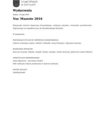 Wydarzenia Sobota, 14 maja 2016 Noc Muzeów 2016 Wspaniałe stulecie Imperium Osmańskiego, rozkosze zmysłów, orientalne przebieranki... Zapraszamy na wyjatkową noc do Szymbarskiego Kasztelu. W programie: WSPANIAŁE STULECIE IMPERIUM OSMAŃSKIEGO stylowe aranżacje wnętrz, Sułtani i Sułtanki, seraj Osmanów, tajemnice haremu. ROZKOSZE ZMYSŁÓW kawa po turecku, bakalie, nargile, henna, muzyka i taniec brzucha, plenerowy seans filmowy. ORIENTALNE PRZEBIERANKI sesja zdjęciowa - użyczamy strojów Mile widziane własne przebrania w stylowe kostiumy WSTĘP WOLNY! ZAPRASZAMY