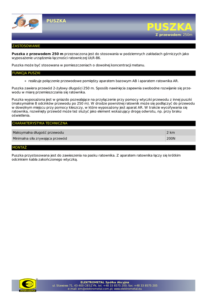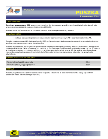 PUSZKA PUSZKA Z przewodem: 250m ZASTOSOWANIE Puszka z przewodem 250 m przeznaczona jest do stosowania w podziemnych zakładach górniczych jako wyposażenie urządzenia łączności ratowniczej UŁR-86. Puszka może być stosowana w pomieszczeniach o dowolnej koncentracji metanu. FUNKCJA PUSZKI realizuje połączenie przewodowe pomiędzy aparatem bazowym AB i aparatem ratownika AR. Puszka zawiera przewód 2-żyłowy długości 250 m. Sposób nawinięcia zapewnia swobodne rozwijanie się przewodu w miarę przemieszczania się ratownika. Puszka wyposażona jest w gniazdo pozwalające na przyłączenie przy pomocy wtyczki przewodu z innej puszki (maksymalnie 8 odcinków przewodu po 250 m). W drodze powrotnej ratownik może się podłączyć do przewodu w dowolnym miejscu przy pomocy kleszczy, w które wyposażony jest aparat AR. W trakcie wycofywania się ratownika, rozwinięty przewód może też służyć jako element wskazujący drogę odwrotu, np. przy braku oświetlenia. CHARAKTERYSTYKA TECHNICZNA Maksymalna długość przewodu 2 km Minimalna siła zrywająca przewód 200N MONTAŻ Puszka przystosowana jest do zawieszenia na pasku ratownika. Z aparatem ratownika łączy się krótkim odcinkiem kabla zakończonego wtyczką. ELEKTROMETAL Spółka Akcyjna ul. Stawowa 71, 43-400 CIESZYN, tel. +48 33 8575 200; fax: +48 33 8575 205 e-mail: [email protected]; www.elektrometal.eu