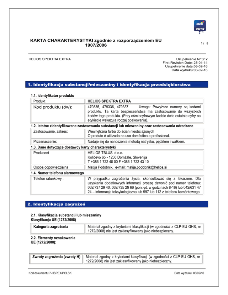 KARTA CHARAKTERYSTYKI zgodnie z rozporządzeniem EU 1907/2006 1/ 8 Uzupełnienie Nr:3/ 2 First Revision Date: 25-04-14 Uzupełnienie data:03-02-16 Data wydruku:03-02-16 HELIOS SPEKTRA EXTRA 1. Identyfikacja substancji/mieszaniny i identyfikacja przedsiębiorstwa 1.1. Identyfikator produktu Produkt HELIOS SPEKTRA EXTRA 479335, 479336, 479337 Uwaga: Powyższe numery są kodami Kod produktu (ów): produktu. Ta karta bezpieczeństwa ma zastosowanie do wszystkich kodów tego produktu. (Przy ośmiocyfrowym kodzie dwie ostatnie cyfry na etykiecie wskazują rodzaj opakowania). 1.2. Istotne zidentyfikowane zastosowania substancji lub mieszaniny oraz zastosowania odradzane Zastosowanie, zakres: Wewnętrzna farba do ścian nieobciążonych O produto é utilizado no uso doméstico e profissional. Przeznaczenie: Nadaje się do nanoszenia metodą natrysku, pędzlem i wałkiem. 1.3. Dane dotyczące dostawcy karty charakterystyki Producent HELIOS TBLUS d.o.o. Količevo 65 • 1230 Domžale, Slovenija T +386 1 722 40 00 F +386 1 722 43 10 Osoba odpowiedzialna Matija Podobnik, e-mail: [email protected] 1.4. Numer telefonu alarmowego Telefon ratunkowy : W przypadku zagrożenia życia, skonsultować się z lekarzem. Dla uzyskania dodatkowych informacji proszę dzwonić pod numer telefonu: 062/737 29 40; 062/735 29 66 (pon.-pt. w godzinach 8-16) lub 042/631 47 24 – informacja toksykologiczna lub 997 lub 112 z telefonu komórkowego 2. Identyfikacja zagrożeń 2.1. Klasyfikacja substancji lub mieszaniny Klasyfikacja UE (1272/2008) Kategoria zagrożenia Materiał zgodny z kryteriami klasyfikacji (w zgodności z CLP-EU GHS, nr 1272/2008) nie jest zaklasyfikowany jako niebezpieczny. 2.2. Elementy oznakowania UE (1272/2008): Zwroty zagrożenia (zwroty H) Kod dokumentu:7-HSPEX/POLSK Materiał zgodny z kryteriami klasyfikacji (w zgodności z CLP-EU GHS, nr 1272/2008) nie jest zaklasyfikowany jako niebezpieczny. Data wydruku: 03/02/16 Uzupełnienie Nr: 3 HELIOS SPEKTRA EXTRA Środki ostróżnośći: 2/ 8 Uzupełnienie data: 03/02/16 P101 - W razie konieczności zasięgnięcia porady lekarza należy pokazać pojemnik lub etykietę. P102 - Chronić przed dziećmi. 2.3. Inne zagrożenia Brak dostępnych danych 3. Skład/informacja o składnikach 3.2. Mieszaniny Skład chemiczny: Nazwa chemiczna Farba do ścian wewnetrznych. Dyspersje octan winylu-wersenian. Stężenie [masa %] Mieszanina nie zawiera niebezpiecznych składników. CAS EINECS EU INDEX REACH reg.no. Klasyfikacja (Rozporządzenie (WE) nr 1272/2008) - 4. Środki pierwszej pomocy 4.1. Opis środków pierwszej pomocy W przypadku dostania się w W przypadku wystąpienia wszelkich objawów wyprowadzić osobę nadmiernej ilości do dróg poszkodowaną na świeże powietrze. oddechowych: W przypadku kontaktu ze Zdjąć skażoną odzież. Przemyć skórę wodą z mydłem. skórą: W przypadku kontaktu z Przepłukać oczy wodą, aby usunąć pozostałości produktu. oczami: W przypadku połknięcia: Nie jeść. Przepłukać usta wodą. Nie wywoływać wymiotów. 4.2. Najważniejsze ostre i opóźnione objawy oraz skutki narażenia W przypadku dostania się w Brak danych nadmiernej ilości do dróg oddechowych: W przypadku kontaktu ze Dane nie są znane. skórą: W przypadku kontaktu z Dane nie są znane. oczami: W przypadku połknięcia: Dane nie są znane. 4.3. Wskazania dotyczące wszelkiej natychmiastowej pomocy lekarskiej i szczególnego postępowania z poszkodowanym Brak dostępnych danych Kod dokumentu:7-HSPEX Data wydruku: 03/02/16 Uzupełnienie Nr: 3 HELIOS SPEKTRA EXTRA 3/ 8 Uzupełnienie data: 03/02/16 5. Postępowanie w przypadku pożaru 5.1. Środki gaśnicze Pożar, środki gaśnicze: Z uwagi na brak właściwości palnych produkt nie wymaga specjalnego traktowania. Wyrób niepalny. Należy zamykać naczynia z wyrobem. Otwarty strumień wody Nieodpowiednie substancje gaśnicze: 5.2. Szczególne zagrożenia związane z substancją lub mieszaniną Metody gaszenia ognia: Nie są potrzebne 5.3. Informacje dla straży pożarnej Specjalne wyposażenie Brak specjalnych właściwości. ochronne strażaków: 6. Postępowanie w przypadku niezamierzonego uwolnienia do środowiska 6.1. Indywidualne środki ostrożności, wyposażenie ochronne i procedury w sytuacjach awaryjnych Indywidualne środki Zapewnić dobrą wentylację ostrożności: 6.2. Środki ostrożności w zakresie ochrony środowiska Środki ochrony środowiska: Zapobiec rozlaniu do wody, wodnych ujęć, piwnic, jam lub kanalizacji 6.3. Metody i materiały zapobiegające rozprzestrzenianiu się skażenia i służące do usuwania skażenia Metody oczyszczania: Wylew zatamować i wymieszać rozlany produkt z ziemią, piaskiem lub innymi materiałemi adsorbującymi ciecze. 7. Postępowanie z substancjami i mieszaninami oraz ich magazynowanie 7.1. Środki ostrożności dotyczące bezpiecznego postępowania Indywidualne środki Wyrób nie jest niebezpieczny i nie wymaga szczególnego obchodzenia. ostrożności: Należy wymagać przestrzegania przepisów BHP. Naczynia z wyrobem należy zamykać. W czasie użycia nie spożywać pokarmów i nie pić. Wskazówki dotyczące Produkt nie zawiera niebezpiecznych substancji chemicznych. Należy bezpiecznego użytkowania: stosować dobre praktyki branżowe i przestrzegać higieny osobistej. Unikać kontaktu produktu z oczami i skórą. 7.2. Warunki bezpiecznego magazynowania, łącznie z informacjami dotyczącymi wszelkich wzajemnych niezgodności Środki techniczne i warunki: Przechowywać w temperaturze 5-35°C. PRODUKT NIE MOŻE ZAMARZNĄC. Nie magazynować łącznie z żywnością lub pokarmem dla zwierząt. Produkt należy przechowywać w dobrze zamkniętym naczyniu w suchym i dobrze wentylowanym miejscu, względnie zgodnie z warunkami na etykiecie lub w dokumentacji technicznej. Opakowanie musi być oznaczone z oryginalną etykietą producenta. Klasa składowania: 12 (wytyczne German VCI) 7.3. Szczególne zastosowanie(-a) końcowe Kod dokumentu:7-HSPEX Data 