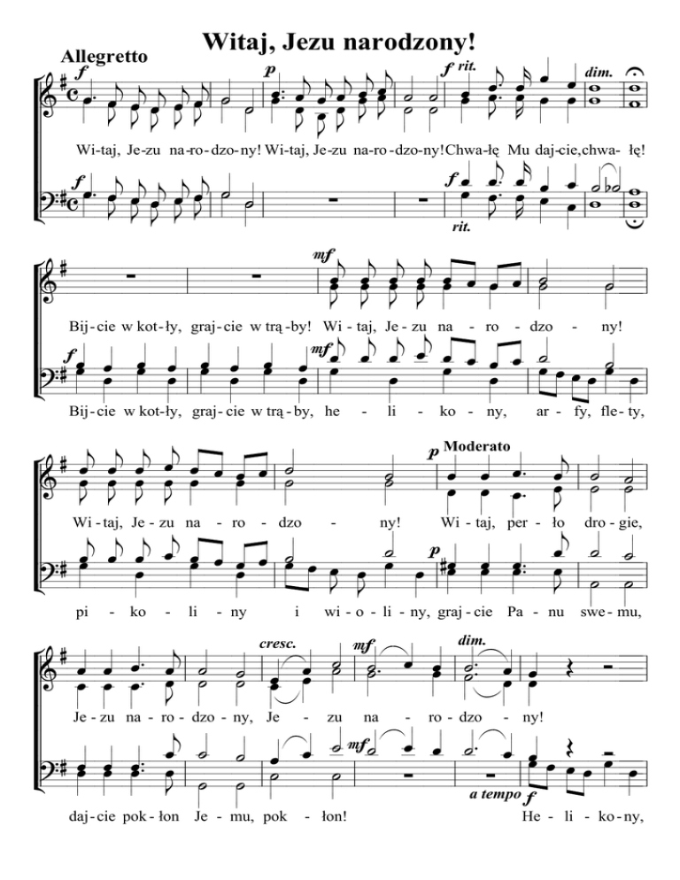 Witaj, Jezu narodzony! «« dim. U rit. « « « p f « f « ˆ « ¬ #c « « « « « « « « « « « . k ˆ« w w «« « «ˆ« .. «j «« «j «j ˆ j « « « « « ˆ « « « ˆ j ˆ « « « « « « . œ J ˙ ˙ œ J . œ K̂ « « « « » « « » » ˆ«œ»» Jj ˆ« Ĵœ» Jœ»» »» l ˙» ˙» l œ»» »» »» œ»» œ»» l w = «Jj Ĵœ«»» l ˙«»»» «˙«» l œ»»» Ĵœ» _j j wl “& ====================== l Ĵ«œ»» «Jj ˆ œ l « » ˆ œ « » » œˆ»«»» «j » » » » » œ J »» »» »» »» »» »» » »» » » » “l “l Wi-taj, Je-zu na -ro - dzo- ny! Wi-taj, Je -zu na-ro -dzo-ny!Chwa-łę Mu daj-cie,chwa- łę! «««ˆ ««j.«ˆ ««k «« «« «« « “l f «« «« « « « «« «« « f ˆ « « _œ» _Jœ . _Kœ ˆ« _«ˆ ˙« b˙« w ˆ œ . ˙ « » « « » « # œ Ĵ j œ Ĵ j » « « » « « »»» »»» œ»» œ» w w œ»ˆ«» j Ĵ«œ»» »» »» ˙»«» j »» »» Jj » c œ Ĵ ∑ ∑ » « “L“? l====================== » » » » » l » l » »» l = l l l lu l rit. F« « « « « « « « ¬ # «ˆ«œ «ˆ« «««œ̂ ˆ«« «˙«˙ «j «j «j ««˙«» «j ∑ ∑ ˆ « « « « œ J œ Ĵ œ Ĵ œ Ĵ » » » » » » » “& ====================== l l l »» »» »» »» »» »» l »» »» =l “l cie w kot- ły, graj- cie w trą -by! Wi - taj, Je - zu na - ro - dzo ny! « “l Bij« « « « « « «« «« «« «« «« «« «« «« F_«j «j «« _ˆ««« _«˙« «« « « « _ ˆ « « f ˆ ˆ j ˆ j « ˆ « « « _ _ _ _ _ « ˆ « œ»» œ» œ» ˙«œ» “l # ˆ«œ»» ˆ« ˆ«œ»» ˆ« ˆ«œ»» ˆ« ˆ«œ»» ˆ« œ»» œ » » »» œ»» œ œ œ œ œ œ̂ » » œ » » » » » » » » » » » » » » » » » » » » » » » l L“? ====================== » = » » l » » l » » l » l Allegretto Bij- cie w kot-ły, graj- cie w trą - by, he - li - ko - ny, ar - fy, fle - ty, Moderato « p « « « « « « « « « « «« «« ««ˆ« . «« «« «« ¬ # «j ˆ« «ˆ« «ˆ« «« ««ˆ «˙« ˆ«Jœ «j ˆ«Jœ «j ˆ«Jœ j « ˙«˙» ˆ« ˆ« j «Ĵœ» l ˙«˙» = ˙«˙» l œ̂»» l ˙»» ====================== “& l »»» »»» »»» Jœ»»» œ»»» l » œ œ »»» »»» _»œ» . »» »» »» » » » » “l Je - zu na - ro - dzo ny! Wi - taj, per - ło dro - gie, « «« «« « “l Wi« - taj, « « « « « « « « « « « « « ««˙ « ˙ p j ˙ « « « « « « « _ ˆ j « « _ _ _ _ « ˆ j « ˆ « ˆ j ˆ j « « « « « « « « ˆ « ˆ “l # œ»» œ»» «œ̂» œ̇»»» œ»» Jœ» Jœ» œ»» œ» #ˆ«œ» ˆ«œ» ˆ«œ» .. Ĵœ» œ » » » »» l » »» »» » »» l »» »» »» »» l ˙»» = »» ˙»» l L“? ====================== l » » pi - ko - li - ny i wi - o - li - ny, graj - cie Pa - nu swe - mu, «« F«« «« «« dim. «« . «« « ¬ # «« «« ««ˆ . «« «« « cresc. « ˙ ˆ « « « « ˙ ˆ «œ»» l ˙«˙» . ˆ« l «ˆ« Œ Ó =l «Ĵœ» l ˙«˙» «˙«˙» l «ˆ« ˆ«œ» ˙»»» l «˙»» . ====================== l _ˆ«»œ _ˆ«»œ _«»œ . j “& »» œ»»» œ»»» _»œ» »» » » » » » » » » » » » » “l » » » - ny, Je - zu na - ro - dzo - ny! “l Je - zu na - ro« - dzo « « «« _««ˆ «« «« . «« « Œ « « « « « _ ˙ F « « « « _Óœ» « _«˙ «˙« «ˆ« _«ˆ _ _˙« _ _ˆ« _˙« _«ˆ ««»œ̂ œ» “l # ««ˆ« ««ˆ« ««ˆ« . _j . Ĵœ»» »» »» »œ»» œ»» »» œ»» œ œ œ » » » ˙ ˙ » » ∑ ∑ » » » “L“? l====================== » » l » » » » l ˙»» ˙»» l » l a tempol » = » l » l » » f daj- cie pok - łon Je - mu, pok - łon! He - li - ko - ny, a tempo F «« «« « « « «« « « « ¬ # ««j ««j ««j ««j « « « « « « ««˙« « j « « « « « « ˆ j j ˆ j ˆ j ˙ « « « « « « « « « j j « « ˆ « « ˙ ˆ j « « « « « « « ˙«»» l Jœ»» Ĵœ»» Jœ»» Ĵœ»» Jœ»» Ĵœ»» Jœ»» Ĵœ»» l ˙»» ˙»»=l “& ====================== l Ĵœ»»» Ĵœ»»» Ĵœ»»» Jœ»»» œ̂»»» ˆ« ˆ«œ»»» ˆ« l ˙»»» » » » » » » » » » » » “l pod nie- bio - sy, nie-chaj chwa-ła Je -zu -so -wi bę - dzie «« brzmią «« gło«« sy_««j «« «« « «« «« «« “l Niech « « « « « « « « « ˆ « « « «ˆœ» _j «ˆ _j «ˆ _ _ˆ«œ» _ˆ« «« _ˆ« _«œ̇» «˙«œ» «j «j «j «˙«œ» _j ˆ« «j _«˙œ» «j «j ˆ ˆ ˆ ˆ « « « « « ˆ ˆ « « “l # _j œ ˆ j » « » œ œ » . Kœ»» »» œ̂»» »» »» œ»»» œ»» »» œ»» »» »» »» Jœ»» Jœ»» »» œ»» »» œ J œ œ œ » » » » » » » » L“? ====================== l » » l » l » » » l » » =» l » » trą - by, fa -go - ty, graj - cie Pa -nu, kon - tra - ba - sy i wi -o - li -ny, «« « « « « « Moderato f « « « p « «« «« «« « ˆ «j ¬ # «ˆ« «ˆ« «˙« « «ˆ« «j « « « « « « « « «j «j « ˆ « « « « « « « « j ˆ« . j « « « ˆ ˆ ˆ j j ˆ ˆ ˆ ˙ «˙«˙ « « « « « « ˆ j « œ œ œ J œ Ĵ œ Ĵ œ Ĵ œ œ œ J œ Ĵ œ Ĵ œ J » » » » » » » » » » » » ˙ ====================== “& l œ»» œ»» »»» l »» »» »» »» »» »» l »» »» »» »» »» »» l œ»» œ»» œ»» . «Jœ»» l «˙»» = »»» l » » » » » “l » » - mi. A - nie- li śpie-wa - ją, pas- te - rze klę - ka - ją, pas- te - rze klę - ka - ją, “l na « zie «« _««j «« «« «« _««j «« «« p« « « «« «« «« « « « « « « « « « ˆ ˆ « « « « «ˆJœ»» _Jœ» _«ˆœ» _«ˆœ» _j «ˆJœ» _œ»J _j «ˆJœ» _œj «ˆ _«˙ _«˙ _J»j œ«ˆ» _j _j « “l # ««œ̂» _«œ̂»» _ˆ«œ»» ««œ̂» «˙« f «ˆ«œ» «ˆ«œ» «j « « « « œ Ĵ Ĵ #ˆ ˆ ˆ . » » « « « »» »» »» »» ˙»» »» »» 