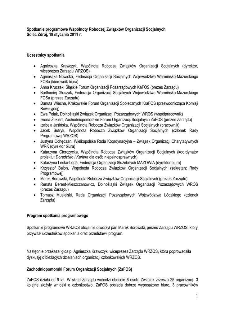 Spotkanie programowe Wspólnoty Roboczej Związków Organizacji Socjalnych Solec Zdrój, 18 stycznia 2011 r. Uczestnicy spotkania Agnieszka Krawczyk, Wspólnota Robocza Związków Organizacji Socjalnych (dyrektor, wiceprezes Zarządu WRZOS) Agnieszka Nowicka, Federacja Organizacji Socjalnych Województwa Warmińsko-Mazurskiego FOSa (kierownik biura) Anna Kruczek, Śląskie Forum Organizacji Pozarządowych KaFOS (prezes Zarządu) Bartłomiej Głuszak, Federacja Organizacji Socjalnych Województwa Warmińsko-Mazurskiego FOSa (prezes Zarządu) Danuta Wiecha, Krakowskie Forum Organizacji Społecznych KraFOS (przewodnicząca Komisji Rewizyjnej) Ewa Polak, Dolnośląski Związek Organizacji Pozarządowych WROS (współpracownik) Iwona Żukiert, Zachodniopomorskie Forum Organizacji Socjalnych ZaFOS (prezes Zarządu) Izabela Jasińska, Wspólnota Robocza Związków Organizacji Socjalnych (pracownik) Jacek Sutryk, Wspólnota Robocza Związków Organizacji Socjalnych (członek Rady Programowej WRZOS) Justyna Ochędzan, Wielkopolska Rada Koordynacyjna – Związek Organizacji Charytatywnych WRK (dyrektor biura) Katarzyna Gierczycka, Wspólnota Robocza Związków Organizacji Socjalnych (koordynator projektu: Doradztwo i Kariera dla osób niepełnosprawnych) Katarzyna Leśko-Loda, Federacja Organizacji Służebnych MAZOWIA (dyrektor biura) Krzysztof Balon, Wspólnota Robocza Związków Organizacji Socjalnych (sekretarz Rady Programowej) Marek Borowski, Wspólnota Robocza Związków Organizacji Socjalnych (prezes Zarządu) Renata Berent-Mieszczanowicz, Dolnośląski Związek Organizacji Pozarządowych WROS (prezes Zarządu) Tomasz Musielski, Rada Organizacji Pozarządowych Województwa Łódzkiego (członek Zarządu) Program spotkania programowego Spotkanie programowe WRZOS oficjalnie otworzył pan Marek Borowski, prezes Zarządu WRZOS, który przywitał uczestników spotkania oraz przedstawił program. Następnie przekazał głos p. Agnieszka Krawczyk, wiceprezes Zarządu WRZOS, która poprowadziła dyskusję o bieżących działaniach organizacji członkowskich WRZOS. Zachodniopomorski Forum Organizacji Socjalnych (ZaFOS) ZaFOS działa od 9 lat. W skład Zarządu wchodzi obecnie 6 osób. Związek zrzesza 25 organizacji, 3 kolejne złożyły wnioski o członkostwo. ZaFOS posiada dobrze wyposażone biuro, 3 pracowników 1 zatrudnionych na etat. W biurze jeden z pracowników odpowiada za kontakt z organizacjami członkowskimi ZaFOS, na bieżąco monitorując ich problemy i potrzeby. ZaFOS posiada swoją reprezentację w Radzie Pożytku Publicznego przy Prezydencie Miasta Szczecina, Urzędzie Marszałkowskim i Narodowym Funduszu Zdrowia. ZaFOS rozszerza swoją działalność na kolejne powiaty województwa zachodniopomorskiego (szczecinecki, wałecki). Obecnie realizuje projekt eZaFOS, który przede wszystkim zakłada zwiększenie liczby organizacji członkowskich ZaFOS do 40. W ramach projektu stworzona została strona internetowa stanowiąca platformę informacyjną dla organizacji, jak również organizowane są szkolenia dla organizacji członkowskich m.in.: z zakresu projektowania stron internetowych. ZaFOS realizuje również dwa projekty w ramach: - Działania 5.4.2. Rozwoju dialogu obywatelskiego (1,5 mln), w ramach projektu planuje zorganizować trzy punkty informacyjne w środowisk wiejskich w zakresie aktywności lokalnej; - Działania 9.5 Oddolne inicjatywy edukacyjne na obszarach wiejskich (powiat: pełczycki i choszczeński) Federacja Organizacji Socjalnych Województwa Warmińsko-Mazurskiego (FOSa) W skład Zarządu wchodzi 5 osób. FOSa zrzesza 32 organizacje członkowskie oraz współpracuje z 30 organizacjami partnerskimi. Biuro zatrudnia 4 pracowników etatowych. Związek prowadzi również działalność gospodarczą. FOSa prowadzi 4 grupy branżowe (m.in.: sieć organizacji działających na rzecz seniorów województwa warmińsko-mazurskiego, organizacje pracujące z osobami niepełnosprawnymi). Ponadto związek współpracuje z organizacjami, przy realizacji wspólnych projektów. Obecnie prowadzi działania w ramach następujących projektów: Wojewódzki Program Rozwoju Wolontariatu (finansowany z FIO), stworzenie Stowarzyszenia Młodych Filmowców, Wolontariat osób starszych (staże i organizacja szkoleń dla osób starszych w Holandii), Akcja FOSa Dzieciom (zbiórki jedzenia, zabawek dla dzieci, organizowanie wycieczek). Jednocześnie FOSa włącza się w Akcję Pomocy Powodzianom, wydaje Gazetę „GENERACJA” oraz współpracuje przy realizacji „Senior Games”. Istotnym działaniem jest realizowanie projektu: Doradztwo i Kariera dla osób niepełnosprawnych” wspólnie z Wspólnotą Roboczą Związków Organizacji Socjalnych. Rada Organizacji Pozarządowych Województwa Łódzkiego W skład Zarządu wchodzi 5 osób (społeczni członkowie). W biurze pracuje 3 pracowników etatowych. Rada zrzesza 49 organizacji członkowskich. Rada zdecydowanie zwiększyła swoją pozycję w regionie, zapraszana jest do konsultacji istotnych dokumentów strategicznych, jak i aktywnie uczestniczy w konferencje i spotkania województwa łódzkiego. Obecnie realizuje projekt w ramach Działania 9.1 Wyrównywanie szans edukacyjnych i zapewnienie wysokiej jakości usług edukacyjnych świadczonych w systemie oświaty (1,5 mln). W ostatnim czasie w ramach związku przeprowadzono analizę SWOT organizacji i na tej podstawie stworzono strategię działania Rady. Rozwój i realizacja poszczególnych projektów następuje wspólnie z organizacjami członkowskimi. Federacja Organizacji Służebnych MAZOWIA W skład Zarządu organizacji wchodzi 6 osób. W biurze pracuje 3 pracowników etatowych, dodatkowo pracują także współpracownicy zatrudnieni na podstawie umowy-zlecenia oraz wolontariusze, w charakterze: prawnik, księgowa, informatyk). MAZOWIA zrzesza obecnie 46 organizacji członkowskich – 33 organizacje warszawskie (w tym znajdują się silne organizacje ogólnopolskie) i 13 organizacj