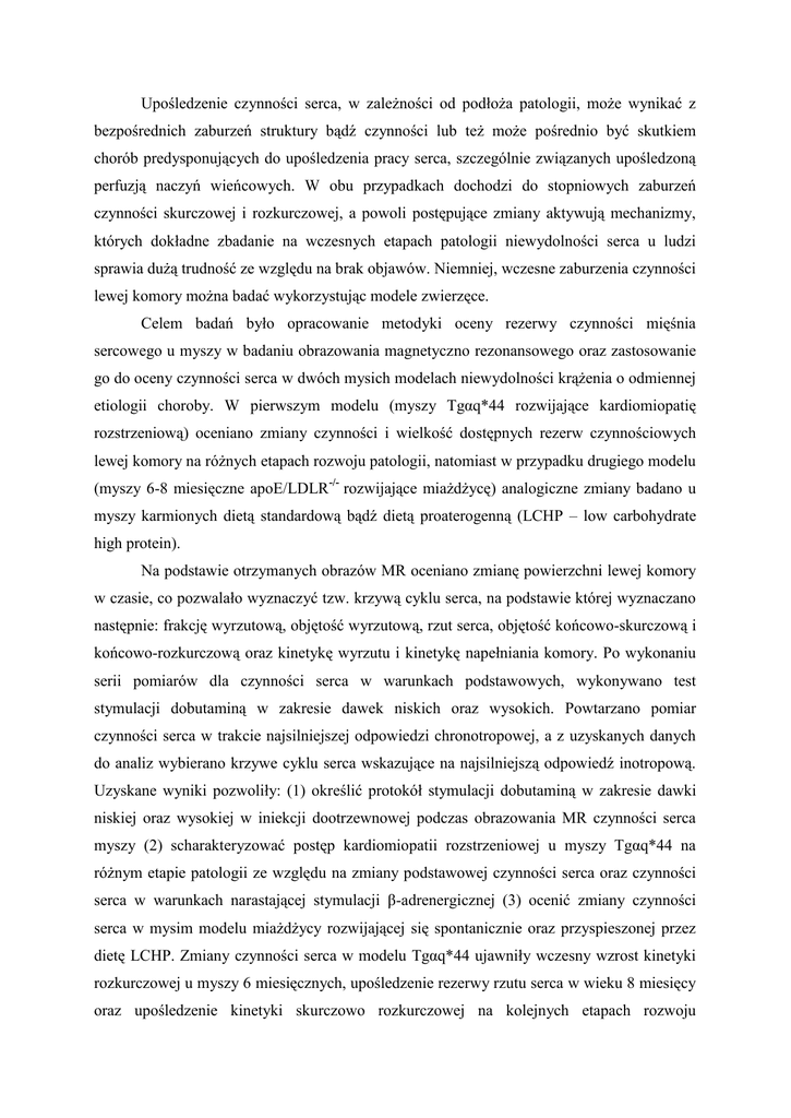 Upośledzenie czynności serca, w zależności od podłoża patologii, może wynikać z bezpośrednich zaburzeń struktury bądź czynności lub też może pośrednio być skutkiem chorób predysponujących do upośledzenia pracy serca, szczególnie związanych upośledzoną perfuzją naczyń wieńcowych. W obu przypadkach dochodzi do stopniowych zaburzeń czynności skurczowej i rozkurczowej, a powoli postępujące zmiany aktywują mechanizmy, których dokładne zbadanie na wczesnych etapach patologii niewydolności serca u ludzi sprawia dużą trudność ze względu na brak objawów. Niemniej, wczesne zaburzenia czynności lewej komory można badać wykorzystując modele zwierzęce. Celem badań było opracowanie metodyki oceny rezerwy czynności mięśnia sercowego u myszy w badaniu obrazowania magnetyczno rezonansowego oraz zastosowanie go do oceny czynności serca w dwóch mysich modelach niewydolności krążenia o odmiennej etiologii choroby. W pierwszym modelu (myszy Tgαq*44 rozwijające kardiomiopatię rozstrzeniową) oceniano zmiany czynności i wielkość dostępnych rezerw czynnościowych lewej komory na różnych etapach rozwoju patologii, natomiast w przypadku drugiego modelu (myszy 6-8 miesięczne apoE/LDLR-/- rozwijające miażdżycę) analogiczne zmiany badano u myszy karmionych dietą standardową bądź dietą proaterogenną (LCHP – low carbohydrate high protein). Na podstawie otrzymanych obrazów MR oceniano zmianę powierzchni lewej komory w czasie, co pozwalało wyznaczyć tzw. krzywą cyklu serca, na podstawie której wyznaczano następnie: frakcję wyrzutową, objętość wyrzutową, rzut serca, objętość końcowo-skurczową i końcowo-rozkurczową oraz kinetykę wyrzutu i kinetykę napełniania komory. Po wykonaniu serii pomiarów dla czynności serca w warunkach podstawowych, wykonywano test stymulacji dobutaminą w zakresie dawek niskich oraz wysokich. Powtarzano pomiar czynności serca w trakcie najsilniejszej odpowiedzi chronotropowej, a z uzyskanych danych do analiz wybierano krzywe cyklu serca wskazujące na najsilniejszą odpowiedź inotropową. Uzyskane wyniki pozwoliły: (1) określić protokół stymulacji dobutaminą w zakresie dawki niskiej oraz wysokiej w iniekcji dootrzewnowej podczas obrazowania MR czynności serca myszy (2) scharakteryzować postęp kardiomiopatii rozstrzeniowej u myszy Tgαq*44 na różnym etapie patologii ze względu na zmiany podstawowej czynności serca oraz czynności serca w warunkach narastającej stymulacji β-adrenergicznej (3) ocenić zmiany czynności serca w mysim modelu miażdżycy rozwijającej się spontanicznie oraz przyspieszonej przez dietę LCHP. Zmiany czynności serca w modelu Tgαq*44 ujawniły wczesny wzrost kinetyki rozkurczowej u myszy 6 miesięcznych, upośledzenie rezerwy rzutu serca w wieku 8 miesięcy oraz upośledzenie kinetyki skurczowo rozkurczowej na kolejnych etapach rozwoju niewydolności serca w wieku 12 miesięcy. Późne zmiany upośledzenia czynności serca u myszy Tgαq*44 dotyczą upośledzenia frakcji i objętości wyrzutowej w wieku 15 miesięcy, a w kolejnym etapie zdekompensowanej już niewydolności serca uwidoczniono istnienie paradoksalnie niedokrwionych fragmentów lewej komory i silne zaburzenia globalnej czynności w odpowiedzi na wysoką dawkę dobutaminy. Obserwowane zmiany czynności serca w grupie kontrolnej wskazywały natomiast na charakterystyczne cechy rozstrzeni i zaburzeń napełniania dla zaawansowanego wieku. Zmiany czynności podstawowej serca obserwowane w modelu myszy rozwijających miażdżycę dotyczyły istotnie zwiększonego rytmu serca oraz spadku objętości późno rozkurczowej i objętości wyrzutowej w obu badanych grupach apoE/LDLR-/-, z jednoczesnym istotnym spadkiem objętości końcowoskurczowej jedynie w grupie myszy apoE/LDLR-/- karmionych dietą LCHP. Stymulacja dobutaminą pozwoliła wykluczyć stany istotnego niedokrwienia w sercu, a jednocześnie wykazała silną rezerwę inotropową proporcjonalną do użytej dawki dobutaminy, wskazującą na prawidło zachowaną czynność skurczową lewej komory. Całkowity brak rezerwy chronotropowej w grupie myszy apoE/LDLR-/- karmionych dietą LCHP sugeruje wyraźne upośledzenie perfuzji naczyń wieńcowych i wzmożoną aktywację sympatycznego układu nerwowego (wzrost stężenia katecholamin we krwi). Podsumowując, przeprowadzone badania pozwoliły: - opracować protokół badania in vivo czynności serca myszy na różnych etapach niewydolności serca z wykorzystaniem testu stymulacji β-adrenergicznej - ocenić zmiany czynności podstawowej oraz rezerwy chronotropowej, rozkurczowej i skurczowej serca w unikatowym modelu niewydolności serca u myszy Tgαq*44 w trakcie progresji niewydolności serca - ocenić zmiany czynności podstawowej oraz rezerwy chronotropowej rozkurczowej i skurczowej u myszy apoE/LDLR-/- rozwijających miażdżycę spontanicznie bądź dodatkowo z przyspieszonym rozwojem patologii poprzez dietę LCHP. W sumie opisane w tej rozprawie zaburzenia podstawowej czynności mięśnia sercowego oraz upośledzona rezerwa czynnościowa zarówno u myszy Tgαq*44, jak i u myszy apoE/LDLR-/dobrze odzwierciedla zmiany obserwowane w toku rozwoju niewydolności serca u ludzi. Zastosowanie opracowanej metodyki badawczej oraz mysich modeli niewydolności krążenia (myszy Tgαq*44 i apoE/LDLR-/-) mogłoby być przydatne w badaniu mechanizmów odgrywających rolę w progresji niewydolności serca u ludzi i w badaniach skuteczności nowych terapii niewydolności serca.