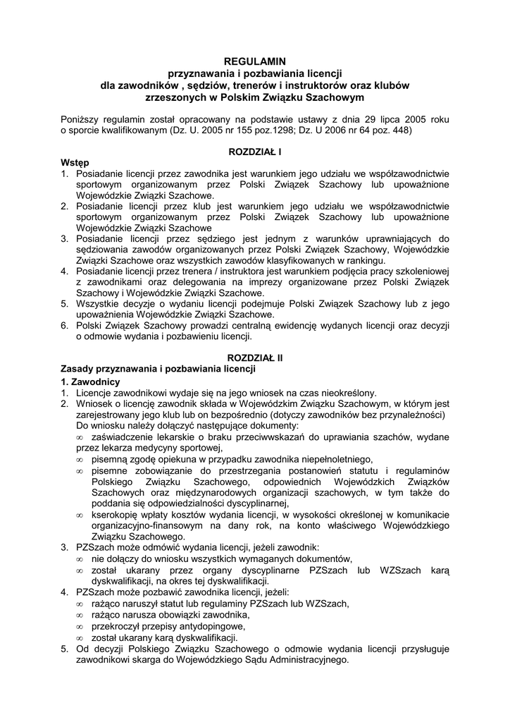 REGULAMIN przyznawania i pozbawiania licencji dla zawodników , sędziów, trenerów i instruktorów oraz klubów zrzeszonych w Polskim Związku Szachowym PoniŜszy regulamin został opracowany na podstawie ustawy z dnia 29 lipca 2005 roku o sporcie kwalifikowanym (Dz. U. 2005 nr 155 poz.1298; Dz. U 2006 nr 64 poz. 448) ROZDZIAŁ I Wstęp 1. Posiadanie licencji przez zawodnika jest warunkiem jego udziału we współzawodnictwie sportowym organizowanym przez Polski Związek Szachowy lub upowaŜnione Wojewódzkie Związki Szachowe. 2. Posiadanie licencji przez klub jest warunkiem jego udziału we współzawodnictwie sportowym organizowanym przez Polski Związek Szachowy lub upowaŜnione Wojewódzkie Związki Szachowe 3. Posiadanie licencji przez sędziego jest jednym z warunków uprawniających do sędziowania zawodów organizowanych przez Polski Związek Szachowy, Wojewódzkie Związki Szachowe oraz wszystkich zawodów klasyfikowanych w rankingu. 4. Posiadanie licencji przez trenera / instruktora jest warunkiem podjęcia pracy szkoleniowej z zawodnikami oraz delegowania na imprezy organizowane przez Polski Związek Szachowy i Wojewódzkie Związki Szachowe. 5. Wszystkie decyzje o wydaniu licencji podejmuje Polski Związek Szachowy lub z jego upowaŜnienia Wojewódzkie Związki Szachowe. 6. Polski Związek Szachowy prowadzi centralną ewidencję wydanych licencji oraz decyzji o odmowie wydania i pozbawieniu licencji. ROZDZIAŁ II Zasady przyznawania i pozbawiania licencji 1. Zawodnicy 1. Licencje zawodnikowi wydaje się na jego wniosek na czas nieokreślony. 2. Wniosek o licencję zawodnik składa w Wojewódzkim Związku Szachowym, w którym jest zarejestrowany jego klub lub on bezpośrednio (dotyczy zawodników bez przynaleŜności) Do wniosku naleŜy dołączyć następujące dokumenty: • zaświadczenie lekarskie o braku przeciwwskazań do uprawiania szachów, wydane przez lekarza medycyny sportowej, • pisemną zgodę opiekuna w przypadku zawodnika niepełnoletniego, • pisemne zobowiązanie do przestrzegania postanowień statutu i regulaminów Polskiego Związku Szachowego, odpowiednich Wojewódzkich Związków Szachowych oraz międzynarodowych organizacji szachowych, w tym takŜe do poddania się odpowiedzialności dyscyplinarnej, • kserokopię wpłaty kosztów wydania licencji, w wysokości określonej w komunikacie organizacyjno-finansowym na dany rok, na konto właściwego Wojewódzkiego Związku Szachowego. 3. PZSzach moŜe odmówić wydania licencji, jeŜeli zawodnik: • nie dołączy do wniosku wszystkich wymaganych dokumentów, • został ukarany przez organy dyscyplinarne PZSzach lub WZSzach karą dyskwalifikacji, na okres tej dyskwalifikacji. 4. PZSzach moŜe pozbawić zawodnika licencji, jeŜeli: • raŜąco naruszył statut lub regulaminy PZSzach lub WZSzach, • raŜąco narusza obowiązki zawodnika, • przekroczył przepisy antydopingowe, • został ukarany karą dyskwalifikacji. 5. Od decyzji Polskiego Związku Szachowego o odmowie wydania licencji przysługuje zawodnikowi skarga do Wojewódzkiego Sądu Administracyjnego. 2. Kluby 1. Licencje klubowi wydaje się na jego wniosek na okres jednego roku. 2. Wniosek o licencję klub składa w Wojewódzkim Związku Szachowym, w którym jest zarejestrowany. Do wniosku naleŜy dołączyć następujące dokumenty: • wyciąg z Krajowego Rejestru Sądowego lub innego rejestru właściwego dla formy organizacyjnej klubu, • odpis statutu lub umowy spółki w przypadku klubu działającego jako osoba prawna, • pisemne zobowiązanie do przestrzegania postanowień Statutu i regulaminów Polskiego Związku Szachowego, odpowiednich Wojewódzkich Związków Szachowych oraz międzynarodowych organizacji szachowych, w tym takŜe do poddania się odpowiedzialności dyscyplinarnej, • kserokopię wpłaty kosztów wydania licencji, w wysokości określonej w komunikacie organizacyjno-finansowym na dany rok, na konto właściwego wojewódzkiego związku szachowego. 3. PZSzach moŜe odmówić wydania licencji, jeŜeli klub: • nie dołączy do wniosku wszystkich wymaganych dokumentów, • został ukarany przez organy dyscyplinarne PZSzach lub WZSzach karą dyskwalifikacji, na okres tej dyskwalifikacji, • nie jest członkiem PZSzach i właściwego WZSzach, • nie zapłacił składek członkowskich do PZSzach i właściwego Wszach za rok poprzedni. 4. PZSzach moŜe pozbawić klub licencji, jeŜeli: • raŜąco naruszył statut lub regulaminy PZSzach lub WZSzach, • został ukarany karą dyskwalifikacji. 5. Od decyzji Polskiego Związku Szachowego o odmowie wydania licencji przysługuje klubowi skarga do Wojewódzkiego Sądu Administracyjnego. 6. Kluby zarejestrowane w PZSzach i właściwym WZSzach na dzień 31.12.2006 r. nie dołączają do wniosku wyciągu z KRS i odpisu statutu. 7. Kluby, które w danym roku posiadają licencję i mają opłacone składki za ten rok otrzymują licencję na kolejny rok automatycznie bez dodatkowych opłat. 3. Sędziowie 1. Licencje sędziemu wydaje się na jego wniosek na okres jednego roku. 2. Wniosek o licencję sędzia składa w Wojewódzkim Związku Szachowym, na którego terenie jest zameldowany lub, w którym jest zarejestrowany. Do wniosku naleŜy dołączyć następujące dokumenty: • kserokopię dokumentu potwierdzającego uprawnienia sędziowskie, • pisemne oświadczenie o posiadaniu pełnych zdolności do czynności prawnych i korzystaniu z pełni praw publicznych, • pisemne zobowiązanie do przestrzegania postanowień statutu i regulaminów Polskiego Związku Szachowego, odpowiednich Wojewódzkich Związków Szachowych oraz międzynarodowych organizacji szachowych, w tym takŜe do poddania się odpowiedzialności dyscyplinarnej, • kserokopię wpłaty składki, w wysokości określonej w komunikacie organizacyjnofinansowym na dany rok, na konto właściwego wojewódzkiego związku szachowego. 3. PZSzach moŜe odmówić wydania licencji, jeŜeli sędzia: • nie dołączy