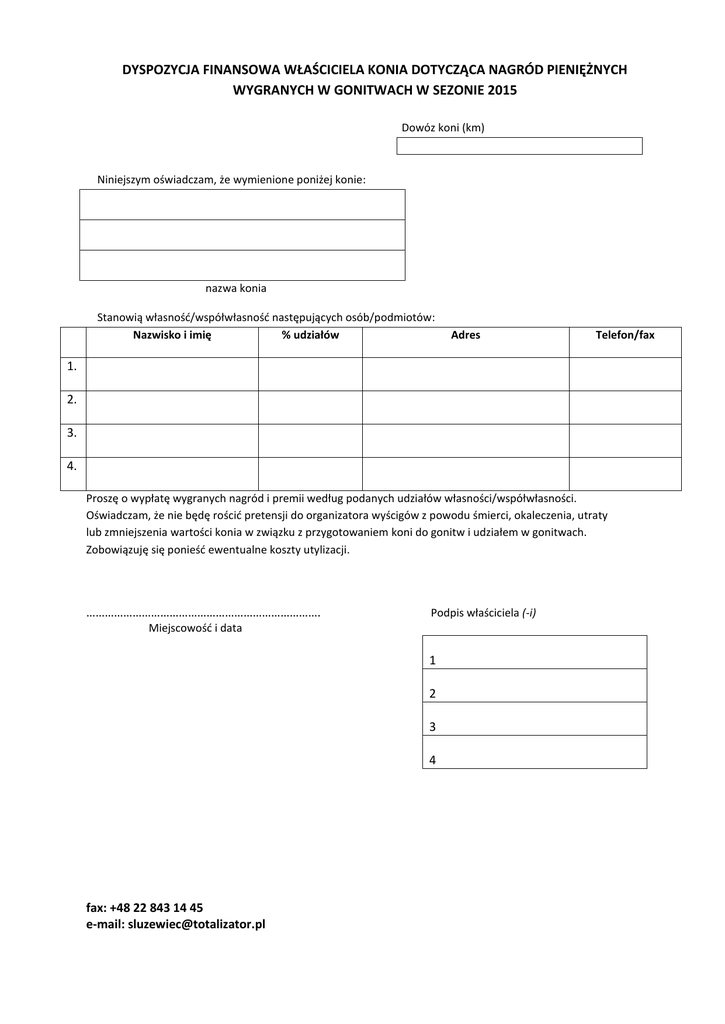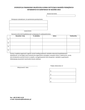DYSPOZYCJA FINANSOWA WŁAŚCICIELA KONIA DOTYCZĄCA NAGRÓD PIENIĘŻNYCH WYGRANYCH W GONITWACH W SEZONIE 2015 Dowóz koni (km) Niniejszym oświadczam, że wymienione poniżej konie: nazwa konia Stanowią własność/współwłasność następujących osób/podmiotów: Nazwisko i imię % udziałów Adres Telefon/fax 1. 2. 3. 4. Proszę o wypłatę wygranych nagród i premii według podanych udziałów własności/współwłasności. Oświadczam, że nie będę rościć pretensji do organizatora wyścigów z powodu śmierci, okaleczenia, utraty lub zmniejszenia wartości konia w związku z przygotowaniem koni do gonitw i udziałem w gonitwach. Zobowiązuję się ponieść ewentualne koszty utylizacji. …………………………………………………………………. Podpis właściciela (-i) Miejscowość i data 1 2 3 4 fax: +48 22 843 14 45 e-mail: [email protected] OŚWIADCZENIE WŁAŚCICIELA/TRENERA/HODOWCY/DŻOKEJA/ PRACOWNIKA OBSŁUGI STAJNI1 Nazwisko i imię/Nazwa ……………………………………………………………………………….............................. Adres zamieszkania/siedziba : województwo ……………………………………powiat………….………………………..……………………………………. miejscowość ……………………………………gmina………………………………………........................................ kod pocztowy …………………………….. poczta ………………………………………………………………………………. ulica ……………………………………………………………………………………….……………………………………………….. Adres do korespondencji 2 ……………………………………………………………………………………………….……………………………………………….. telefon kontaktowy ………………………………………………………………………….……………………………………… adres e-mail …………………………………………………………………………………............................................. PESEL ……..………………..…data urodzenia …………………..NIP…………………….………………………………….. Urząd skarbowy ……………………………………………………………………………….......................................... Ewentualne należności z tytułu udziału w wyścigach konnych w sezonie 2015 konia ………………………………………………….. proszę przekazywać na mój rachunek w Banku …………………………………………………………………………………………………………... Nr ………………………………………………………………………………………………………………………………………………………………………………… □ Oświadczam, że w 2015 roku prowadzę pozarolniczą działalność gospodarczą w zakresie chowu i hodowli koni. □ Prowadzę gospodarstwo rolne. Zgodnie z Ustawą z dnia 28.08.1997 r. „O ochronie danych osobowych” wyrażam zgodę na wykorzystanie i przetwarzanie moich danych osobowych, zawartych w niniejszym oświadczeniu na potrzeby rozliczenia ewentualnych wypłat z tytułu udziału w wyścigach konnych. …………………………………………………… Data i podpis osoby składającej oświadczenie 1 2 niepotrzebne skreślić wypełnić jeśli jest inny niż powyżej fax: +48 22 843 14 45 e-mail: [email protected]