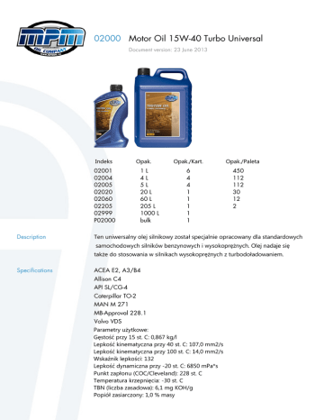 02000 Motor Oil 15W-40 Turbo Universal Document version: 23 June 2013 Indeks Opak. 02001 02004 02005 02020 02060 02205 02999 P02000 Description 1L 4L 5L 20 L 60 L 205 L 1000 L bulk Opak./Kart. 6 4 4 1 1 1 1 1 Opak./Paleta 450 112 112 30 12 2 Ten uniwersalny olej silnikowy został specjalnie opracowany dla standardowych samochodowych silników benzynowych i wysokoprężnych. Olej nadaje się także do stosowania w silnikach wysokoprężnych z turbodoładowaniem. Specifications ACEA E2, A3/B4 Allison C4 API SL/CG-4 Caterpillar TO-2 MAN M 271 MB-Approval 228.1 Volvo VDS Parametry użytkowe: Gęstość przy 15 st. C: 0,867 kg/l Lepkość kinematyczna przy 40 st. C: 107,0 mm2/s Lepkość kinematyczna przy 100 st. C: 14,0 mm2/s Wskaźnik lepkości: 132 Lepkość dynamiczna przy -20 st. C: 6850 mPa*s Punkt zapłonu (COC/Cleveland): 228 st. C Temperatura krzepnięcia: -30 st. C TBN (liczba zasadowa): 6,1 mg KOH/g Popiół zasiarczony: 1,0 % masy
