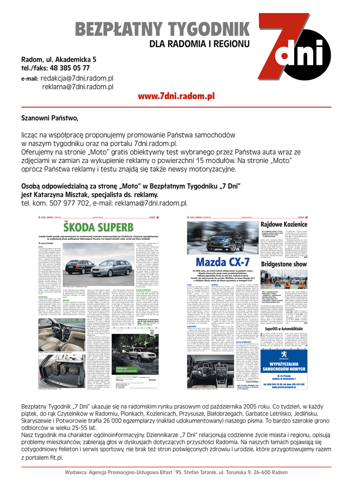 BEZPŁATNY TYGODNIK DLA RADOMIA I REGIONU Radom, ul. Akademicka 5 tel./faks: 48 385 05 77 e-mail: [email protected] [email protected] www.7dni.radom.pl Szanowni Państwo, licząc na współpracę proponujemy promowanie Państwa samochodów w naszym tygodniku oraz na portalu 7dni.radom.pl. Oferujemy na stronie „Moto” gratis obiektywny test wybranego przez Państwa auta wraz ze zdjęciami w zamian za wykupienie reklamy o powierzchni 15 modułów. Na stronie „Moto” oprócz Państwa reklamy i testu znajdą się także newsy motoryzacyjne. Osobą odpowiedzialną za stronę „Moto” w Bezpłatnym Tygodniku „7 Dni” jest Katarzyna Misztak, specjalista ds. reklamy. tel. kom. 507 977 702, e-mail: [email protected]. Bezpłatny Tygodnik „7 Dni” ukazuje się na radomskim rynku prasowym od października 2005 roku. Co tydzień, w każdy piątek, do rąk Czytelników w Radomiu, Pionkach, Kozienicach, Przysusze, Białobrzegach, Garbatce Letnisko, Jedlińsku, Skaryszewie i Potworowie trafia 26 000 egzemplarzy (nakład udokumentowany) naszego pisma. To bardzo szerokie grono odbiorców w wieku 25-55 lat. Nasz tygodnik ma charakter ogólnoinformacyjny. Dziennikarze „7 Dni” relacjonują codzienne życie miasta i regionu, opisują problemy mieszkańców, zabierają głos w dyskusjach dotyczących przyszłości Radomia. Na naszych łamach pojawiają się cotygodniowy felieton i serwis sportowy, nie brak też stron poświęconych zdrowiu i urodzie, które przygotowujemy razem z portalem fit.pl. Wydawca: Agencja Promocyjno-Usługowa Eltast `95, Stefan Tatarek, ul. Toruńska 9, 26-600 Radom