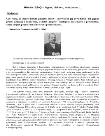 Historia Szkoły – bogata, ciekawa, mało znana… Odcinek 4. Czy wiesz, że budowniczym gmachu szkoły i pierwszym jej dyrektorem był gigant pracy: pedagog i naukowiec, wybitny geograf i kartograf, matematyk i przyrodnik, autor książek popularnonaukowych i podręczników… … Bronisław Gustawicz (1852 – 1916)? To człowiek niezwykły i równocześnie skromny, posiadający wszechstronną wiedzę. Dorobek jego życia jest imponujący! Był wybitnym geografem i kartografem, matematykiem, przyrodnikiem, etnologiem, autorem licznych podręczników szkolnych i książek popularnonaukowych dla młodzieży, publicystą i tłumaczem z języka niemieckiego. Był patriotą i społecznikiem. Oprócz zajęć i osiągnięć czysto naukowych bardzo dużo czasu poświęcał na liczne hobby, takie jak wędrówki górskie. Już od lat szkolnych często wyjeżdżał w góry, które przeszedł pieszo wzdłuż i wszerz, dokonując w wieku piętnastu lat pierwszych wejść na niezdobyte dotąd (1867r.) szczyty tatrzańskie: Świnicę, Granaty i Przełęcz Szparę. Jako miłośnik gór i przyrody był czynnym działaczem zarządu Towarzystwa Tatrzańskiego. Był też świetnym znawcą Pienin i autorem podstawowych publikacji o tym paśmie. Podczas studiów we Lwowie był stypendystą Rady Szkolnej Krajowej, dzięki czemu zwiedził Europę Zachodnią, Rosję i Egipt. Jest autorem bardzo wielu prac, artykułów, monografii, recenzji, map i atlasów, tłumaczeń i sprawozdań wydawanych we Lwowie, Krakowie, Warszawie, Wiedniu i w innych wydawnictwach zagranicznych także w języku niemieckim i francuskim (n.p.: Wycieczka w Czorsztyńskie Warszawa 1881, Zapiski florastyczne z powiatu bobreckiego, Kraków 1880, Wśród dolin i gór: przechadzki przyrodnicze ozdobione i objaśnione w tekście 13 tablicami barwnemi i 152 rycinami (współautor E. Wyrobek), Warszawa 1914, Z głębi wód – dwadzieścia obrazów z życia zwierząt niższych (współautor Emil Wyrobek),Warszawa 1914, Życie zwierząt. T. 3, Ptaki, cz. 2 (współautor Emil Wyrobek), Wiedeń 1912, Życie zwierząt. T. 4, Ptaki, cz. 3; Gady/płazy; Ryby, cz. 1 (współautor Emil Wyrobek), Berlin-Wiedeń ok. 1912, Życie zwierząt. T. 5, Ryby, cz. 2; Zwierzęta bezkręgowe (współautor Emil Wyrobek), Berlin-Wiedeń ok. 1912). Pozostawił po sobie liczne niepublikowane rękopisy, które znajdują się w Muzeum Etnograficznym w Krakowie oraz w archiwach rodziny spadkobierców autora. Jest to między innymi olbrzymi, ponad siedmiotysięczny zbiór tekstów piosenek ludowych, wzbogacony słownikiem wyrazów gwarowych oraz 600-stronicowe studium „O zwyczajach ludowych w Galicji” przeznaczone dla Krakowskiej Akademii Umiejętności, której był członkiem w Komisji Fizjograficznej i Antropologicznej. Najbardziej spektakularnym dokonaniem Bronisława Gustawicza był współudział w opracowaniu 15-tomowego „Słownika geograficznego Królestwa Polskiego i innych krajów słowiańskich” (wydawanego w Warszawie w latach 1880–1895, z uzupełnieniami w latach 1900, 1902) - monumentalnego dzieła i do dziś bardzo ważnego źródła wiadomości geograficznych i historycznych. W ciągu 25 lat oddawania kolejnych tomów opracował aż ponad 7000 większych i mniejszych haseł w tym między innymi orografię i hydrografię Galicji, Śląska i Bukowiny oraz topografię powiatów żywieckiego, nowotarskiego, myślenickiego, hrabstwa spiskiego, liptowskiego i orawskiego. Bronisław Marian Tadeusz Gustawicz urodził się 18.11.1852 w Krakowie. Uczył się w przyuniwersyteckim Gimnazjum Św. Anny (obecnie I LO im. B. Nowodworskiego), jednej z najstarszych istniejących i nieprzerwanie działających w Polsce szkół średnich. Studiował we Lwowie, wówczas mieście stołecznym Galicji, na wydziale inżynierii Akademii Technicznej. Po jej ukończeniu (z odznaczeniem) rozpoczął studia uzupełniające na wydziale filozoficznym Uniwersytetu Lwowskiego, zakończone zdaniem egzaminu na nauczyciela szkół realnych (gimnazjalnych) ze specjalizacją z matematyki i geografii. Już jako nauczyciel powrócił do Gimnazjum Św. Anny, gdzie był wychowawcą między innymi Stanisława Wyspiańskiego – na świadectwie dojrzałości wielkiego artysty znajduje się podpis B. Gustawicza (!). W roku 1904 podjął się jakże trudnej i odpowiedzialnej pracy zorganizowania od podstaw i prowadzenia Wyższej Szkoły Realnej w Żywcu - zadanie to wspaniale wykonał, z czego korzystały dotąd przez ponad wiek pokolenia Żywiecczyzny i będą to czynić nadal… . Był dyrektorem od czasu założenia szkoły w roku 1904, gdy lekcje odbywały się w kilku wynajmowanych pomieszczeniach [patrz odcinek 1. cyklu „Historia szkoły – bogata, ciekawa, mało znana…”], doprowadził do oddania do użytku naszego gmachu szkoły w roku 1911; pełnił tę funkcję do roku 1912. Niestety, Dyrektorowi Gustawiczowi nie było dane odczuć pełnej satysfakcji ze swojego dzieła, gdyż już przed pierwszą maturą w nowej szkole (1911) ze względów zdrowotnych (chorował na astmę) zmuszony był odejść najpierw na urlop zdrowotny, a potem – zgodnie z postanowieniem cesarza Franciszka Józefa przeniesiony został w stan spoczynku. Ponadto równocześnie w trakcie pobytu w Żywcu jako miłośnik gór przyczynił się do przeniesienia siedziby Oddziału Babiogórskiego PTTK z Makowa Podhalańskiego do Żywca i pełnił przez rok funkcję prezesa tego oddziału. Bronisław Gustawicz zmarł 9.10.1916 r. w Krakowie. Został pochowany na Cmentarzu Rakowickim. W hołdzie dla jego zasług przedstawiciele szkoły w czasie głównych uroczystości obchodów Jubileuszu 100 – lecia 24 września 2004 roku złożyli na jego grobie wieniec z szarfą i słowami podziękowania za jego zasługi wobec nas – instytucji i jej budynku. Szkoła utrzymuje kontakt z członkami rodziny Bronisława Gustawicza. W czasie 100-lecia w roku 2004 gościliśmy prawnuka dyrektora Gustawicza, p. Krzysztofa Wyrobk