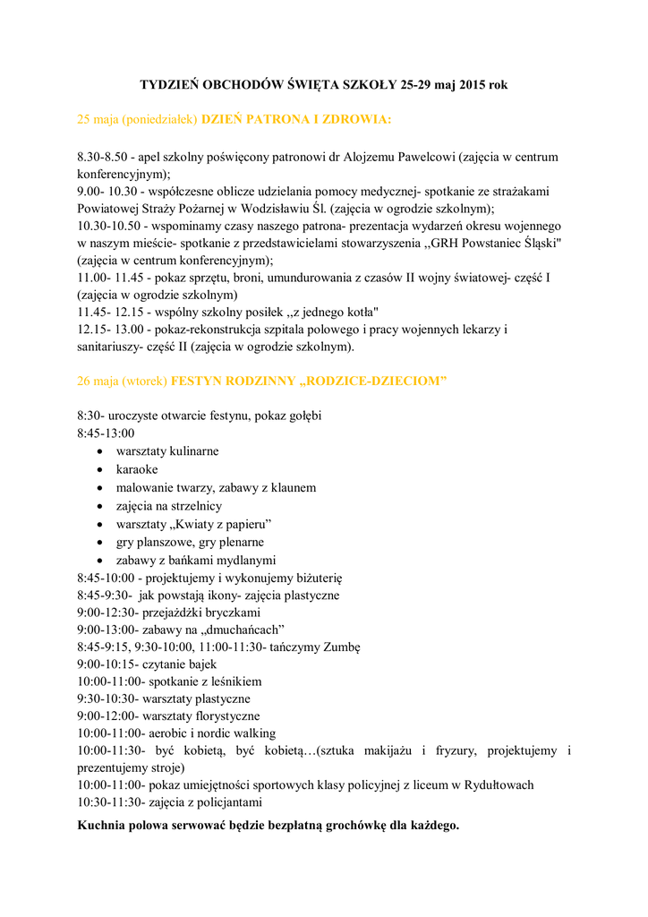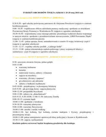 TYDZIEŃ OBCHODÓW ŚWIĘTA SZKOŁY 25-29 maj 2015 rok 25 maja (poniedziałek) DZIEŃ PATRONA I ZDROWIA: 8.30-8.50 - apel szkolny poświęcony patronowi dr Alojzemu Pawelcowi (zajęcia w centrum konferencyjnym); 9.00- 10.30 - współczesne oblicze udzielania pomocy medycznej- spotkanie ze strażakami Powiatowej Straży Pożarnej w Wodzisławiu Śl. (zajęcia w ogrodzie szkolnym); 10.30-10.50 - wspominamy czasy naszego patrona- prezentacja wydarzeń okresu wojennego w naszym mieście- spotkanie z przedstawicielami stowarzyszenia ,,GRH Powstaniec Śląski" (zajęcia w centrum konferencyjnym); 11.00- 11.45 - pokaz sprzętu, broni, umundurowania z czasów II wojny światowej- część I (zajęcia w ogrodzie szkolnym) 11.45- 12.15 - wspólny szkolny posiłek ,,z jednego kotła" 12.15- 13.00 - pokaz-rekonstrukcja szpitala polowego i pracy wojennych lekarzy i sanitariuszy- część II (zajęcia w ogrodzie szkolnym). 26 maja (wtorek) FESTYN RODZINNY „RODZICE-DZIECIOM” 8:30- uroczyste otwarcie festynu, pokaz gołębi 8:45-13:00 warsztaty kulinarne karaoke malowanie twarzy, zabawy z klaunem zajęcia na strzelnicy warsztaty „Kwiaty z papieru” gry planszowe, gry plenarne zabawy z bańkami mydlanymi 8:45-10:00 - projektujemy i wykonujemy biżuterię 8:45-9:30- jak powstają ikony- zajęcia plastyczne 9:00-12:30- przejażdżki bryczkami 9:00-13:00- zabawy na „dmuchańcach” 8:45-9:15, 9:30-10:00, 11:00-11:30- tańczymy Zumbę 9:00-10:15- czytanie bajek 10:00-11:00- spotkanie z leśnikiem 9:30-10:30- warsztaty plastyczne 9:00-12:00- warsztaty florystyczne 10:00-11:00- aerobic i nordic walking 10:00-11:30- być kobietą, być kobietą…(sztuka makijażu i fryzury, projektujemy i prezentujemy stroje) 10:00-11:00- pokaz umiejętności sportowych klasy policyjnej z liceum w Rydułtowach 10:30-11:30- zajęcia z policjantami Kuchnia polowa serwować będzie bezpłatną grochówkę dla każdego. 27 maja (środa) DZIEŃ NAUKI W WODZISŁAWSKIM CENTRUM KOPERNIK BIS „ Bogaty jest taki człowiek, dla którego świat jest nieustannym odkrywaniem”. Georges Duhamel 9.30-13.00- udział w pokazach, eksperymentach i doświadczeniach organizowanych przez pracowników Politechniki Śląskiej w Gliwicach, wydział Chemii, wydział Fizyki, wydział Elektryczny oraz GMDK Grupa Marketingowa Sp. z o.o. z Katowic (eksperymentatorium): 1. Strefa doświadczeń chemicznych: płonąca fala, lokomotywa, karmel z piekła rodem- czyli chemiczne pokazy i doświadczenia... 2. Strefa doświadczeń fizycznych: dotknąć, zobaczyć, zrozumieć czyli fizyczne poznawanie świata... 3. Warsztatownia chemiczna: czy wiemy co jemy, lek na zgagę, wulkany czyli poeksperymentujmy.. 4. Strefa wiedzy elektrycznej: roboty, robociki, robotki- czyli elektryczne dziwadła w służbie człowiekowi... 5. Kabina TIRA: zanim wyjedziesz na wycieczkę poznaj różne środki transportu... 6. W naukowej kawiarni: jak cukier zmienia swą postać, jak woda i śmietana zmieniają swój stan skupienia. Sprawdź to! 7. W ogniskowej restauracji: jak ognisko zmienia się w kuchenkę... Zajęcia odbywają się w czasie i miejscu wskazanym na bilecie grupowym. Bilety do odbioru przez wychowawcę klasy w dniu imprezy w Centrum Obsługi Klienta (holl szkoły). 27 maja (czwartek) USTALAMY REKORD POLSKI W TAŃCZENIU OSÓB NIEPEŁNOSPRAWNYCH, KONCERT ZESPOŁU WEEKEND 9.30-9.50 - warsztaty taneczne prowadzone przez tancerzy zespołu Weekend 9.50- 10.50 - koncert zespołu Weekend 10.50- 11.10 - ustanowienie rekordu Polski w tańczeniu przez osoby niepełnosprawne do piosenki pt. ,,Ona tańczy dla mnie" 11.10-12.00 - sesja zdjęciowa z zespołem Weekend, autografy, rozmowy Koncert odbywa się będzie w Wodzisławskim Centrum Kultury. 29 maja (piątek) KONCERT ,,DZIECI - RODZICOM" 9:30 - uroczyste rozpoczęcie koncertu 9:45- prezentacje artystyczne podopiecznych ZPSWR „W świecie barw”- spektakl muzyczno-ruchowy w wykonaniu uczniów z autyzmem „Na straganie”- integracyjny występ wychowanków Ośrodka RewalidacyjnoWychowawczego oraz uczniów Gimnazjum nr 3 w Wodzisławiu Śl. „Piosenka o Mamie”- występ Szymona Gajaka „Dla tych, którzy nas kochają”- taniec w wykonaniu uczniów zespołów edukacyjnoterapeutycznych ze szkoły podstawowej, gimnazjum i szkoły przysposabiającej do pracy „Mamo, tato, czy Ty wiesz…”- prezentacja multimedialna- Ośrodek RewalidacyjnoWychowawczy „Ding-Dong ”- występ taneczny 60 tancerzy- podopiecznych świetlicy szkolnej „Paweł i Gaweł po Ślonsku”- czyli Szkolny Kabaret uczniów, absolwentów i nauczycieli placówki „Jaba Jamba”- utwór na bębnach w wykonaniu nauczycieli placówki „To dzięki Wam”- prezentacja multimedialna uczniów klasy I, II, III szkoły podstawowej „In the mirror”- taniec uczniów I klasy szkoły przysposabiającej do pracy „Walc”- występ szkolnego zespołu „Wesołe nutki” w utworze wokalnoinstrumentalnym Warsztaty bębniarskie- pokaz umiejętności uczniów zespołów edukacyjnoterapeutycznych 11:30- zakończenie występów uczniów, powrót do szkoły. Koncert odbywa się będzie w Wodzisławskim Centrum Kultury.