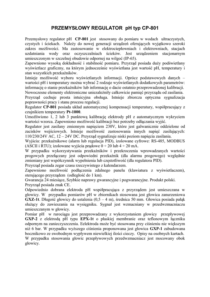 PRZEMYSŁOWY REGULATOR pH typ CP-801 Przemysłowy regulator pH CP-801 jest stosowany do pomiaru w wodach ultraczystych, czystych i ściekach. Należy do nowej generacji urządzeń oferujących wyjątkowo szeroki zakres możliwości. Ma zastosowanie w elektrociepłowniach i elektrowniach, stacjach uzdatniania wody oraz oczyszczalniach ścieków. Jest urządzeniem stacjonarnym umieszczonym w szczelnej obudowie odpornej na wilgoć (IP-65). Zapewniono wysoką dokładność i stabilność pomiaru. Przyrząd posiada duży podświetlany wyświetlacz graficzny, na którym jednocześnie wyświetlana jest wartość pH, temperatury i stan wszystkich przekaźników. Istnieje możliwość wyboru wyświetlanych informacji. Oprócz podstawowych danych – wartości pH i temperatury można wybrać 2 rodzaje wyświetlanych dodatkowych parametrów: informację o stanie przekaźników lub informację o dacie ostatnio przeprowadzonej kalibracji. Nowoczesne elementy elektroniczne uniezależniły całkowicie pamięć przyrządu od zasilania. Przyrząd cechuje prosta intuicyjna obsługa. Istnieje zbiorcza optyczna sygnalizacja poprawności pracy i stanu procesu regulacji. Regulator CP-801 posiada układ automatycznej kompensacji temperatury, współpracujący z czujnikiem temperatury Pt-1000. Umożliwiono 1, 2 lub 3 punktową kalibrację elektrody pH z automatycznym wykryciem wartości wzorca. Zapewniono możliwość kalibracji bez potrzeby odłączania wyjść. Regulator jest zasilany zmiennym napięciem 230V, które jest galwanicznie oddzielone od zacisków wejściowych. Istnieje możliwość zastosowania innych napięć zasilających: 110/230/24V AC, 12 – 24V DC. Przyrząd sygnalizuje niski poziom napięcia zasilania. Wyjścia: przekaźnikowe (alarm lub regulacja PID), izolowane cyfrowe: RS-485, MODBUS (ASCII i RTU); izolowane wyjścia prądowe 0 ÷ 20 lub 4 ÷ 20 mA. W przypadku wykorzystywania przekaźników i przekroczenia wprowadzanych wartości progowych przełączany jest odpowiedni przekaźnik (dla alarmu progowego) względnie zmieniany jest współczynnik wypełnienia lub częstotliwość (dla regulatora PID). Przyrząd posiada zegar czasu rzeczywistego z kalendarzem. Zapewniono możliwość podłączenia zdalnego panelu (klawiatura z wyświetlaczem), sterującego przyrządem (odległość do 1 km). Gwarancja 24 miesiące, Szybkie naprawy gwarancyjne i pogwarancyjne. Produkt polski. Przyrząd posiada znak CE. Odpowiednio dobrana elektroda pH współpracująca z przyrządem jest umieszczana w głowicy. W przypadku pomiarów pH w zbiornikach stosowana jest głowica zanurzeniowa GXZ-1t. Długość głowicy do ustalenia (0,5 – 4 m), średnica 50 mm. Głowica posiada pałąk służący do zawieszania na wysięgniku. Sygnał jest wzmacniany w przedwzmacniaczu umieszczanym w głowicy. Pomiar pH w rurociągu jest przeprowadzany z wykorzystaniem głowicy przepływowej GXP-2 z elektrodą pH typu EPX-1t o płaskiej membranie oraz teflonowym łączniku odpornym na zanieczyszczenia. Eelektroda może być stosowana przy ciśnieniu nie większym niż 6 bar. W przypadku wyższego ciśnienia proponowana jest głowica GXP-1 zabudowana bocznikowo ze swobodnym wypływem niewielkiej ilości cieczy. Opisy na osobnych kartach. W przypadku stosowania głowic przepływowych przedwzmacniacz jest mocowany obok głowicy. DANE TECHNICZNE Wartość mierzona: ...................................... pH, temperatura Zakres pH: ................................................................ 0 ÷ 14 pH Rozdzielczość / dokładność .................................... 0.01 pH / 0,02 pH Impedancja wejściowa: ............................................. 1012 W Zakres pomiaru temperatury: .................................... -50 ÷ 200 oC Uwaga: zakres pomiaru temperatury jest ograniczony do zakresu temperatury pracy elektrody pH. Kompensacja temperatury: ....................................... automatyczna Zakres kompensacji temperatury: ............................. -5 ÷ 130 oC Dokładność pomiaru temperatury przez przyrząd:..... 0.2 oC Kalibracja: ................................................................ 1,2 lub 3 punktowa Parametry przekaźników: ......................................... 5A/250VAC - 1P lub 5A/30VDC Wejście pomiarowe: ................................................. izolowane Wyjście na rejestrator pH: ......................................... izolowane prądowe 0÷20mA lub 4÷20mA Wyjście na rejestrator temperatury: ........................... izolowane prądowe 0÷20mA lub 4÷20mA Wyjście RS485: ..........................................................izolowane Maksymalna długość połączenia RS485: .................. 1000m Maksymalna długość kabla do przedwzmacniacza: .. 10m Zasilanie: ................................................................... 240 V 50Hz na zamówienie …..................................................... 170VAC÷250VAC, 24VDC/ 24 VAC Klasa izolacji: ............................................................ wg PN-83/T-06500 Zakłócenia radioelektryczne: .................................... poziom N Wymiary (szer. x wys. x dł.): .................................... 215 x 185 x 90 mm Masa regulatora / przedwzmacniacza .........................1350 g / 120g Parametry otoczenia: Temperatura otoczenia: ....................................... -20 do 40 oC Wilgotność względna / cisnienie atm:.................. maks. 80% / 80 do110 kPa Stopień agresywności atmosfery: ......................... N/2/AG-U/C 41-814 ZABRZE ul. W. Witosa 10 tel. 32 273 81 06, fax 32 273 81 14 [email protected] www.elmetron.pl