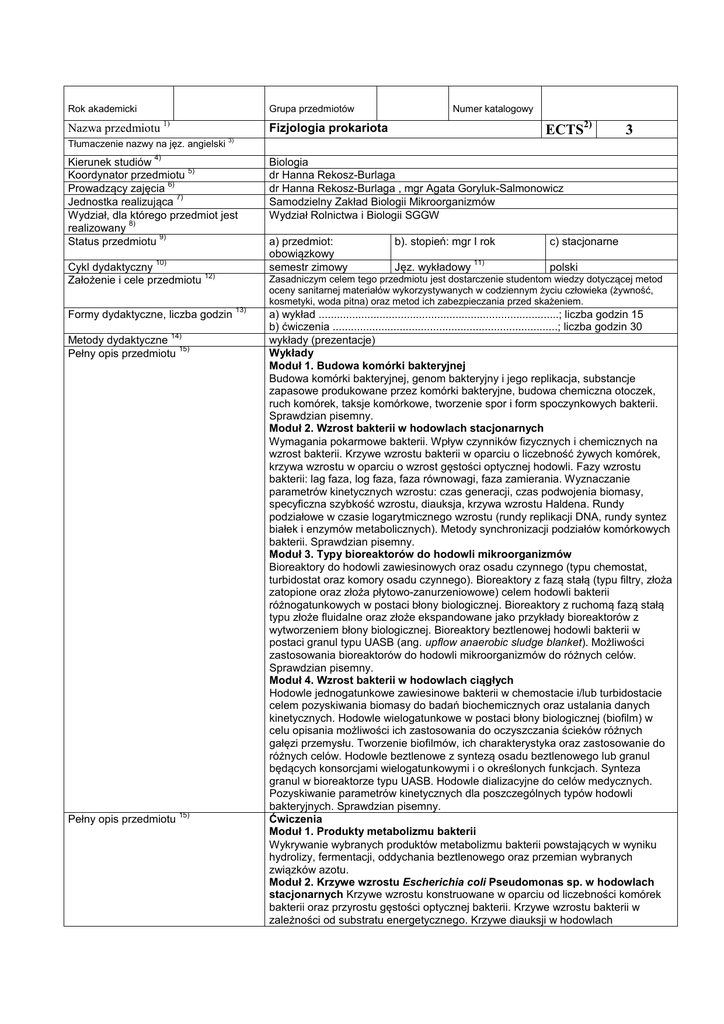 Rok akademicki Grupa przedmiotów Nazwa przedmiotu 1) Numer katalogowy ECTS2) Fizjologia prokariota Tłumaczenie nazwy na jęz. angielski 4) Kierunek studiów 5) Koordynator przedmiotu 6) Prowadzący zajęcia 7) Jednostka realizująca Wydział, dla którego przedmiot jest 8) realizowany 9) Status przedmiotu 10) Cykl dydaktyczny 12) Założenie i cele przedmiotu Formy dydaktyczne, liczba godzin 14) Metody dydaktyczne 15) Pełny opis przedmiotu Pełny opis przedmiotu 15) 3 3) Biologia dr Hanna Rekosz-Burlaga dr Hanna Rekosz-Burlaga , mgr Agata Goryluk-Salmonowicz Samodzielny Zakład Biologii Mikroorganizmów Wydział Rolnictwa i Biologii SGGW a) przedmiot: obowiązkowy semestr zimowy b). stopień: mgr I rok Jęz. wykładowy 11) c) stacjonarne polski Zasadniczym celem tego przedmiotu jest dostarczenie studentom wiedzy dotyczącej metod oceny sanitarnej materiałów wykorzystywanych w codziennym życiu człowieka (żywność, kosmetyki, woda pitna) oraz metod ich zabezpieczania przed skażeniem. 13) a) wykład ...............................................................................; liczba godzin 15 b) ćwiczenia ..........................................................................; liczba godzin 30 wykłady (prezentacje) Wykłady Moduł 1. Budowa komórki bakteryjnej Budowa komórki bakteryjnej, genom bakteryjny i jego replikacja, substancje zapasowe produkowane przez komórki bakteryjne, budowa chemiczna otoczek, ruch komórek, taksje komórkowe, tworzenie spor i form spoczynkowych bakterii. Sprawdzian pisemny. Moduł 2. Wzrost bakterii w hodowlach stacjonarnych Wymagania pokarmowe bakterii. Wpływ czynników fizycznych i chemicznych na wzrost bakterii. Krzywe wzrostu bakterii w oparciu o liczebność żywych komórek, krzywa wzrostu w oparciu o wzrost gęstości optycznej hodowli. Fazy wzrostu bakterii: lag faza, log faza, faza równowagi, faza zamierania. Wyznaczanie parametrów kinetycznych wzrostu: czas generacji, czas podwojenia biomasy, specyficzna szybkość wzrostu, diauksja, krzywa wzrostu Haldena. Rundy podziałowe w czasie logarytmicznego wzrostu (rundy replikacji DNA, rundy syntez białek i enzymów metabolicznych). Metody synchronizacji podziałów komórkowych bakterii. Sprawdzian pisemny. Moduł 3. Typy bioreaktorów do hodowli mikroorganizmów Bioreaktory do hodowli zawiesinowych oraz osadu czynnego (typu chemostat, turbidostat oraz komory osadu czynnego). Bioreaktory z fazą stałą (typu filtry, złoża zatopione oraz złoża płytowo-zanurzeniowowe) celem hodowli bakterii różnogatunkowych w postaci błony biologicznej. Bioreaktory z ruchomą fazą stałą typu złoże fluidalne oraz złoże ekspandowane jako przykłady bioreaktorów z wytworzeniem błony biologicznej. Bioreaktory beztlenowej hodowli bakterii w postaci granul typu UASB (ang. upflow anaerobic sludge blanket). Możliwości zastosowania bioreaktorów do hodowli mikroorganizmów do różnych celów. Sprawdzian pisemny. Moduł 4. Wzrost bakterii w hodowlach ciągłych Hodowle jednogatunkowe zawiesinowe bakterii w chemostacie i/lub turbidostacie celem pozyskiwania biomasy do badań biochemicznych oraz ustalania danych kinetycznych. Hodowle wielogatunkowe w postaci błony biologicznej (biofilm) w celu opisania możliwości ich zastosowania do oczyszczania ścieków różnych gałęzi przemysłu. Tworzenie biofilmów, ich charakterystyka oraz zastosowanie do różnych celów. Hodowle beztlenowe z syntezą osadu beztlenowego lub granul będących konsorcjami wielogatunkowymi i o określonych funkcjach. Synteza granul w bioreaktorze typu UASB. Hodowle dializacyjne do celów medycznych. Pozyskiwanie parametrów kinetycznych dla poszczególnych typów hodowli bakteryjnych. Sprawdzian pisemny. Ćwiczenia Moduł 1. Produkty metabolizmu bakterii Wykrywanie wybranych produktów metabolizmu bakterii powstających w wyniku hydrolizy, fermentacji, oddychania beztlenowego oraz przemian wybranych związków azotu. Moduł 2. Krzywe wzrostu Escherichia coli Pseudomonas sp. w hodowlach stacjonarnych Krzywe wzrostu konstruowane w oparciu od liczebności komórek bakterii oraz przyrostu gęstości optycznej bakterii. Krzywe wzrostu bakterii w zależności od substratu energetycznego. Krzywe diauksji w hodowlach jednogatunkowych stacjonarnych na podłożu z dwoma różnymi substratami organicznymi (glukoza i laktoza). Wyliczanie parametrów kinetycznych: czasu generacji, czasu podwojenia biomasy, specyficznej szybkości wzrostu. Moduł 3. Hodowle ciągłe osadu czynnego oraz bakterii denitryfikacyjnych Hodowle osadu czynnego w komorze osadu w warunkach tlenowych na ściekach syntetycznych. Obserwacje mikroskopowe osadu czynnego. Określanie liczebności bakterii w kłaczkach osadu czynnego oraz liczebności bakterii wolnopływających. Pozyskiwanie danych kinetycznych: określanie suchej masy bakterii, opadalności, określanie indeksu objętościowego osadu czynnego, określanie czasu zatrzymania ścieków, określanie chemicznego zapotrzebowania tlenu (ChZT) oraz utlenialności, wydajności oczyszczania ścieków. Hodowla bakterii denitryfikacyjnych w beztlenowym złożu zatopionym (ang. packed bed reactor). Określanie parametrów kinetycznych: czasu zatrzymania ścieków, redukcji azotanów, liczebności bakterii w odcieku pohodowlanym, zmiany pH w hodowli. mikrobiologia ogólna Wymagania formalne (przedmioty 16) wprowadzające) 17) Założenia wstępne 18) Efekty kształcenia Studenci powinni znać podstawowe pojęcia z zakresu mikrobiologii ogólnej 01- ma wiedzę o hodowlach stacjonarnych jednogatunkowych, fazach rozwoju hodowli, pozyskiwaniu danych kinetycznych rozwoju hodowli 02- wie o typach bioreaktorów do hodowli wielogatunkowych w zawiesinie, w postaci osadu czynnego, w postaci błony biologicznej oraz granul będących asocjacjami różnych gatunków bakterii 03- jest w stanie ocenić jakość oczyszczania ścieków w zależności od typu bioreaktora stosowanego do hodowli mikroorganizmów 04- posiada w
