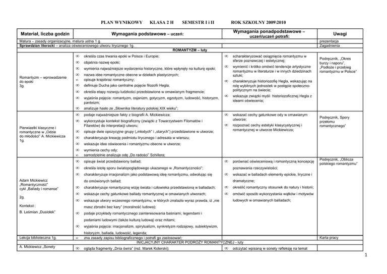 PLAN WYNIKOWY Materiał, liczba godzin KLASA 2 H SEMESTR I i II ROK SZKOLNY 2009\2010 Wymagania ponadpodstawowe – Wymagania podstawowe – uczeń: uczeń/uczeń potrafi: Matura – zasady organizacyjne, matura ustna 1 g. Sprawdzian literacki – analiza oświeceniowego utworu lirycznego 1g. Uwagi prezentacja Zagadnienia ROMANTYZM – luty Romantyzm – wprowadzenie do epoki 3g. Pierwiastki klasyczne i romantyczne w „Odzie do młodości” A. Mickiewicza 1g. • • • • określa czas trwania epoki w Polsce i Europie; • • • definiuje Ducha jako centralne pojęcie filozofii Hegla; • • • analizuje hasło ze „Słownika literatury polskiej XIX wieku”; • • • • • • • • • Adam Mickiewicz „Romantyczność” cykl „Ballady i romanse” 2g. wymienia najważniejsze wydarzenia historyczne, które wpłynęły na kulturę epoki; nazwa idee romantyczne obecne w dziełach plastycznych; opisuje krajobraz romantyczny; określa etapy rozwoju ludzkości przedstawione w omawianym fragmencie; wyjaśnia pojęcia: romantyzm, osjanizm, gotycyzm, egzotyzm, ludowość, historyzm, panteizm; • • • • podaje najważniejsze fakty z biografii A. Mickiewicza; • wykorzystuje kontekst biograficzny (związki z Towarzystwem Filomatów i Filaretów) do interpretacji utworu; • opisuje dwie opozycyjne grupy („młodych” i „starych”) przedstawione w utworze; • • • scharakteryzować osiągnięcia romantyzmu w sferze poznawczej i estetycznej; wymienić i krótko omówić tendencje artystyczne romantyzmu w literaturze i w innych dziedzinach sztuki; Podręcznik, „Okres burzy i naporu”, „Podłoże i przebieg romantyzmu w Polsce” charakteryzuje historiozofię Hegla, wskazując na rolę wybitnych jednostek w postępie społecznopolitycznym na świecie; wskazuje związki myśli historiozoficznej Hegla z ideami oświecenia; wskazać cechy gatunkowe ody w omawianym utworze; rozpoznać cechy estetyki klasycystycznej i romantycznej w utworze Mickiewicza; Podręcznik, Spory przełomu romantycznego” charakteryzuje kreację podmiotu lirycznego i adresata w wierszu; wskazuje idee oświecenia i romantyzmu obecne w utworze; wymienia cechy ody; samodzielnie analizuje odę „Do radości” Schillera; opisuje świat przedstawiony ballad; • określa istotę sporu światopoglądowego ukazanego w „Romantyczności”; charakteryzuje irracjonalizm jako podstawową ideę romantyzmu, odwołując się charakteryzuje romantyczną wizję świata i człowieka przedstawioną w balladach; wskazuje cechy gatunkowe ballady romantycznej w omawianych utworach; porównać oświeceniową i romantyczną koncepcję poznawania rzeczywistości; • Podręcznik, „Oblicza polskiego romantyzmu” wskazać w balladach elementy epickie, liryczne i dramatyczne; do omówionych ballad; Kontekst:: B. Leśmian „Dusiołek” objaśnia nazwę epoki; • • określić romantyczny stosunek do natury i historii; omówić sposób wykorzystania wątków i motywów ludowych w omawianych balladach; wskazuje utwory wczesnego romantyzmu, w których znalazła wyraz prawda, iż „nie masz zbrodni bez kary” (moralność ludowa); • podaje przykłady romantycznego zainteresowania baśniami, legendami i podaniami ludowymi (także kulturą ludową) oraz mitami; • wyjaśnia pojęcia: irracjonalizm, spirytualizm, synkretyzm rodzajowy, subiektywizm, Lekcja biblioteczna 1g. • historyzm, ballada, ludowość, legenda; zna zasady zapisu bibliograficznego i potrafi go zastosować; INICJACYJNY CHARAKTER PODRÓŻY ROMANTYCZNEJ - luty A. Mickiewicz „Sonety • ogląda fragmenty „Dnia świra” (reż. Marek Koterski); • Karta pracy odczytać wpisaną w sonety refleksję na temat 1 krymskie” 2g. Pejzaż wewnętrzny w lirykach lozańskich A. Mickiewicza 1g. J. Słowacki „Hymn” A. Kamieńska „Prośba” Obraz romantycznego pielgrzyma 2g. • • • • • • wykorzystuje kontekst biograficzny do interpretacji utworów; • • • • • • • • • • • • wyjaśnia pojęcia: orientalizm, instrumentacja głoskowa, liryka roli, koloryt lokalny; charakteryzuje bohatera lirycznego sonetów (Pielgrzyma); opisuje pejzaż Krymu ukazany w utworach; wskazuje podstawowe cechy gatunkowe sonetu; • • objaśnia, na czym polega romantyczne pojmowanie natury w sonetach; konfliktu między naturą i kulturą; wskazać przyczyny romantycznej fascynacji Orientem; Podręcznik, „Egzotyzm”, „Idea pielgrzymowania dla wolności” odwołując się do tradycji gatunku, objaśnić, w czym wyraża się nowatorstwo sonetów Mickiewicza; rozpoznaje najważniejsze środki stylistyczne służące budowaniu nastroju i kreacji obrazów poetyckich oraz wskazuje ich funkcje w utworach; opisuje krajobraz Lemanu, wykreowany w utworze; przedstawia relacje między przyrodą a światem człowieka; wskazuje i interpretuje symbole wykorzystane w wierszach; • • charakteryzuje kreację podmiotu lirycznego i adresata w wierszach; objaśnia, na czym polega kontemplacyjny charakter utworów; zbadać kształt wersyfikacyjny i stylistyczny wierszy; porównać kreację natury i sposób jej przedstawienia w lirykach lozańskich i wcześniejszych utworach poetyckich Mickiewicza („Ballady i romanse”, „Sonety krymskie”); Podręcznik, „Romantyczne motywy literackie” wyjaśnia pojęcia: lapidarność, kontemplacja, pejzaż mentalny, liryka pośrednia; charakteryzuje kreację podmiotu lirycznego i adresata w wierszu; określa sytuację liryczną i nastrój utworu; opisuje przeżycia i stan emocjonalny podmiotu lirycznego; • • wykorzystuje kontekst biograficzny do interpretacji utworu; porównać kreacje poety-pielgrzyma z wiersza Słowackiego i Stepów akermańskich Mickiewicza; Podręcznik, „Egzotyzm” porównać postawę podmiotu lirycznego wobec Boga w wierszach Słowackiego i Kamieńskiej; wyjaśnia pojęcia: homo viator, pielgrzym, hymn, liryka bezpośrednia, liryka wyznania, modlitwa poetycka; Sprawdzian – 