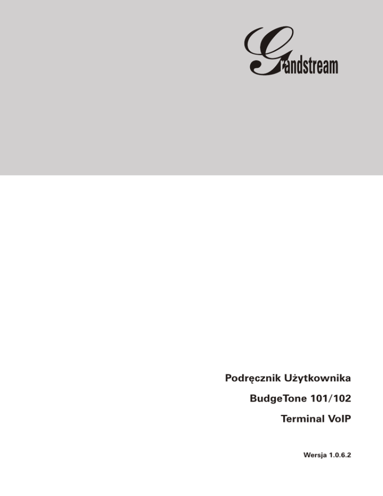 Podrêcznik U¿ytkownika BudgeTone 101/102 Terminal VoIP Wersja 1.0.6.2 Spis treœci SPIS TREŒCI 2 Wstêp 3 1. Zawartoœæ opakowania 3 2. Standardy bezpieczeñstwa 3 3. Mo¿liwoœci BT100 4 4. Instalacja 5 5. Jak u¿ywaæ BT100? 6 5.1. Wyœwietlacz LCD 6 5.2. Klawiatura 7 6. Podstawowe operacje 8 6.1. Wykonywanie po³¹czeñ 8 6.1.1 Bezpoœrednie po³¹czenie VoIP z wykorzystaniem IP 8 6.1.2 Przekazanie po³¹czenia 9 6.1.3 Po³¹czenia jednoczesne 9 6.2 Opcje po³¹czeñ 10 7. Konfiguracja 11 7.1 Konfiguracja przy u¿yciu klawiatury telefonu 11 7.2 Konfiguracja przy u¿yciu przegl¹darki Internetowej 14 7.2.1 Zapisywanie ustawieñ 15 7.2.2 Ponowne uruchamianie w trybie zdalnym 16 7.3. Konfiguracja przez Serwer Centralny 16 8. Aktualizacja oprogramowania 17 8.1 Aktualizacja przez TFTP 17 9. Przywracanie ustawieñ fabrycznych 18 Wstêp / Zawartoœæ opakowania / Standardy bezpieczeñstwa WSTÊP Witamy w gronie u¿ytkowników terminali Grandstream. Mamy nadziejê, i¿ nasz produkt w pe³ni spe³ni Twoje oczekiwania. Nasze wielokrotnie nagradzane urz¹dzenia pozwalaj¹ przesy³aæ Twój g³os przez Internet przy u¿yciu technologii VoIP. Grandstream to znakomita jakoœæ g³osu, bogata funkcjonalnoœæ oraz niezawodnoœæ. Telefon jest w pe³ni kompatybilny ze standardem SIP i wspó³pracuje z wiêkszoœci¹ urz¹dzeñ obs³uguj¹cych ten standard. Produkty marki GrandStream otrzyma³y wiele presti¿owych nagród na miêdzynarodowych wystawach. 1. ZAWARTOŒÆ OPAKOWANIA è Telefon VoIP è Zasilacz uniwersalny è Kabel Ethernet è Podrêcznik U¿ytkownika 2. STANDARDY BEZPIECZEÑSTWA Telefon jest zgodny z wieloma standardami bezpieczeñstwa w³¹czaj¹c FCC/CE oraz Ctick. Zasilacz jest zgodny ze standardem UL. Urz¹dzenie mo¿e pracowaæ tylko z oryginalnym zasilaczem. UWAGA: Prosimy o nie u¿ywanie innego zasilacza ni¿ za³¹czony w zestawie. U¿ywanie innego zasilacza mo¿e spowodowaæ uszkodzenia nieobjête gwarancj¹ producenta. 3 Mo¿liwoœci Telefonu UWAGA: Modyfikacje elementów zestawu nie zatwierdzone przez Grandstream, jak równie¿ u¿ywanie niezgodnie z poni¿sz¹ Instrukcj¹ U¿ytkownika powoduj¹ utratê gwarancji. 3. MO¯LIWOŒCI TELEFONU Obs³uga SIP 2.0, TCP/UDP/IP, RTP/RTCP, HTTP, ICMP, ARP/RARP, DNS, DHCP, NTP/SNTP, PPPoE, STUN, TFTP, NAT, itd. Zaawansowany procesor dŸwiêku (DSP) zapewniaj¹cy znakomit¹ jakoœæ dŸwiêku. Mechanizm anuluj¹cy straty powsta³e w skutek utraty pakietów wsparcie dla wielu kodeków, m.in.: G.711 (a-law i u-law), G.723.1 (5.3K/6.3K), G.726 (40K/32K/24K/16K), G.728, G.729A/B, iLBC. Prezentacja numeru rozmówcy, funkcje: HOLD, CALL WAITING/FLASH, CALL TRANSFER, CALL FORWARD, SIP INFO, in-band i out-band DTMF, Dial Plan. Funkcja g³oœno-mówi¹ca, ponowne wybieranie numeru, spis po³¹czeñ, kontola g³oœnoœci, poczta g³osowa, mo¿liwoœæ pobierania dzwonków. Wykrywanie g³osu/ciszy/szumów (Silence Suppression, Voice Activity Detection, Comfort Noise Generation). System anulowania echa G.168, system Automatic Gain Control. Obs³uguje standardowe metody kodowania i autoryzacji (DIGEST przy u¿yciu MD5 oraz MD5-sess). Obs³uga Layer 2 (802.1Q VLAN, 802.1p) oraz Layer 3 QoS (ToS, DiffServ, MPLS). Obs³uga automatycznej translacji adresów (NAT) bez rêcznego ustawiania firewalla/NAT. Automatyczna konfiguracja urz¹dzenia poprzez klawiaturê, przegl¹darkê WWW lub plik konfiguracyjny umieszczony na firmowym serwerze TFTP lub HTTP (pliki mog¹ byæ szyfrowane). 4 Instalacja 4. INSTALACJA (na przyk³adzie BT102) 3 BT 100 1 5 2 6 4 7 8 9 10 13 11 12 1. Wyœwietlacz LCD 2. Klawisz MENU 3. Ostatnio wybierane numery 4. Odebrane po³¹czenia 5. Klawisze przewijania 6. Wiadomoœci g³osowe 7. Klawisz HOLD 8. Klawisz przekazania rozmowy 9. Klawisz po³¹czenia konferencyjnego 10. Klawisz FLASH 11. Klawisz MUTE/DEL 12. Klawisz SEND/DIAL 13. Tryb g³oœno-mówi¹cy ZASILANIE KOMPUTER 5 INTERNET Jak u¿ywaæ BT100? 5. JAK U¯YWAÆ BT100? 5.1 Wyœwietlacz LCD Urz¹dzenie BT100 posiada numeryczny wyœwietlacz LCD o wymiarach 64x24mm. Poni¿szy rysunek przedstawia schemat wyœwietlacza. Status po³¹czenia sieciowego. Je¿eli: mruga - brak po³¹czenia sieciowego œwieci siê - serwer SIP zosta³ znaleziony nie œwieci siê - serwer SIP nie zosta³ znaleziony Status telefonu: œwieci siê - s³uchawka jest podniesiona nie œwieci siê - s³uchawka jest od³o¿ona prawid³owo Ikona g³oœnika. Je¿eli: mruga - telefon dzwoni lub sygnalizuje po³¹czenie œwieci siê - g³oœnik jest w³¹czony nie œwieci siê - g³oœnik jest wy³¹czony Alarm 6 Jak u¿ywaæ Bt100? Blokada klawiatury Kodowanie g³osu Poziom g³oœnoœci s³uchawki Zegar Znak separatora do adresu IP 5.2 7 KLAWIATURA Klawisz Opis ↓ Nastêpny poziom menu. Podczas rozmowy: zmniejsza g³oœnoœæ s³uchawki ↑ Poprzedni poziom menu. Podczas rozmowy: zwiêksza g³oœnoœæ s³uchawki MENU Wejœcie do menu urz¹dzenia/ENTER CALLED Wyœwietla ostatnio wybierane numery CALLERS Wyœwietla ostatnio odebrane po³¹czenia MESSAGE Wejœcie do poczty g³osowej HOLD Wstrzymanie rozmowy TRANSFER Przekazanie po³¹czenia na inny numer CONFERENCE Wejœcie do konferencji trójstronnej FLASH Prze³¹czenie miêdzy liniami MUTE/DEL Wycisza bie¿¹c¹ rozmowê. Kasuje ostatni wprowadzony znak, zapisany numer, nagranie na poczcie g³osowej, itp. Podstawowe operacje SEND/(RE)DIAL Wykonuje po³¹czenie lub wybiera ostatnio wybierany numer SPEAKERPHONE W³¹cza tryb g³oœno-mówi¹cy 6. PODSTAWOWE OPERACJE 6.1 Wykonywanie po³¹czeñ Aby wykonaæ po³¹czenie wprowadŸ numer na klawiaturze telefonu po czym wciœnij “SEND/REDIAL” lub poczekaj 4 sekundy. 6.1.1 Bezpoœrednie po³¹czenie VoIP z wykorzystaniem IP Bezpoœrednie po³¹czenie VoIP z wykorzystaniem adresu IP jest mo¿liwe w przypadku, gdy obydwa urz¹dzenia posiadaj¹ publiczny adres IP, s¹ w tej samej sieci lokalnej lub na routerze ustawiony jest port forwarding/DMZ. Aby wykonaæ po³¹czenie z wykorzystaniem adresu IP, podnieœ s³uchawkê 