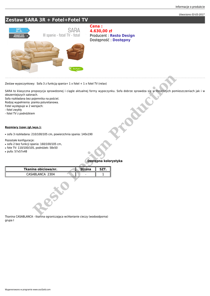 Informacje o produkcie Utworzono 03-03-2017 Zestaw SARA 3R + Fotel+Fotel TV Cena : 4.630,00 zł Pr od uc ti o Zestaw wypoczynkowy: Sofa 3 z funkcją spania+ 1 x fotel + 1 x fotel TV (relax) n Producent : Resto Design Dostępność : Dostępny SARA to klasyczna propozycja sprawdzonej i ciągle aktualnej formy wypoczynku. Sofa dobrze sprawdza się w mniejszych pomieszczeniach jak i w obszerniejszych salonach. Sofa rozkładana bez pojemnika na pościel. Rodzaj wypełnienia: pianka poluretanowa. Fotel występuje w 2 wersjach: - fotel zwykły - fotel TV z podnóżkiem Rozmiary (szer./gł./wys.): sofa 3 rozkładana: 210/100/105 cm, powierzchnia spania: 140x190 Pozostałe konfiguracje: sofa 2 bez funkcji spania: 160/100/105 cm, fote TV: 110/100/105, podnóżek: 58x50 pufa: 57x57x48 ● ● ● ig n ● Tkanina obiciowa/nr. Strona SZT. - 1 R es t o CASABLANCA 2304 D es Dostępna kolorystyka Tkanina CASABLANCA - tkanina ograniczająca wchłanianie cieczy (wodoodporna) grupa I Wygenerowano w programie www.oscGold.com n Pr od uc ti o nr. 2304 Czas realizacji zamówienia: z magazynu 3-5 dni Opcje dostawy:: Cennik dostawy ig n Model dostępny jest "od ręki" w wybranej kolorystyce obiciowej oraz określonej ilości. Po dokonaniu zakupu prosimy o podanie numeru i nazwy tkaniny. Oferta ważna do wyczerpania zapasów magazynowych. D es Dostępne opcje Zestaw SARA 3R + Fotel+Fotel TV R es t o » Tkanina obiciowa: CASABLANCA 2304.