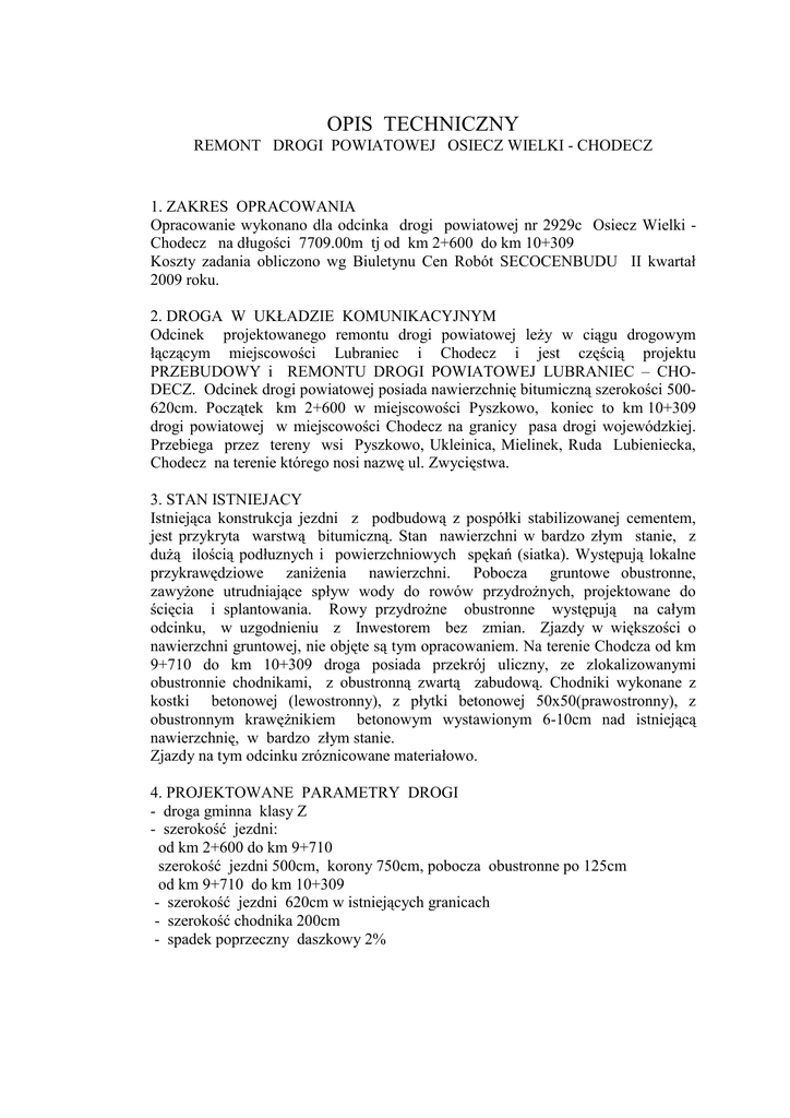 OPIS TECHNICZNY REMONT DROGI POWIATOWEJ OSIECZ WIELKI - CHODECZ 1. ZAKRES OPRACOWANIA Opracowanie wykonano dla odcinka drogi powiatowej nr 2929c Osiecz Wielki Chodecz na długości 7709.00m tj od km 2+600 do km 10+309 Koszty zadania obliczono wg Biuletynu Cen Robót SECOCENBUDU II kwartał 2009 roku. 2. DROGA W UKŁADZIE KOMUNIKACYJNYM Odcinek projektowanego remontu drogi powiatowej leŜy w ciągu drogowym łączącym miejscowości Lubraniec i Chodecz i jest częścią projektu PRZEBUDOWY i REMONTU DROGI POWIATOWEJ LUBRANIEC – CHODECZ. Odcinek drogi powiatowej posiada nawierzchnię bitumiczną szerokości 500620cm. Początek km 2+600 w miejscowości Pyszkowo, koniec to km 10+309 drogi powiatowej w miejscowości Chodecz na granicy pasa drogi wojewódzkiej. Przebiega przez tereny wsi Pyszkowo, Ukleinica, Mielinek, Ruda Lubieniecka, Chodecz na terenie którego nosi nazwę ul. Zwycięstwa. 3. STAN ISTNIEJACY Istniejąca konstrukcja jezdni z podbudową z pospółki stabilizowanej cementem, jest przykryta warstwą bitumiczną. Stan nawierzchni w bardzo złym stanie, z duŜą ilością podłuznych i powierzchniowych spękań (siatka). Występują lokalne przykrawędziowe zaniŜenia nawierzchni. Pobocza gruntowe obustronne, zawyŜone utrudniające spływ wody do rowów przydroŜnych, projektowane do ścięcia i splantowania. Rowy przydroŜne obustronne występują na całym odcinku, w uzgodnieniu z Inwestorem bez zmian. Zjazdy w większości o nawierzchni gruntowej, nie objęte są tym opracowaniem. Na terenie Chodcza od km 9+710 do km 10+309 droga posiada przekrój uliczny, ze zlokalizowanymi obustronnie chodnikami, z obustronną zwartą zabudową. Chodniki wykonane z kostki betonowej (lewostronny), z płytki betonowej 50x50(prawostronny), z obustronnym krawęŜnikiem betonowym wystawionym 6-10cm nad istniejącą nawierzchnię, w bardzo złym stanie. Zjazdy na tym odcinku zróznicowane materiałowo. 4. PROJEKTOWANE PARAMETRY DROGI - droga gminna klasy Z - szerokość jezdni: od km 2+600 do km 9+710 szerokość jezdni 500cm, korony 750cm, pobocza obustronne po 125cm od km 9+710 do km 10+309 - szerokość jezdni 620cm w istniejących granicach - szerokość chodnika 200cm - spadek poprzeczny daszkowy 2% odwodnienie powierzchniowe z wykorzystaniem odcinków kanalizacji deszczowej i istniejących wpustów ulicznych - prędkość projektowa 50 km/ godz. 5. PROJEKTOWANA KONSTRUKCJA DROGI zaprojektowano dwa typy konstrukcji : odcinek drogi od km 2+600 do km 9+710 -powierzchniowe utrwalenie grysami bazaltowymi 5-8mm na emulsji modyfikowanej - profilowanie istniejącej warstwy bitumicznej masą MMA w ilości 90 kg/m2 odcinek drogi od km 9+710 do km 10+309 - profilowanie masą MMA w ilości 90kg/m2 - warstwa ścieralna gr.5cm z BA c h o d n i k lewostronny na odcinku od km 9+715 do km 10+309 chodnik na tym odcinku naleŜy przełoŜyć - kostka betonowa szara gr.8cm - podsypka cem-piaskowa gr.3cm - warstwa odcinająca gr.5cm z piasku - profilowane, zagęszczone podłoŜe gruntowe c h o d n i k prawostronny na odcinku od km do km 10+309 - płytka betonowa 50x50cm z odzysku - podsypka cem-piaskowa gr.3cm - podsypka piaskowa gr.5cm - profilowane, zagęszczone podłoŜe gruntowe chodniki obramować od strony zewnętrznej obrzeŜem betonowym 8x30cm k r a w ę Ŝ n i k betonowy normalny 15x30cm - na zjazdach , przejściach dla pieszych, przy zatoce postojowej zaniŜony 15x25cm najazdowy odcinek lewostronny chodnika od km 9+828 do km 9+858 łącznie z dojściem do przejścia dla pieszych, wykonywany w czasie opracowywania dokumentacji łacznie z krawęŜnikiem jest wyłączony z opracowania krawęŜniki posadowić na ławie betonowej z betonu B-10, ławę betonową na podsypce piaskowej gr.5cm. PodłoŜe pod ławę krawęŜnikową wyprofilować i zagęśćić do wymaganych parametrów. z j a z d y, z a t o k a p o s t o j o w a - kostka betonowa szara gr.8cm typ STAROBRUK - podsypka cem-piaskowa gr.3cm - podbudowa gr. 17cm z betonu B-10, zdylatowana - warstwa odcinająca gr. 10cm z piasku - podłoŜe profilowane, zagęszczone. Projektowana konstrukcja ma za zadanie zabezpieczyć istniejącą nawierzchnię przyjętą jako podbudowa przed całkowitą degradacją, na odcinku miejskim wzmacniając konstrukcję, poprawiając równość, zwiększając stopień bezpieczeństwa jak i komfort jazdy uczestników ruchu. Wykonać oczyszczenia, skropienia miedzywarstwowe bitumem. 7. POBOCZA Istniejące pobocza gruntowe zawyŜone wymagają ścięcia i profilowania z nadaniem spadku 8% w kierunku rowu. Przyjęto szerokość ścięcia 150cm, przy szerokości pobocza 125cm, przy czym 25cm przeznaczono na ścięcie skarpy celem „zarysowania” krawędzi pobocza. Rowy pozostają bez zmian. 8. PORĘCZE STALOWE W miejscach niebezpiecznych, na wysokich nasypach zaprojektowano ustawienie poręczy stalowych SP-04 z przekładkami z następującą lokalizacją: - lewostronnie od km 6+220 do km 6+296 długości 19x4.00=76.00m w tym skrajne najazdowe - lewostronnie od km 7+640 do km 7+692 długości 13x4.00=52.00m w tym skrajne najazdowe - prawostronnie od km 8+555 do km 8+599 długości 11x4.00=44.00m w tym skrajne najazdowe - lewostronnie od km 8+690 do km 8+838 długości 37x4.00=148.00m w tym jedna skrajna najazdowa, istniejące Ŝelbetowe długości 21,00m naleŜy zdemontować. 9. ZJAZDY w związku z wbudowaniem nowych krawęŜników istnieje koniecznośc przebudowa przyległych elementów drogowych. I tak po stronie lewej zaprojektowano: - ustawienie nowego krawęŜnika betonowego 12x15x30cm na ławie betonowej - przebudowa przyległego chodnika z ponownym wbudowaniem kostki betonowej z rozbiórki - wykonanie wszystkich zjazdów z kostki betonowej gr.8cm typu STAROBRUK na szerokości chodnika - na skrzyŜowaniach z ulicami wykonać wcinki i ułoŜyć warstwę ścieralną gr.5cm po stronie prawej: - wbudować krawęŜnik j.w. na całej projektowanej długości z zaniŜeniami na zjazdach - zjazdy o nawierzchni gruntowej pozostają 