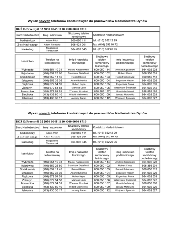 Wykaz nowych telefonów kontaktowych do pracowników Nadleśnictwa Dynów BGŻ O/Przemyśl 32 2030 0045 1110 0000 0090 8710 Biuro Nadleśnictwa Imię i nazwisko Nadleśniczy Adam Pilch Służbowy telefon komórkowy 600 050 111 Z-ca Nadl-czego Adam Tarabuła 606 421 001 fax. (016) 652 10 72 Marketing Magdalena Tereszczak 664 002 345 tel. (016) 652 26 95 Leśnictwo Telefon na leśniczówkę Imię i nazwisko leśniczego Wybrzeże Dąbrówka Szkółkarskie Dylągowa Piątkowa Żohatyn Borownica Siedliska Jabłonica (016) 651 10 31 (016) 652 25 60 (016) 652 11 45 (016) 652 35 05 (016) 672 54 59 (016) 672 54 58 (016) 672 54 51 (013) 439 80 10 (013) 430 30 17 Maciej Kaczorowski Stanisław Ostafiński Robert Bielec Adam Bubenko Hubert Kępa Mariusz Łach Wiesław Chrobak Witold Malinowski Jacenty Baran Kontakt z Nadleśnictwem tel. (016) 652 12 29 Służbowy telefon komórkowy leśniczego 600 050 114 600 050 102 600 050 103 600 050 104 600 050 105 600 050 106 600 050 107 600 050 109 600 050 112 Imię i nazwisko podleśniczego Andrzej Kędzierski Robert Ciuba Robert Sobkowicz Bogusław Hadam Eugeniusz Fuksa Władysław Świerczek Grześków Maciej Janusz Motowidło Wojciech Tymczak Służbowy telefon komórkowy podleśniczego 664 002 328 606 356 301 600 050 113 664 002 326 664 002 339 664 002 342 600 050 108 664 002 329 664 002 327 Wykaz nowych telefonów kontaktowych do pracowników Nadleśnictwa Dynów BGŻ O/Przemyśl 32 2030 0045 1110 0000 0090 8710 Biuro Nadleśnictwa Imię i nazwisko Nadleśniczy Adam Pilch Służbowy telefon komórkowy 600 050 111 Z-ca Nadl-czego Adam Tarabuła 606 421 001 fax. (016) 652 10 72 Marketing Magdalena Tereszczak 664 002 345 tel. (016) 652 26 95 Leśnictwo Telefon na leśniczówkę Imię i nazwisko leśniczego Wybrzeże Dąbrówka Szkółkarskie Dylągowa Piątkowa Żohatyn Borownica Siedliska Jabłonica (016) 651 10 31 (016) 652 25 60 (016) 652 11 45 (016) 652 35 05 (016) 672 54 59 (016) 672 54 58 (016) 672 54 51 (013) 439 80 10 (013) 430 30 17 Maciej Kaczorowski Stanisław Ostafiński Robert Bielec Adam Bubenko Huber Kępa Mariusz Łach Wiesław Chrobak Witold Malinowski Jacenty Baran Kontakt z Nadleśnictwem tel. (016) 652 12 29 Służbowy telefon komórkowy leśniczego 600 050 114 600 050 102 600 050 103 600 050 104 600 050 105 600 050 106 600 050 107 600 050 109 600 050 112 Imię i nazwisko podleśniczego Andrzej Kędzierski Robert Ciuba Robert Sobkowicz Bogusław Hadam Eugeniusz Fuksa Władysław Świerczek Grześków Maciej Janusz Motowidło Wojciech Tymczak Służbowy telefon komórkowy podleśniczego 664 002 328 606 356 301 600 050 113 664 002 326 664 002 339 664 002 342 600 050 108 664 002 329 664 002 327