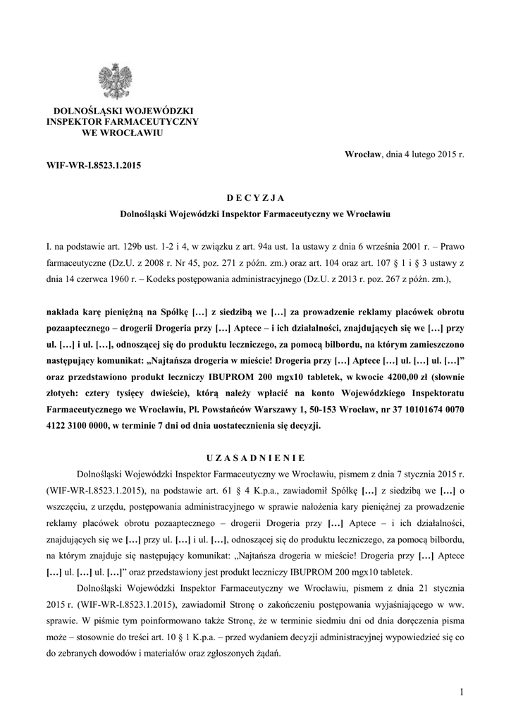 DOLNOŚLĄSKI WOJEWÓDZKI INSPEKTOR FARMACEUTYCZNY WE WROCŁAWIU Wrocław, dnia 4 lutego 2015 r. WIF-WR-I.8523.1.2015 DECYZJA Dolnośląski Wojewódzki Inspektor Farmaceutyczny we Wrocławiu I. na podstawie art. 129b ust. 1-2 i 4, w związku z art. 94a ust. 1a ustawy z dnia 6 września 2001 r. – Prawo farmaceutyczne (Dz.U. z 2008 r. Nr 45, poz. 271 z późn. zm.) oraz art. 104 oraz art. 107 § 1 i § 3 ustawy z dnia 14 czerwca 1960 r. – Kodeks postępowania administracyjnego (Dz.U. z 2013 r. poz. 267 z późn. zm.), nakłada karę pieniężną na Spółkę […] z siedzibą we […] za prowadzenie reklamy placówek obrotu pozaaptecznego – drogerii Drogeria przy […] Aptece – i ich działalności, znajdujących się we […] przy ul. […] i ul. […], odnoszącej się do produktu leczniczego, za pomocą bilbordu, na którym zamieszczono następujący komunikat: „Najtańsza drogeria w mieście! Drogeria przy […] Aptece […] ul. […] ul. […]” oraz przedstawiono produkt leczniczy IBUPROM 200 mgx10 tabletek, w kwocie 4200,00 zł (słownie złotych: cztery tysięcy dwieście), którą należy wpłacić na konto Wojewódzkiego Inspektoratu Farmaceutycznego we Wrocławiu, Pl. Powstańców Warszawy 1, 50-153 Wrocław, nr 37 10101674 0070 4122 3100 0000, w terminie 7 dni od dnia uostatecznienia się decyzji. UZASADNIENIE Dolnośląski Wojewódzki Inspektor Farmaceutyczny we Wrocławiu, pismem z dnia 7 stycznia 2015 r. (WIF-WR-I.8523.1.2015), na podstawie art. 61 § 4 K.p.a., zawiadomił Spółkę […] z siedzibą we […] o wszczęciu, z urzędu, postępowania administracyjnego w sprawie nałożenia kary pieniężnej za prowadzenie reklamy placówek obrotu pozaaptecznego – drogerii Drogeria przy […] Aptece – i ich działalności, znajdujących się we […] przy ul. […] i ul. […], odnoszącej się do produktu leczniczego, za pomocą bilbordu, na którym znajduje się następujący komunikat: „Najtańsza drogeria w mieście! Drogeria przy […] Aptece […] ul. […] ul. […]” oraz przedstawiony jest produkt leczniczy IBUPROM 200 mgx10 tabletek. Dolnośląski Wojewódzki Inspektor Farmaceutyczny we Wrocławiu, pismem z dnia 21 stycznia 2015 r. (WIF-WR-I.8523.1.2015), zawiadomił Stronę o zakończeniu postępowania wyjaśniającego w ww. sprawie. W piśmie tym poinformowano także Stronę, że w terminie siedmiu dni od dnia doręczenia pisma może – stosownie do treści art. 10 § 1 K.p.a. – przed wydaniem decyzji administracyjnej wypowiedzieć się co do zebranych dowodów i materiałów oraz zgłoszonych żądań. 1 Strona nie skorzystała z ww. możliwości czynnego udziału w prowadzonym postępowaniu administracyjnym przed wydaniem niniejszej decyzji. Dolnośląski Wojewódzki Inspektor Farmaceutyczny we Wrocławiu zważył, co następuje: Zgodnie z art. 94a ust. 1a Prawa farmaceutycznego, zabroniona jest reklama placówek obrotu pozaaptecznego i ich działalności odnosząca się do produktów leczniczych lub wyrobów medycznych. Wojewódzki inspektor farmaceutyczny sprawuje nadzór nad przestrzeganiem przepisów ustawy w zakresie działalności reklamowej aptek, punktów aptecznych i placówek obrotu pozaaptecznego (art. 94a ust. 2 Prawa farmaceutycznego). W razie stwierdzenia naruszenia przepisu ust. 1 lub 1a wojewódzki inspektor farmaceutyczny nakazuje, w drodze decyzji, zaprzestanie prowadzenia takiej reklamy (art. 94a ust. 3 Prawa farmaceutycznego). Zgodnie z art. 71 ust. 1 Prawa farmaceutycznego, poza aptekami i punktami aptecznymi obrót detaliczny produktami leczniczymi wydawanymi bez przepisu lekarza, z wyłączeniem produktów leczniczych weterynaryjnych, mogą prowadzić: 1) sklepy zielarsko-medyczne, 2) sklepy specjalistyczne zaopatrzenia medycznego, 3) sklepy ogólnodostępne – zwane dalej „placówkami obrotu pozaaptecznego”. Ww. drogerie są placówkami obrotu pozaptecznego w rozumieniu art. 71 ust. 1 Prawa farmaceutycznego. Produktem leczniczym jest substancja lub mieszanina substancji, przedstawiana jako posiadająca właściwości zapobiegania lub leczenia chorób występujących u ludzi lub zwierząt lub podawana w celu postawienia diagnozy lub w celu przywrócenia, poprawienia lub modyfikacji fizjologicznych funkcji organizmu poprzez działanie farmakologiczne, immunologiczne lub metaboliczne (art. 2 pkt 32 Prawa farmaceutycznego). Zgodnie z art. 2a ust. 1 Prawa farmaceutycznego, ilekroć w tej ustawie jest mowa o wyrobie medycznym, rozumie się przez to wyrób medyczny, wyrób medyczny do diagnostyki in vitro, wyposażenie wyrobu medycznego, wyposażenie wyrobu medycznego do diagnostyki in vitro oraz aktywny wyrób medyczny do implantacji, w rozumieniu przepisów ustawy z dnia 20 maja 2010 r. o wyrobach medycznych (Dz.U. Nr 107, poz. 679 z późn. zm.), chyba że przepisy tej ustawy stanowią inaczej. W tym miejscu wskazać należy, że produkt IBUPROM 200mgx10 tabletek jest produktem leczniczym w ww. rozumieniu dopuszczonym do obrotu w placówkach obrotu pozaaptecznego (zob. rozporządzenie Ministra Zdrowia z dnia 2 lutego 2009 r. w sprawie kryteriów klasyfikacji produktów leczniczych, które mogą być dopuszczone do obrotu w placówkach obrotu pozaaptecznego oraz punktach aptecznych; Dz. U. Nr 24, poz. 151 z późn. zm.; i rozporządzenie Ministra Zdrowia z dnia 22 października 2010 r. w sprawie wykazu produktów leczniczych, które mogą być dopuszczone do obrotu w placówkach obrotu pozaaptecznego oraz punktach aptecznych; Dz. U. Nr 204, poz. 1353). Spostrzec trzeba, że w prawie farmaceutycznym brak jest definicji reklamy placówki obrotu pozaaptecznego i ich działalności. 2 Posiłkując się definicjami reklamy zawartymi w publikacjach słownikowych wskazać trzeba, że za reklamę uważa się każde działanie mające na celu zachęcenie potencjalnych klientów do zakupu konkretnych towarów lub do skorzystania z określonych usług (np. Wielki Słownik Wyrazów Obcych, pod red M. Bańki, wyd. PWN, Warszawa 2003)