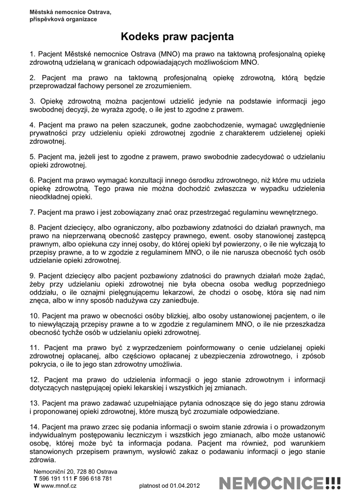 Městská nemocnice Ostrava, příspěvková organizace Kodeks praw pacjenta 1. Pacjent Městské nemocnice Ostrava (MNO) ma prawo na taktowną profesjonalną opiekę zdrowotną udzielaną w granicach odpowiadających możliwościom MNO. 2. Pacjent ma prawo na taktowną profesjonalną opiekę zdrowotną, ktόrą będzie przeprowadzał fachowy personel ze zrozumieniem. 3. Opiekę zdrowotną można pacjentowi udzielić jedynie na podstawie informacji jego swobodnej decyzji, że wyraża zgodę, o ile jest to zgodne z prawem. 4. Pacjent ma prawo na pełen szaczunek, godne zaobchodzenie, wymagać uwzględnienie prywatności przy udzieleniu opieki zdrowotnej zgodnie z charakterem udzielenej opieki zdrowotnej. 5. Pacjent ma, jeżeli jest to zgodne z prawem, prawo swobodnie zadecydować o udzielaniu opieki zdrowotnej. 6. Pacjent ma prawo wymagać konzultacji innego όsrodku zdrowotnego, niż ktόre mu udziela opiekę zdrowotną. Tego prawa nie można dochodzić zwłaszcza w wypadku udzielenia nieodkładnej opieki. 7. Pacjent ma prawo i jest zobowiązany znać oraz przestrzegać regulaminu wewnętrznego. 8. Pacjent dziecięcy, albo ograniczony, albo pozbawiony zdatności do działań prawnych, ma prawo na nieprzerwaną obecność zastępcy prawnego, ewent. osoby stanowionej zastępcą prawnym, albo opiekuna czy innej osoby, do ktόrej opieki był powierzony, o ile nie wyłczają to przepisy prawne, a to w zgodzie z regulaminem MNO, o ile nie narusza obecność tych osόb udzielanie opieki zdrowotnej. 9. Pacjent dziecięcy albo pacjent pozbawiony zdatności do prawnych działań może żądać, żeby przy udzielaniu opieki zdrowotnej nie była obecna osoba według poprzedniego oddziału, o ile oznajmi pielęgnującemu lekarzowi, że chodzi o osobę, która się nad nim znęca, albo w inny sposób nadużywa czy zaniedbuje. 10. Pacjent ma prawo w obecności osóby blizkiej, albo osoby ustanowionej pacjentem, o ile to niewyłączają przepisy prawne a to w zgodzie z regulaminem MNO, o ile nie przeszkadza obecność tychže osόb w udzielaniu opieki zdrowotnej. 11. Pacjent ma prawo być z wyprzedzeniem poinformowany o cenie udzielanej opieki zdrowotnej opłacanej, albo częściowo opłacanej z ubezpieczenia zdrowotnego, i zpósob pokrycia, o ile to jego stan zdrowotny umożliwia. 12. Pacjent ma prawo do udzielenia informacji o jego stanie zdrowotnym i informacji dotyczących następującej opieki lekarskiej i wszystkich jej zmianach. 13. Pacjent ma prawo zadawać uzupełniające pytania odnoszące się do jego stanu zdrowia i proponowanej opieki zdrowotnej, które muszą być zrozumiale odpowiedziane. 14. Pacjent ma prawo zrzec się podania informacji o swoim stanie zdrowia i o prowadzonym indywidualnym postępowaniu leczniczym i wszstkich jego zmianach, albo może ustanowić osobę, której może być ta informacja podana. Pacjent ma również, pod warunkiem stanowionych przepisem prawnym, wysłowić zakaz o podawaniu informacji o jego stanie zdrowia. Nemocniční 20, 728 80 Ostrava T 596 191 111 F 596 618 781 W www.mnof.cz platnost od 01.04.2012 Městská nemocnice Ostrava, příspěvková organizace 15. Pacjent ma prawo zajrzeć i wykonywać sobie wypisy albo kopie z dokumentacji zdrowotnej, która jest o nim prowadzona w MNO i to w terminach i za warunków stanowionych przepisami prawnymi. Pacjent jest również upoważniony ustanowić osoby, które będą miały prawo zajrzeć, wykonywać wypisy albo kopie z dokumentacji zdrowotnej prowadzonej o pacjentowi w MNO. 16. Pacjent ma prawo pod warunkami ustanowionymi przepisami prawnymi wysłowić zgodę albo niezgodę z udzieleniem opieki zdrowotnej i sposób jej udzielenia w wypadku jeśli nastanie taki stan zdrowia, w ktόrym nie będzie zdolny zgodę albo niezgodę z wyprzedzeniem wysłowić. 17. Pacjent ma prawo znać imię albo imiona i nazwiska personelu zdrowotnego i innych pracowników fachowych biorących udział w udzielaniu opieki zdrowotnej i osόb, które się przygotowywują w MNO do wykonywania powołania w opiece zdrowotnej, które są przy udzielaniu opieki obecne, albo prowadzą działalność, która jest w związku z nauczaniem. 18. Pacjent ma prawo odmówić obecność osob, które nie biorą wprost udział w udzielaniu opieki zdrawotnej i osób przygotowywujących się do stanu wykonywania pracownika zdrowotnego. 19. Pacjent ma prawo oczekiwać, że wszelkie informacje dotyczące jego leczenią są uważane za poufne. Ochrona informacji o pacjentowi musi być zapewniona i w wypadku ich komputerowego opracowania. 20. Pacjent może w ramach prawa przyjmować wizity a to z uwzględnieniem jego stanu zdrowia w zgodności z regulaminem MNO i sposobom nie naruszjącym prawa innych pacjentów. 21. Pacjent może w ramach prawa przyjmować opiekę duszpasterską i wsparcie duchowe od duchownych kościołów o spoleczeństw religyjnych zarejestrowanych w R Cz albo osoby akredytowane do wykonywania działalności duchownej a to zgodnie z regulaminem MNO i w sposób nie naruszjący prawa innych pacjentów i z uwzględnieniem włastnego stanu zdrowia. 22. Pacjent ma prawo na udzielanie opieki zdrowotnej w co najmniej ograniczającym środowisku, przy zapewnieniu fachowości i bezpieczeństwa udzielanej opieki zdrowotnej. 23. Pacjent ograniczony umysłowo albo z ciężkimi prob lemami komunikacyjnymi powodowanymi z przyczyn zdrowotnych ma przy komunikacji w związku z udzelaniem opieki prawo się dorozumiewać w sposób dla niego zrozumiały i środkami dla niego zrozumiałymi, które sovie sam wybierze włącznie z sposobem na podstave tłumaczenia osobą drugą. 24. Pacjent upośledzony umysłowo albo cieleśnie, który używa psa specjalnie ćwiczonego (pies asystujący), póki nie wykluczają to przepisy prawne, ma prawo ze względu na aktualny stan zdrowia, na obecność psa przy sobie w MNO a to w sposób ustanowiony regulaminem MNO tak, żeby nie naruszać prawa innych pacjentów. 25. Pacjent ma również prawo, o ile nie wykluczają to